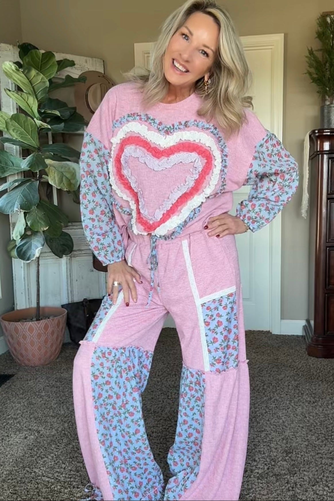 Perfect for lounging, casual days out, or wearing as a matching set, this top pairs perfectly with the coordinating patchwork pants for a look that’s equal parts comfy and cute. A feel-good piece you’ll love reaching for again and again.