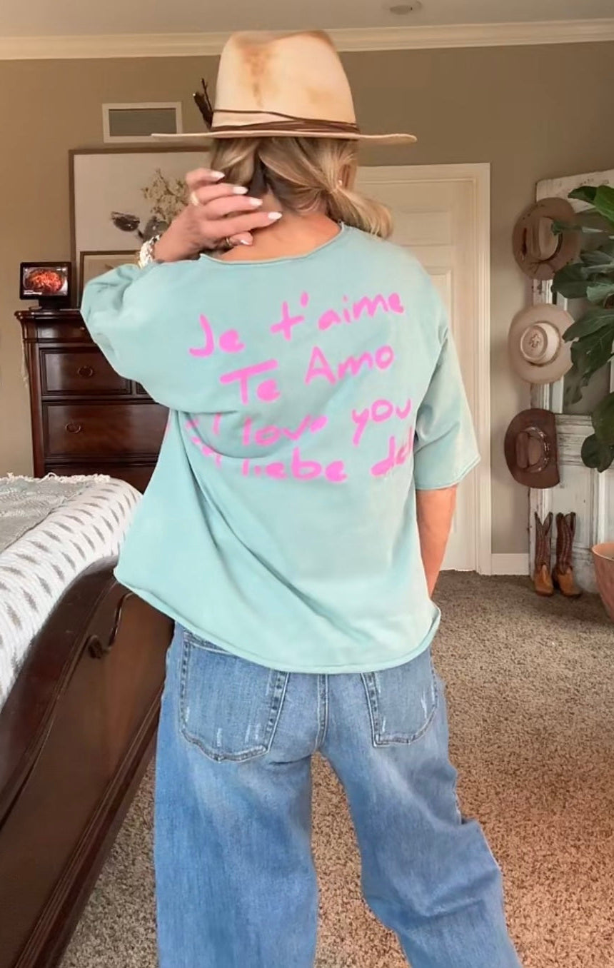 Introducing the Love Is All You Need Cotton Top by Davi & Dani! Say it in every language. This relaxed graphic tee features a soft washed sage tone with bold “LOVE” lettering across the front and a playful message on the back that reads Je t’aime, Te Amo, I Love You, Ich liebe dich. Designed with a relaxed fit and soft feel, it’s an easy everyday tee that pairs perfectly with denim, lounge pants, or layered under a jacket.