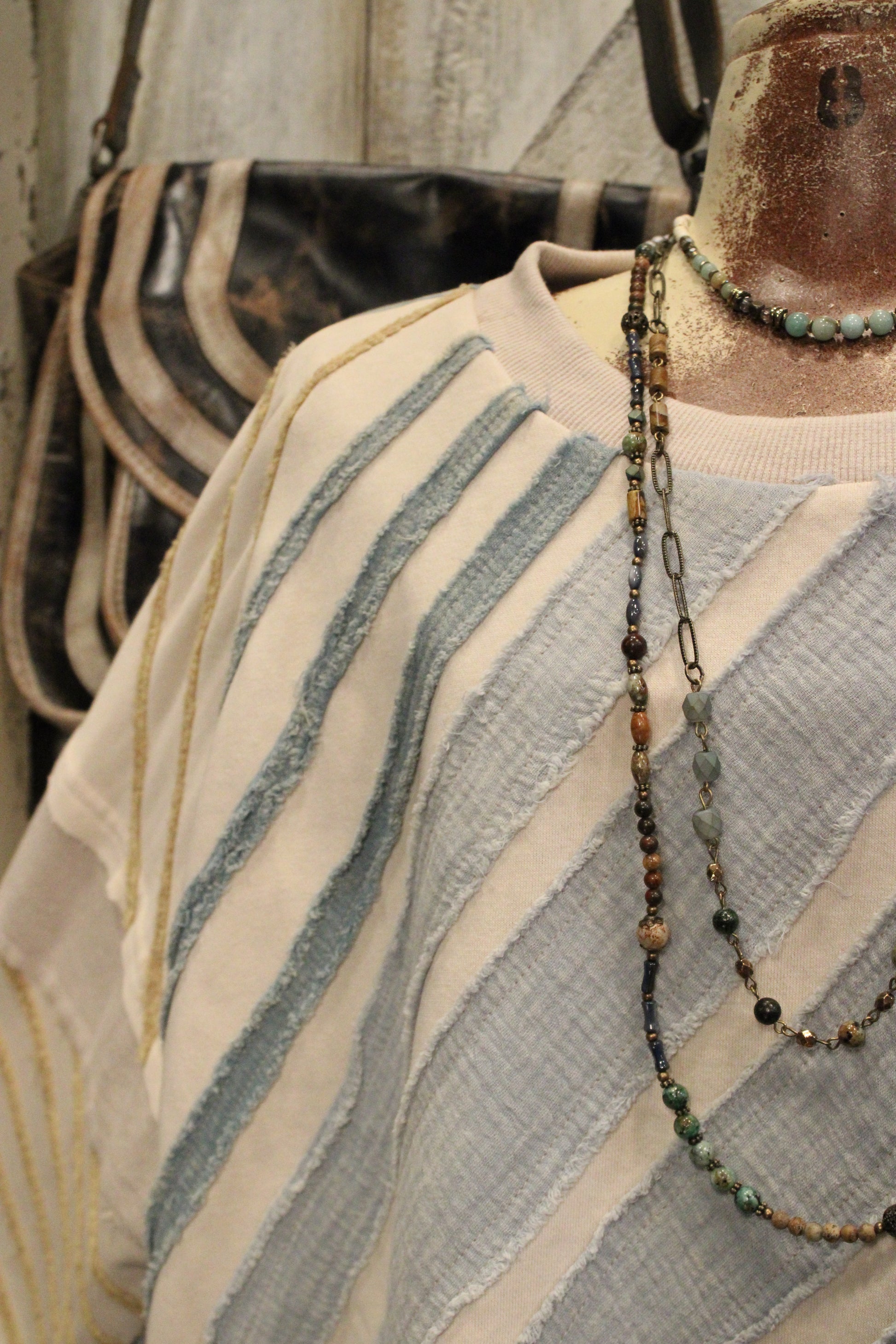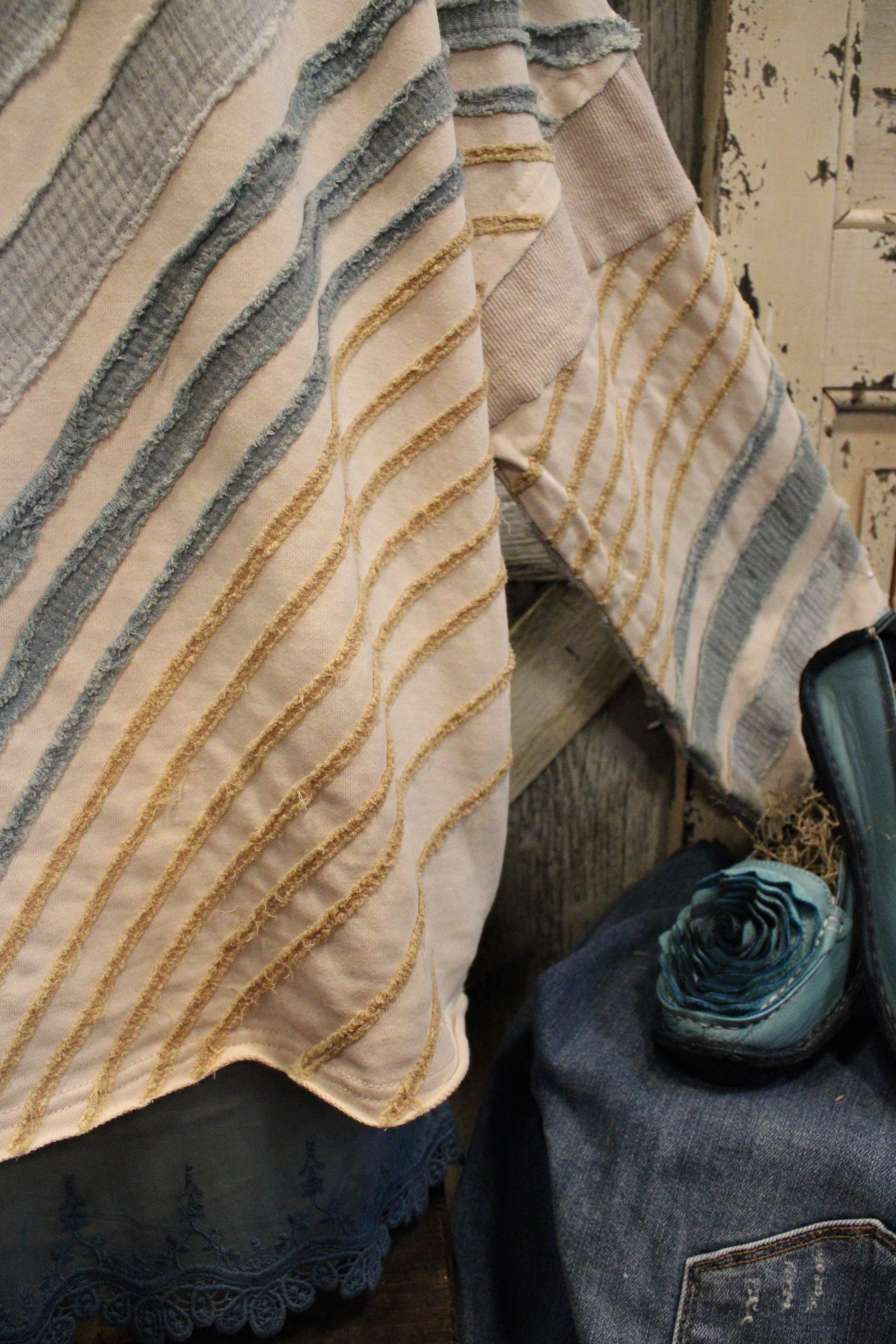 Introducing the Love Letter Casual Top- Meet your new feel-good, throw-on-and-go favorite! This sweet casual top brings together soft cream tones, textured blue and gold striping, and the cutest appliqué details for that perfectly relaxed Farm Girls charm.