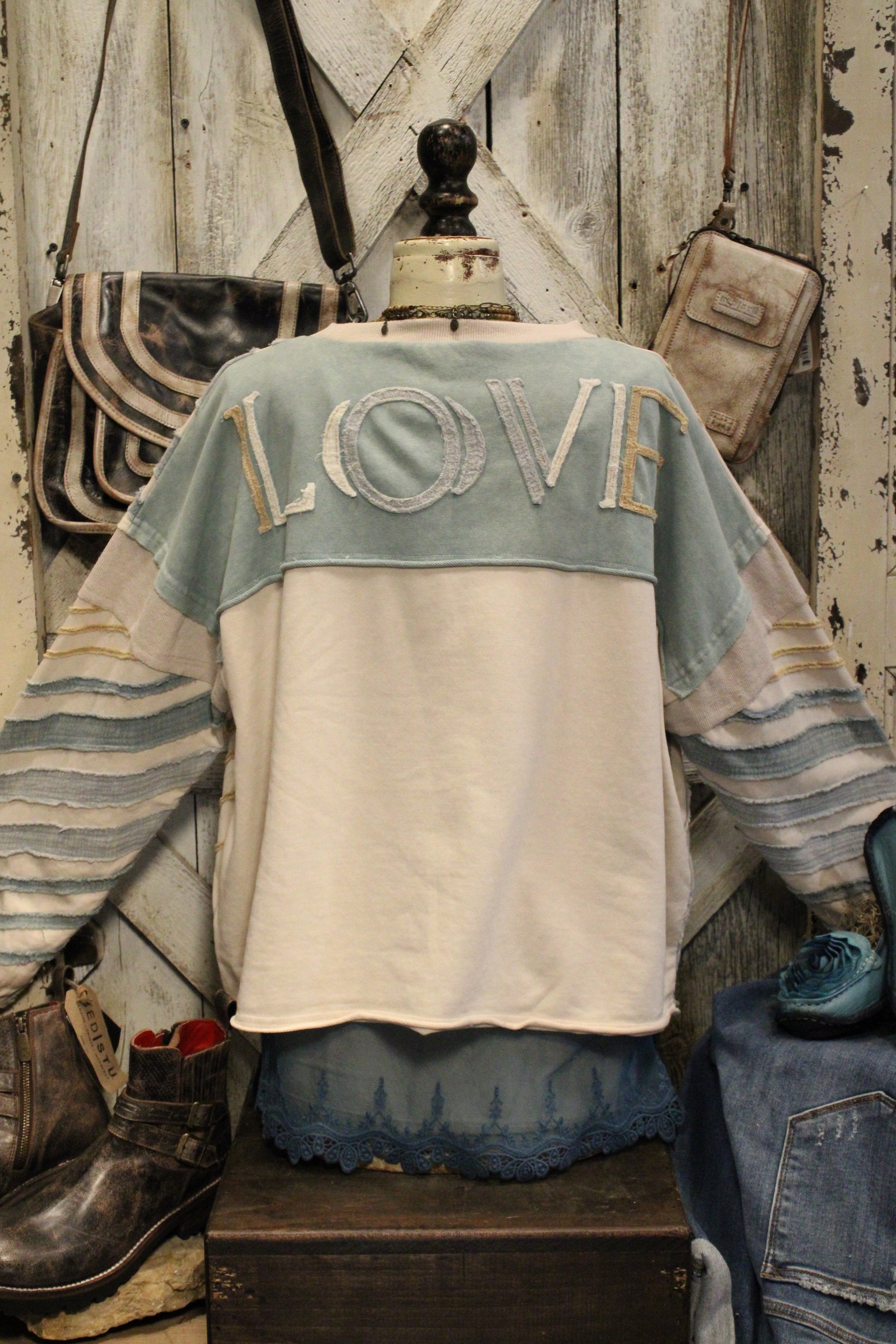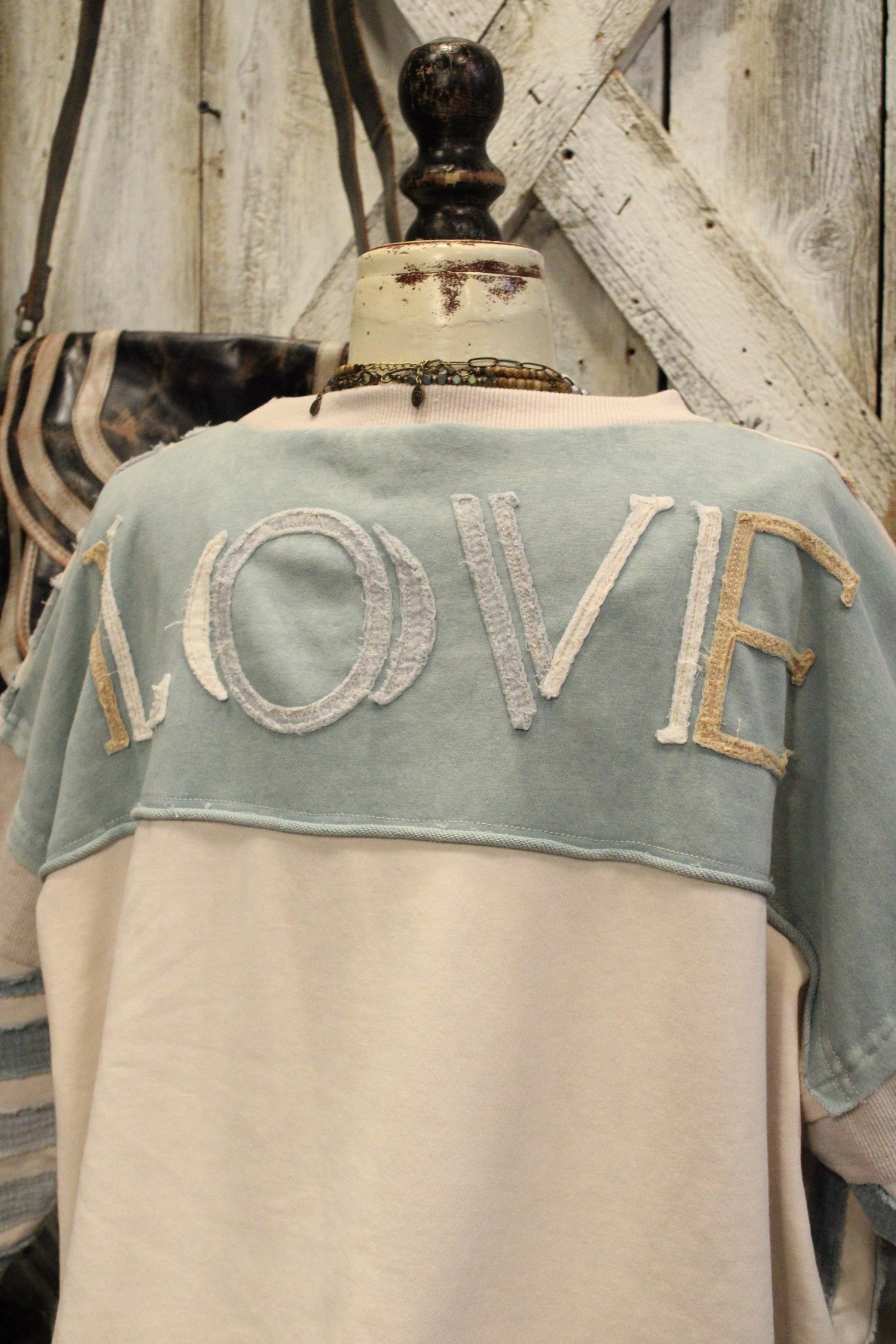 The back features a playful LOVE patchwork design, while the front shows off diagonal textured stripes that make this top feel unique without trying too hard. Comfy sleeves, an easy relaxed fit, and soft everyday fabric make it ideal for errands, lounging, or layering under your favorite denim jacket.
