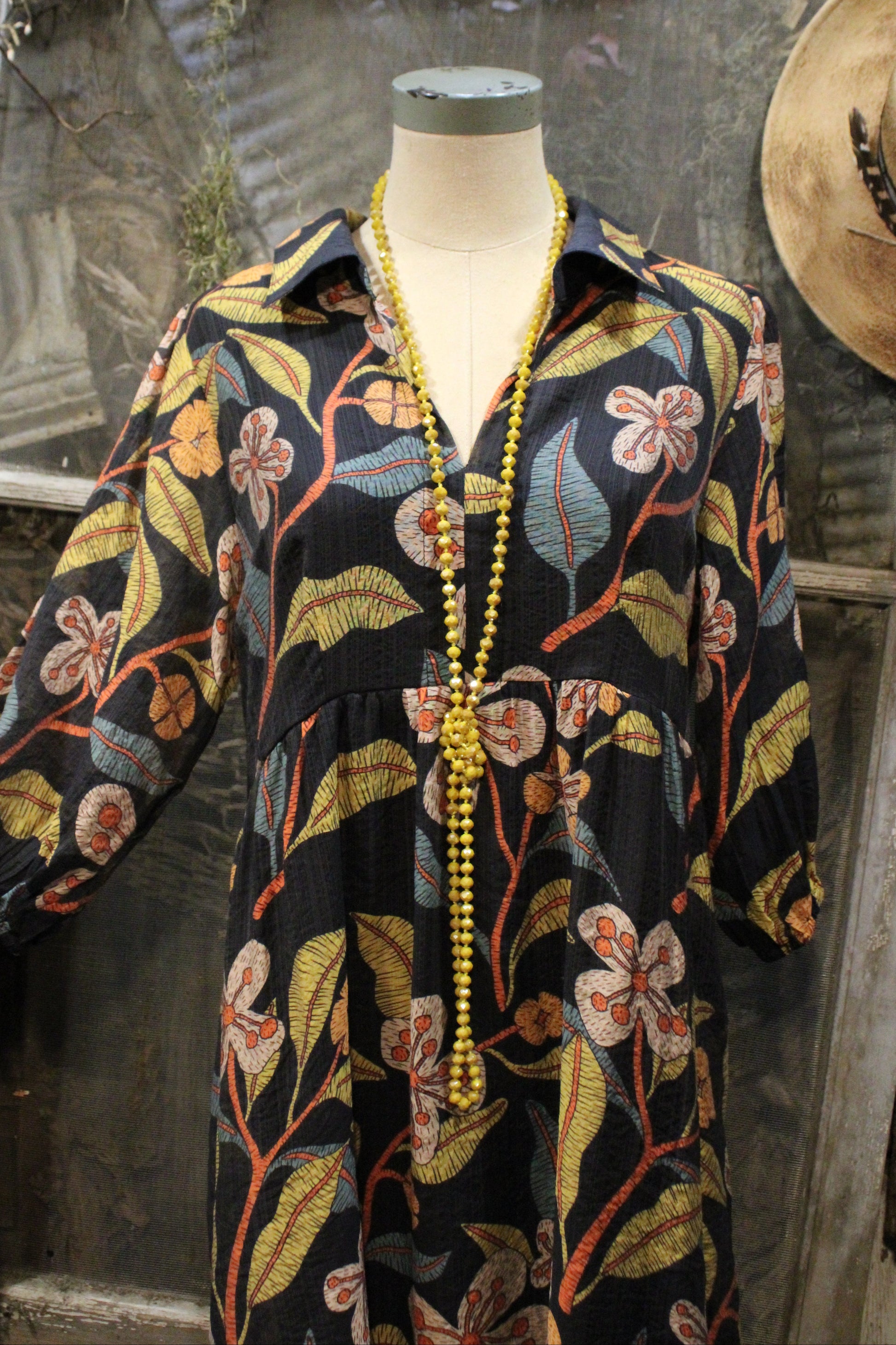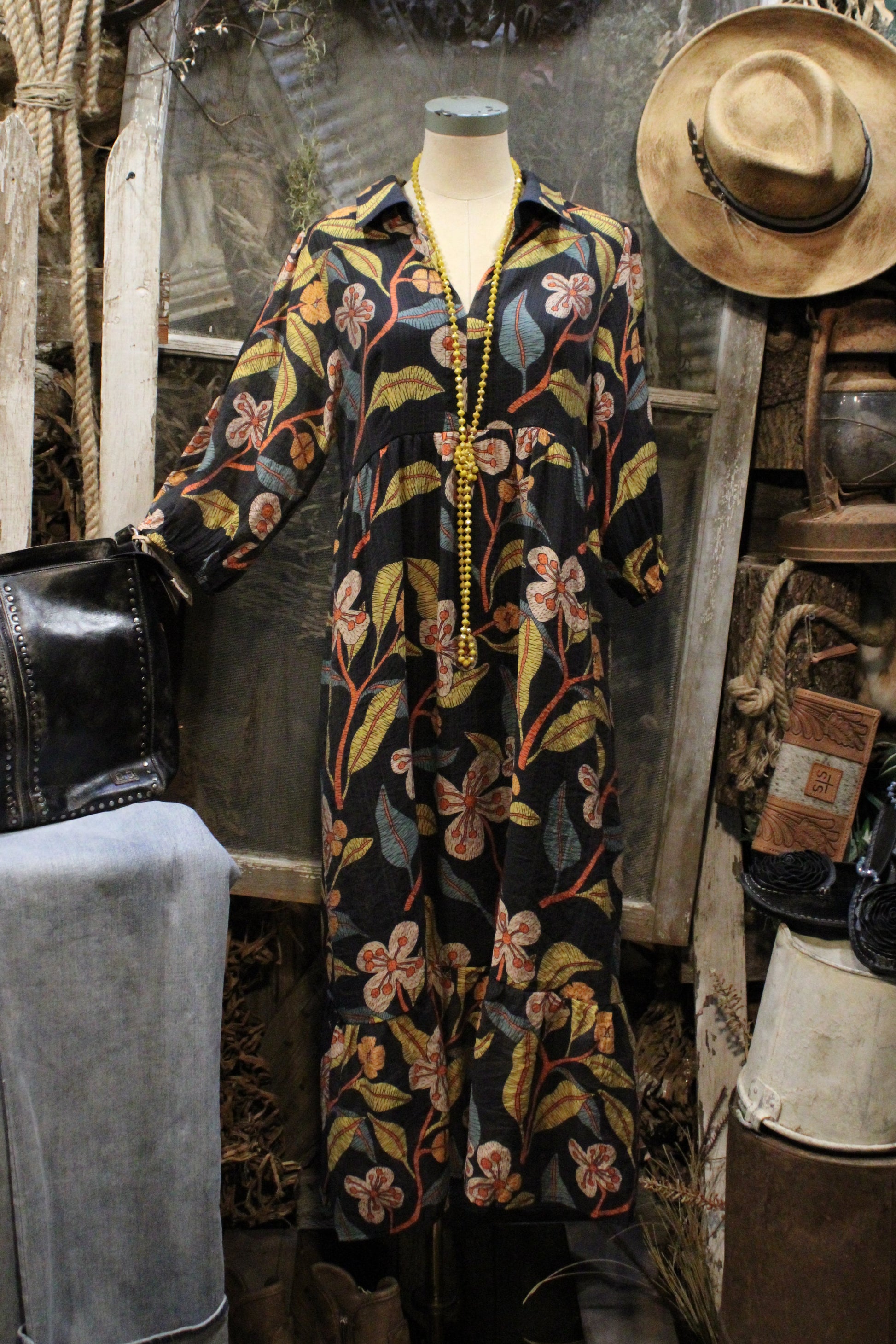 Introducing the Lovely Floral Dress- Bold, breezy, and beautifully boho this dress is your new seasonal staple. Designed with a flattering tiered silhouette and relaxed fit, this statement-making dress features a stunning floral print in earthy tones that pop against a dark background.