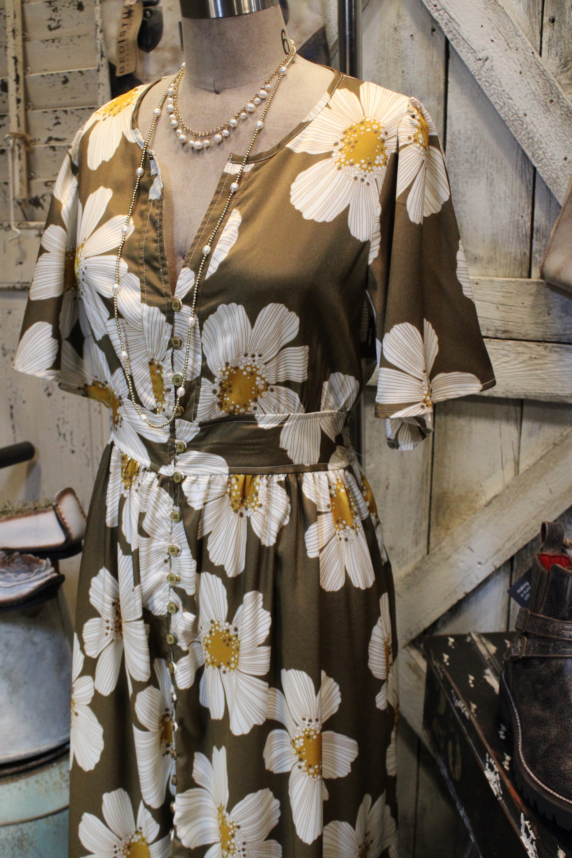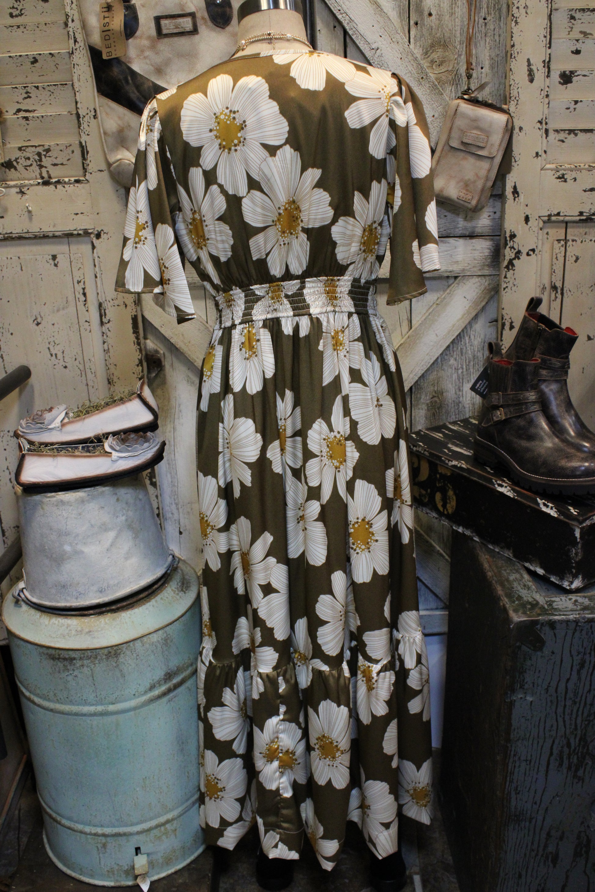 The flowy silhouette features flutter sleeves, a button-down front, and a cinched waist that flatters without sacrificing comfort. Tiered detailing adds movement and charm, making it perfect for Sunday brunch, fall photos, or just feeling pretty around the farm.