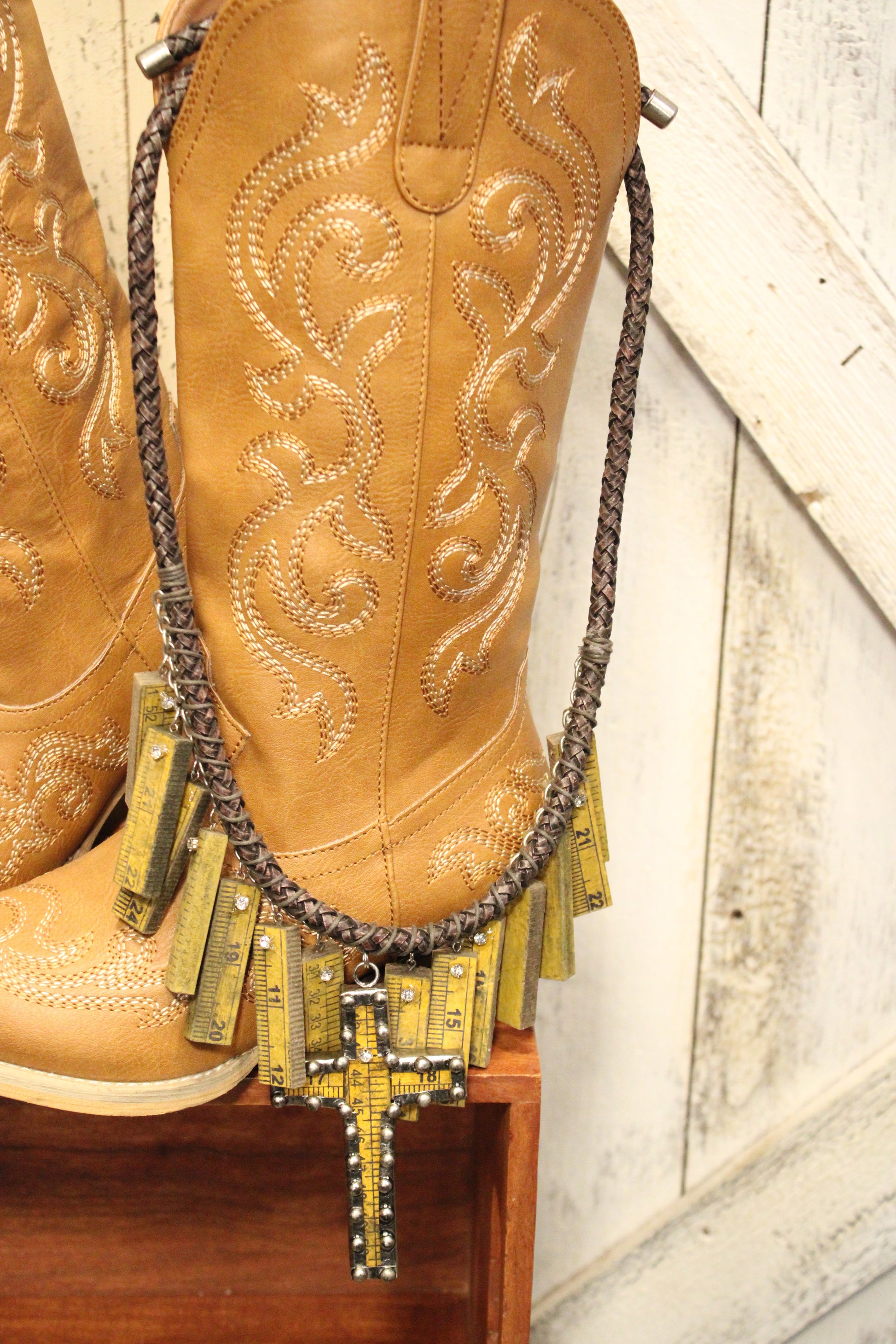 Introducing our Measured In Faith Necklace, This stunning statement necklace from A Rare Bird is true wearable art. Featuring a hand-assembled design with vintage-inspired ruler charms, a braided cord base, and a beautifully detailed rhinestone cross pendant, every piece tells a story of craftsmanship, creativity, and soulful style. Rich in texture and layered detail, this necklace instantly transforms even the simplest outfit into something unforgettable. If you love unique pieces that feel collected, artistic, and full of character, this is one you’ll treasure for years to come.