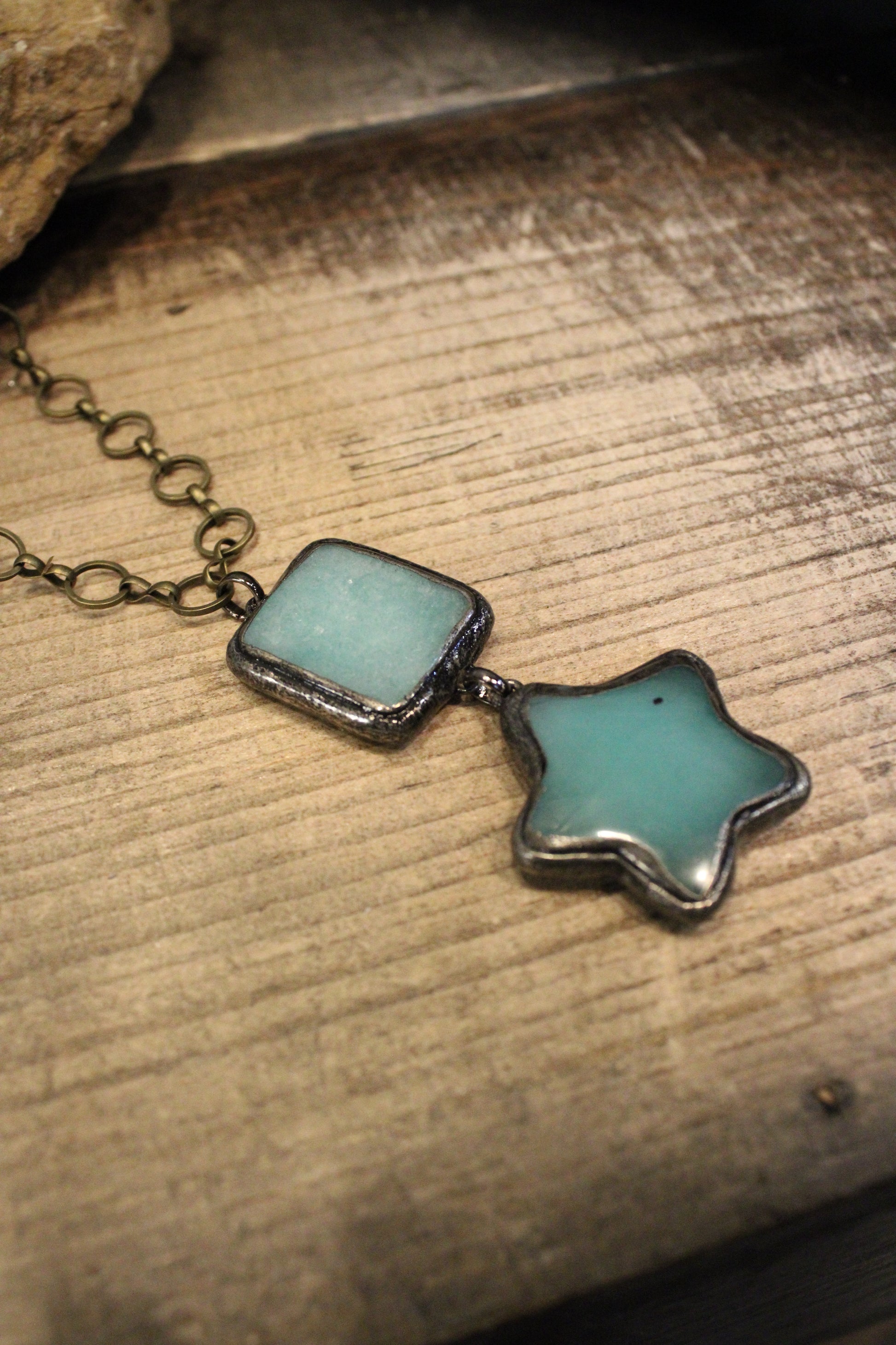 Introducing the Melissa Amazonite Necklace, This darling necklace brings a soft touch of Western charm to any outfit. The antique bronze chain leads to two dreamy blue charms—a smooth square stone and a sweet little star that adds just the right bit of personality.
