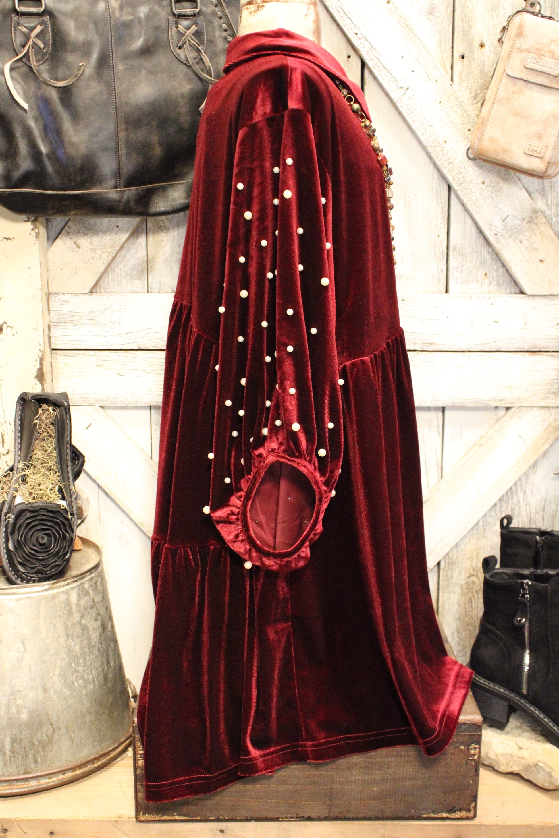Introducing the Merlot And Pearls Velvet Tunic- Meet the top that brings instant elegance to any outfit. This tunic in rich wine is soft, plush, and beautifully feminine — the perfect blend of comfort and holiday-ready charm. The relaxed silhouette gives you an easy, flattering drape, while the pearl-detailed sleeves add just the right touch of sparkle and sophistication.
