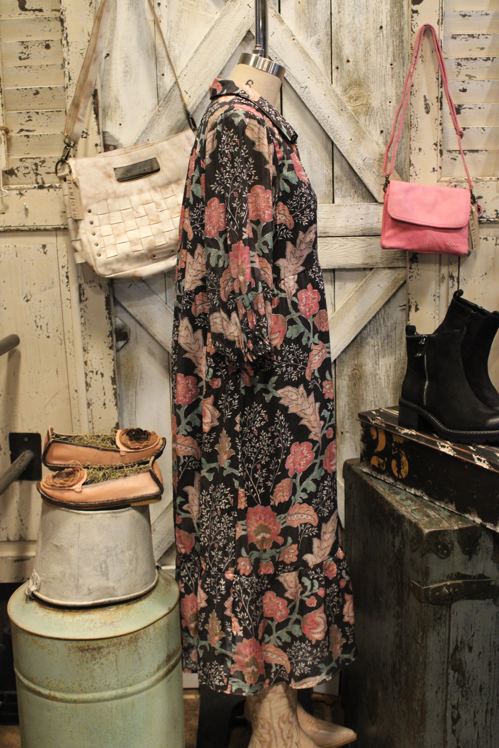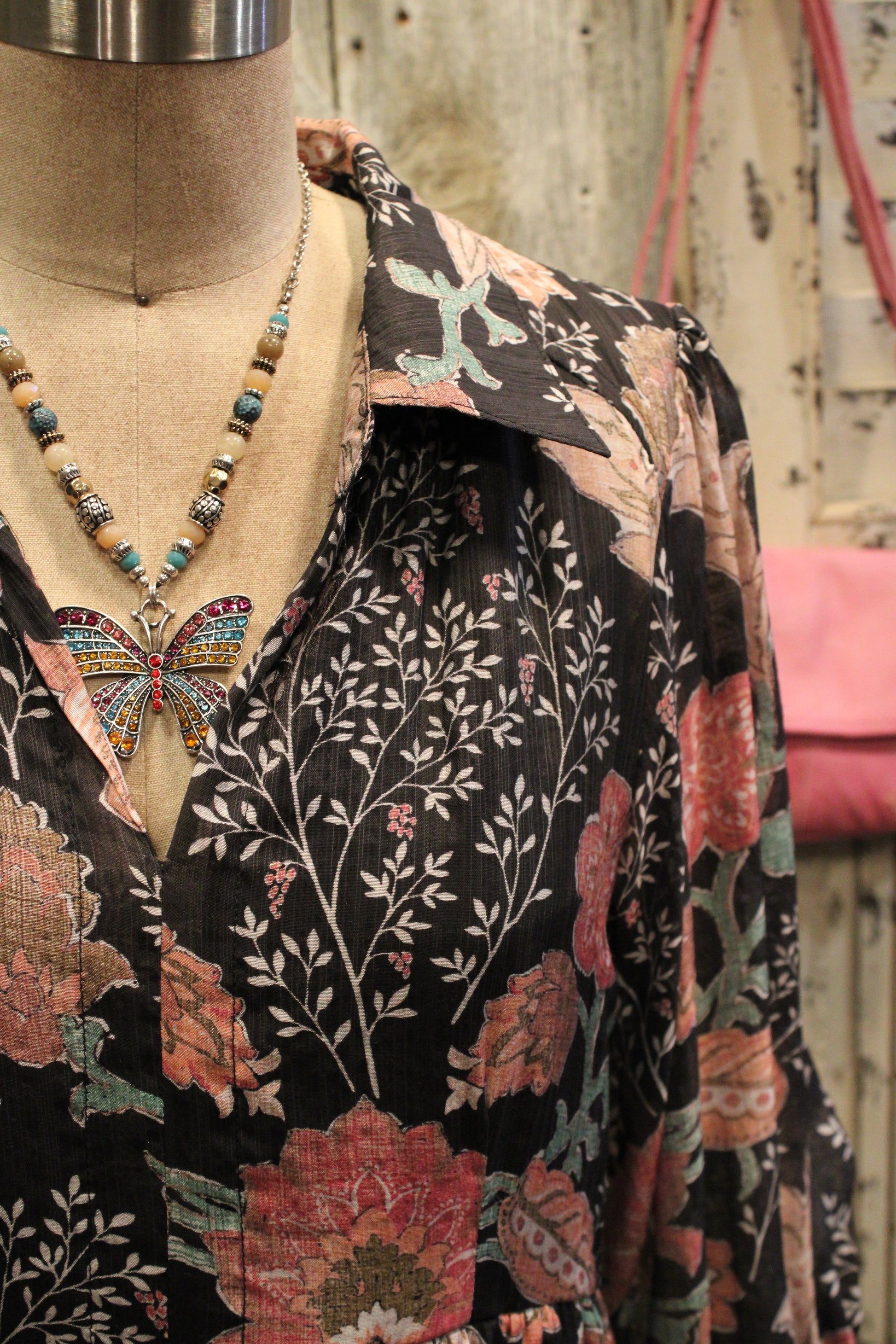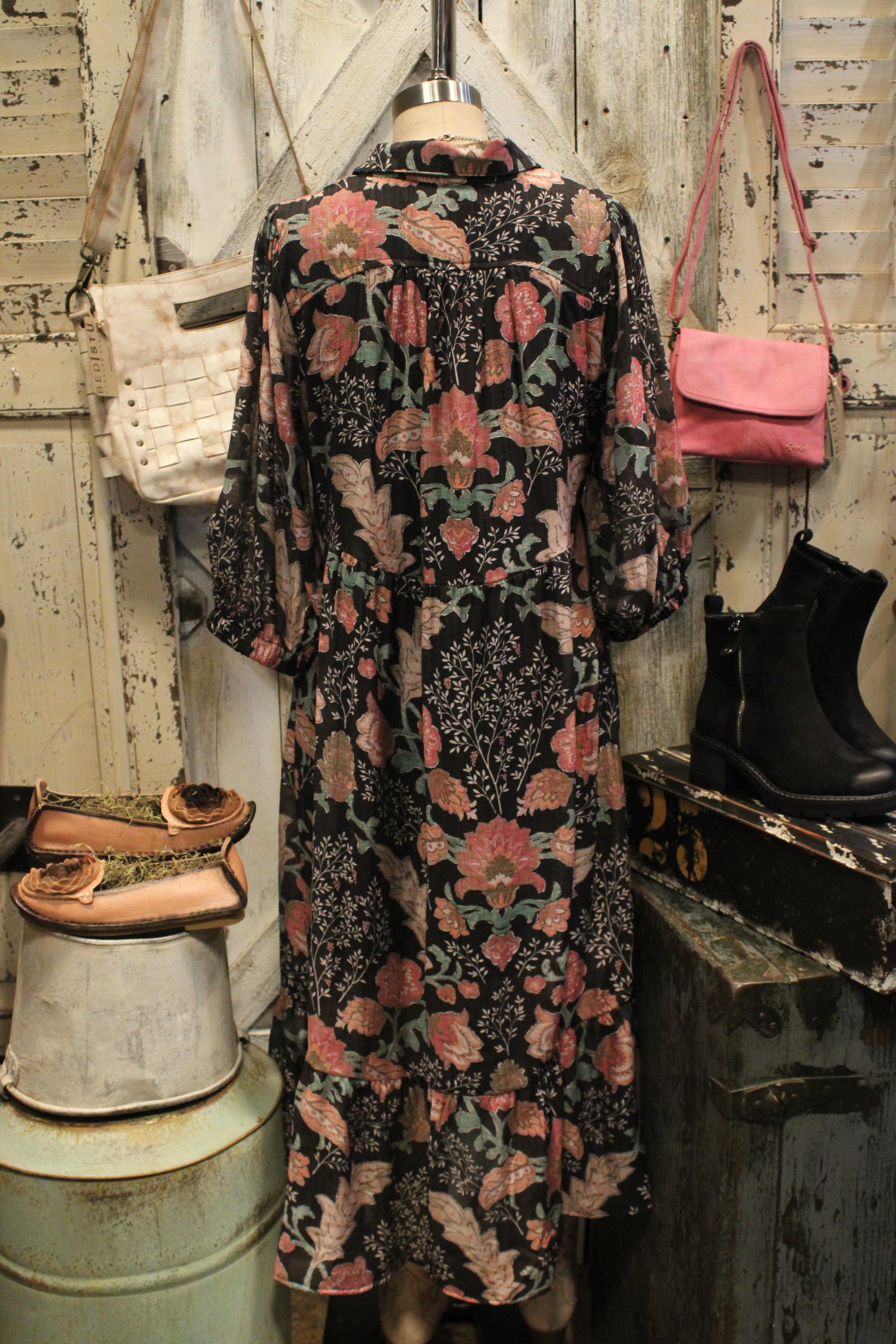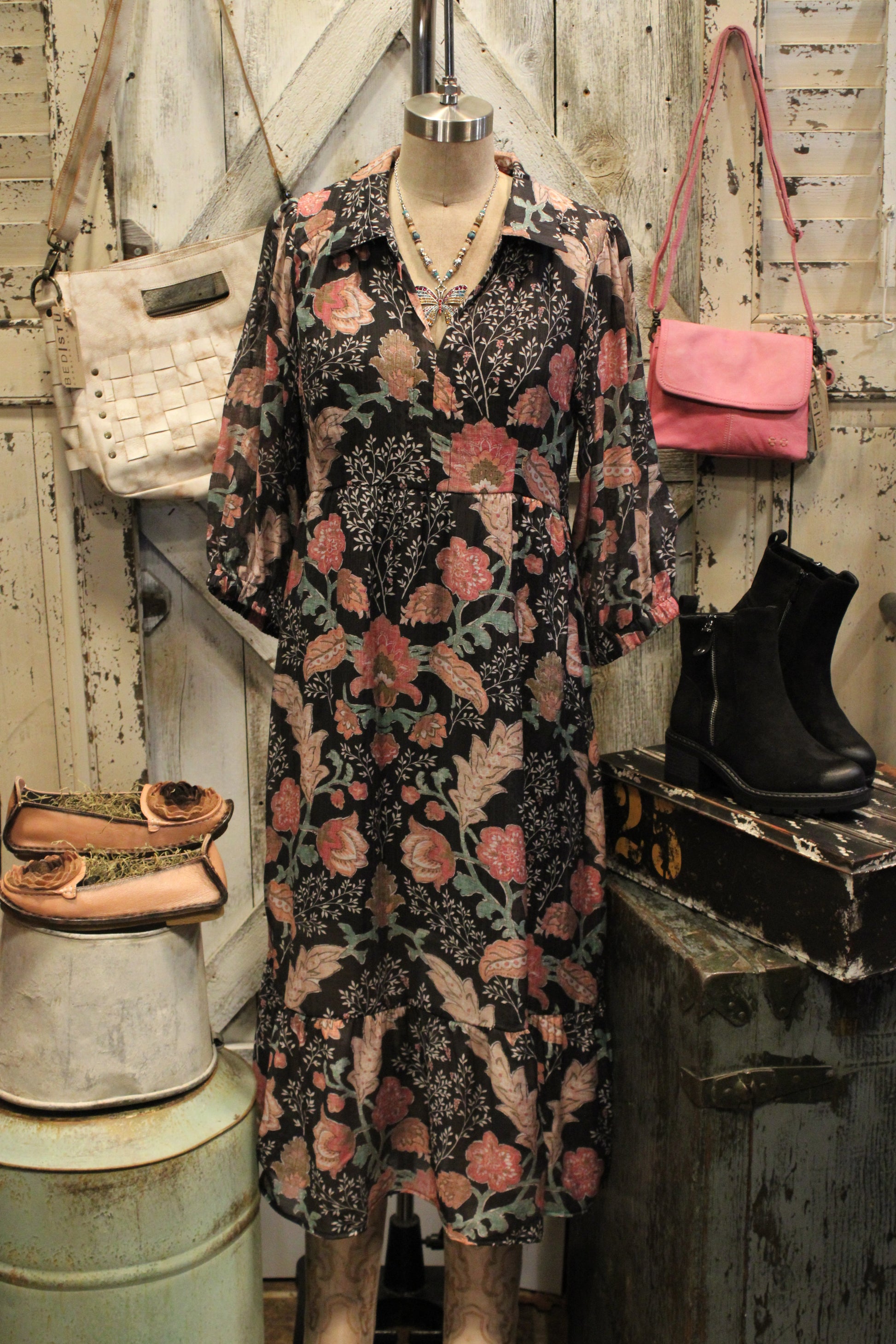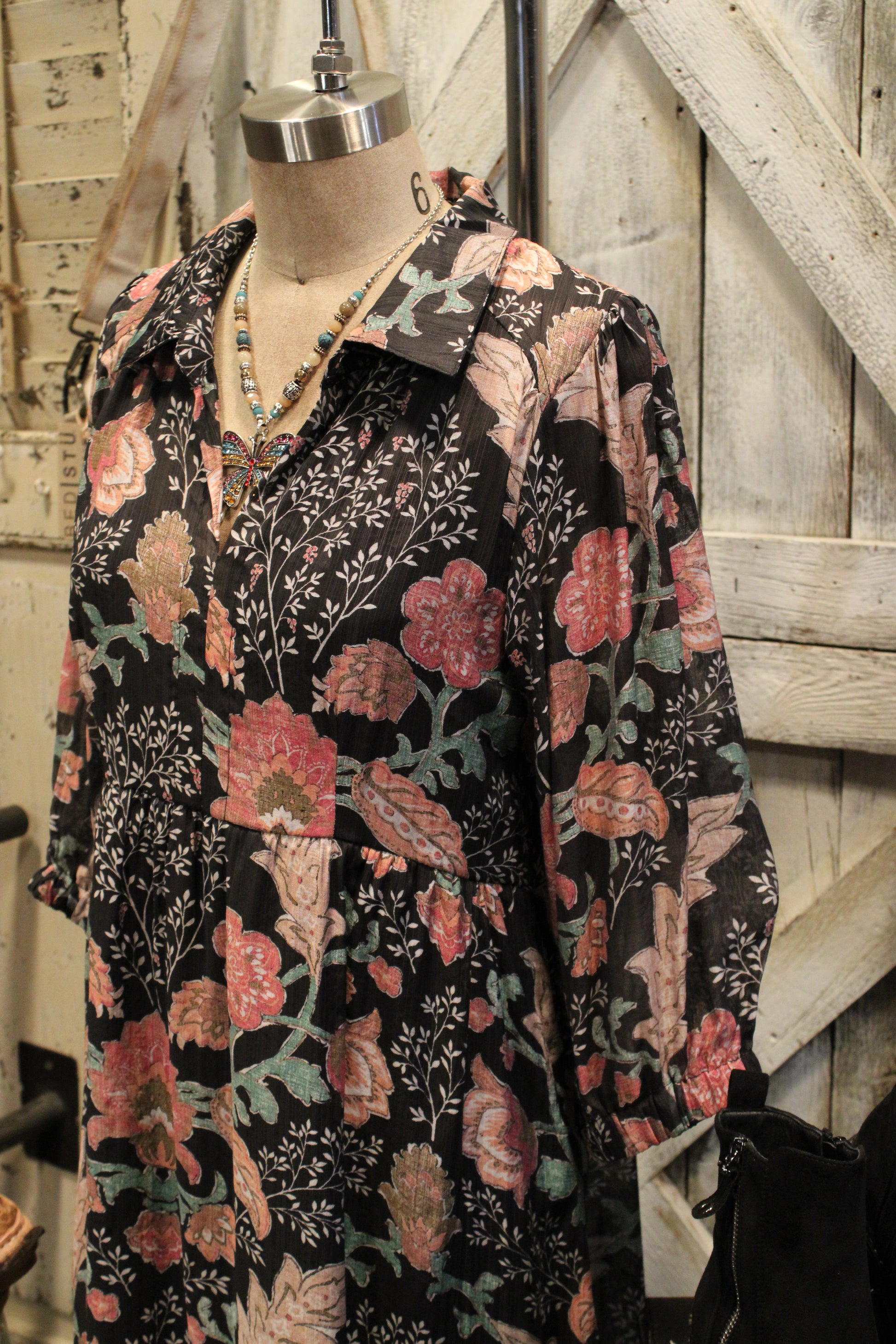 Introducing the Midnight Floral Mix Maxi Dress- This dress is where timeless elegance meets effortless comfort. Set against a classic black backdrop, the floral print blooms in shades of rosy pink, sage green, and soft beige, giving it a romantic, fall-ready feel. The collared neckline and button-down detail add a touch of polish, while the relaxed silhouette and tiered skirt create graceful movement with every step. Finished with three-quarter sleeves that gather at the wrist, this dress is both flattering and easy to wear. Pair it with boots and a hat for a chic daytime look, or add jewelry to take it into the evening—this dress is truly made for every occasion.