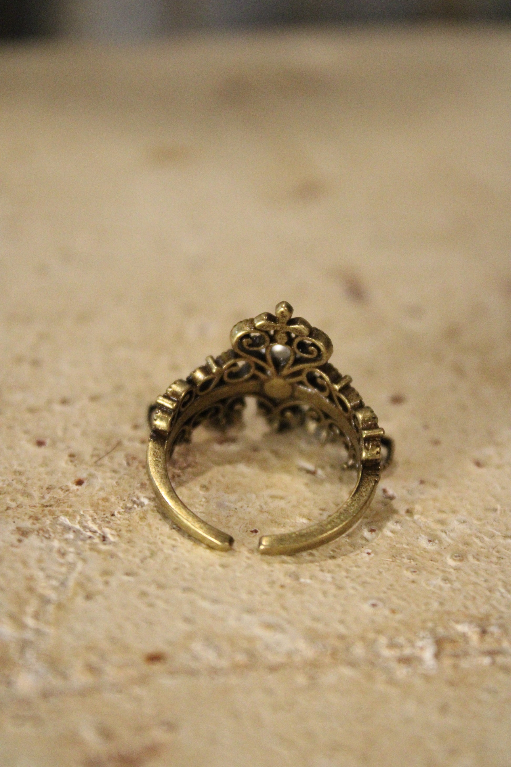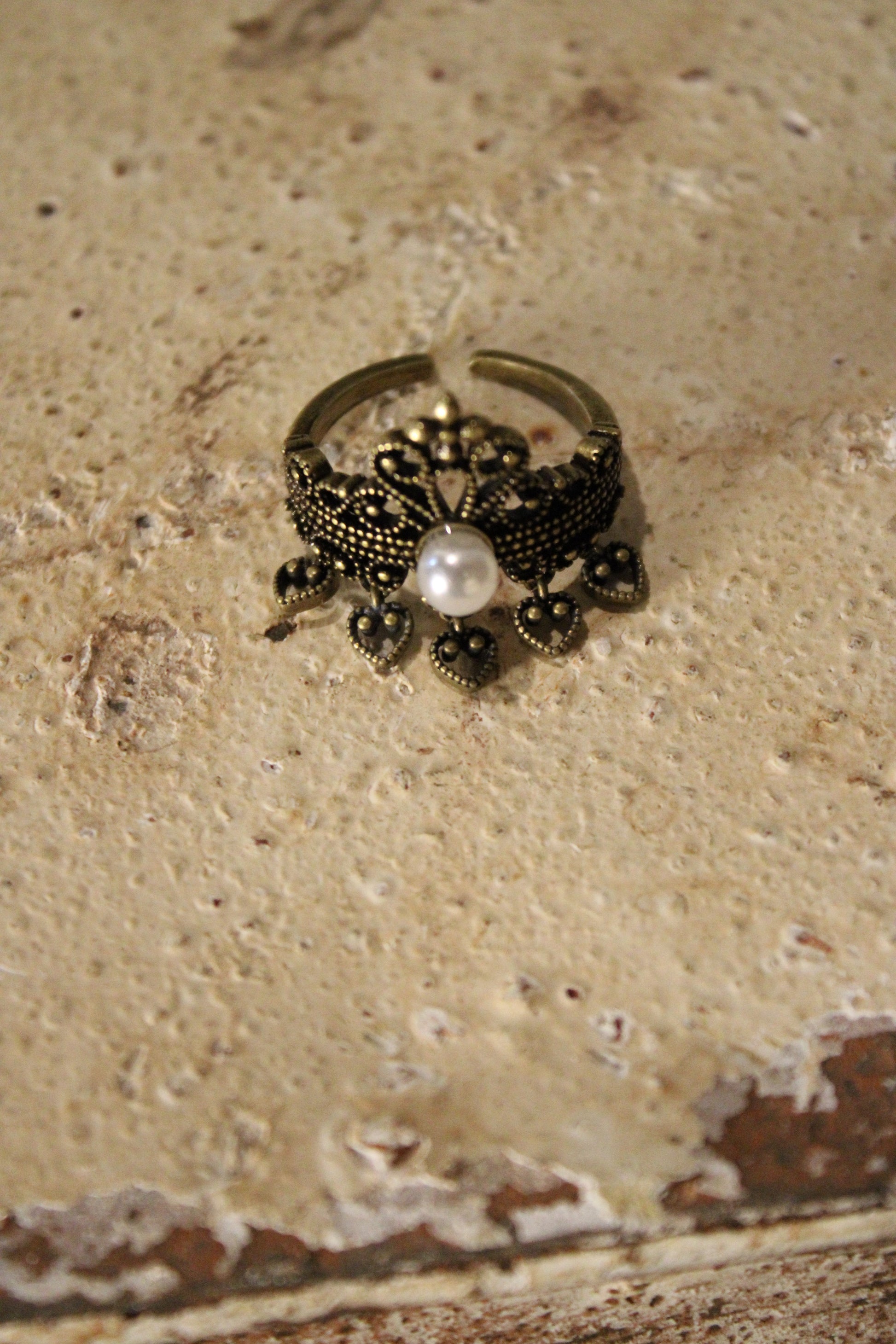 Introducing the elegant Midnight Pearl Ring, This vintage-inspired ring feels like a tiny treasure with old-soul charm. Designed with an antique gold-tone finish, it features ornate filigree detailing, a dainty crown-like design, and a soft pearl-style center accent that adds a touch of romance. Small heart charms along the band give it a sweet, whimsical finish that feels thoughtful and special.