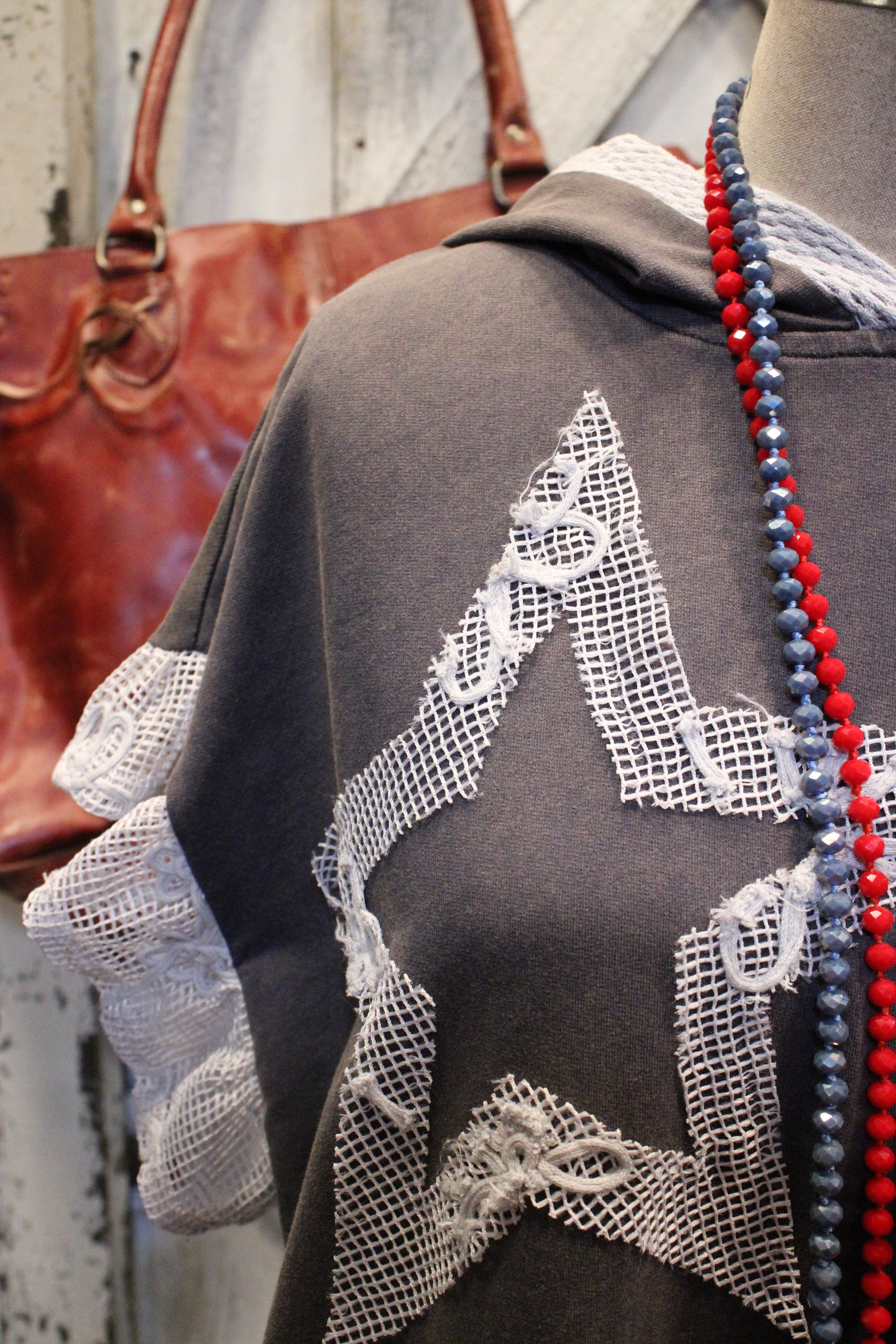 Introducing the Midnight Sky Hooded Dress-  Cozy meets cute in the best possible way! This hoodie-style dress brings laid-back charm with a touch of feminine flair. Featuring cream lace star appliqués and matching lace trim on the sleeves, it’s the perfect mix of casual comfort and boutique sweetness. The soft fabric, roomy fit, and handy pockets make it ideal for lounging, layering, or a stylish day out on the town.