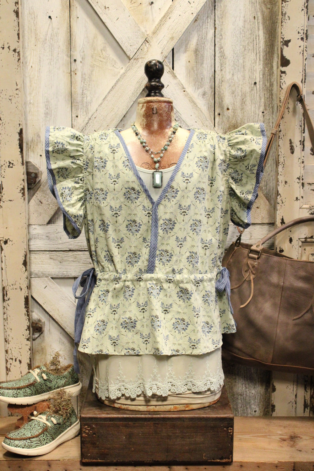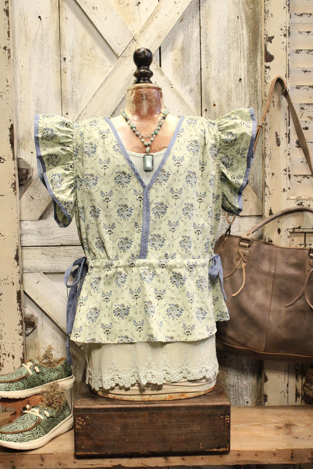 Introducing the Mint Leaf Blouse- Softly romantic and effortlessly elegant, this floral blouse is designed with delicate details that elevate everyday style. Featuring a subtle all-over floral print, fluttery ruffle sleeves, and a flattering V-neckline, this top blends timeless charm with modern femininity. Contrast trim accents add a refined touch, while the cinched waist creates a graceful silhouette.
