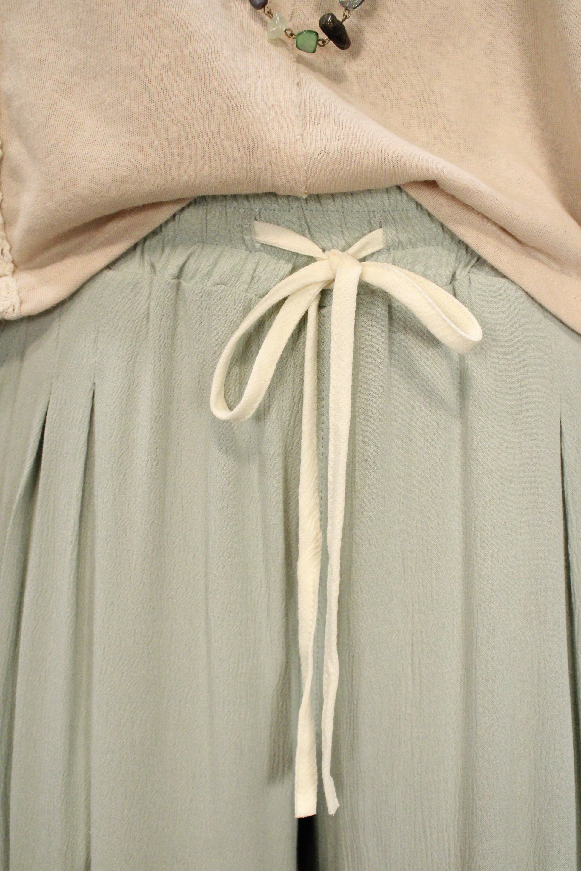 The elastic waistband with adjustable drawstring creates a comfortable, flexible fit, while the lightweight, drapey fabric moves beautifully with you. Front pockets add practicality without taking away from the feminine feel, making these pants as functional as they are pretty. Easy to dress up or down, they’re perfect for casual days, weekend outings, or relaxed gatherings.