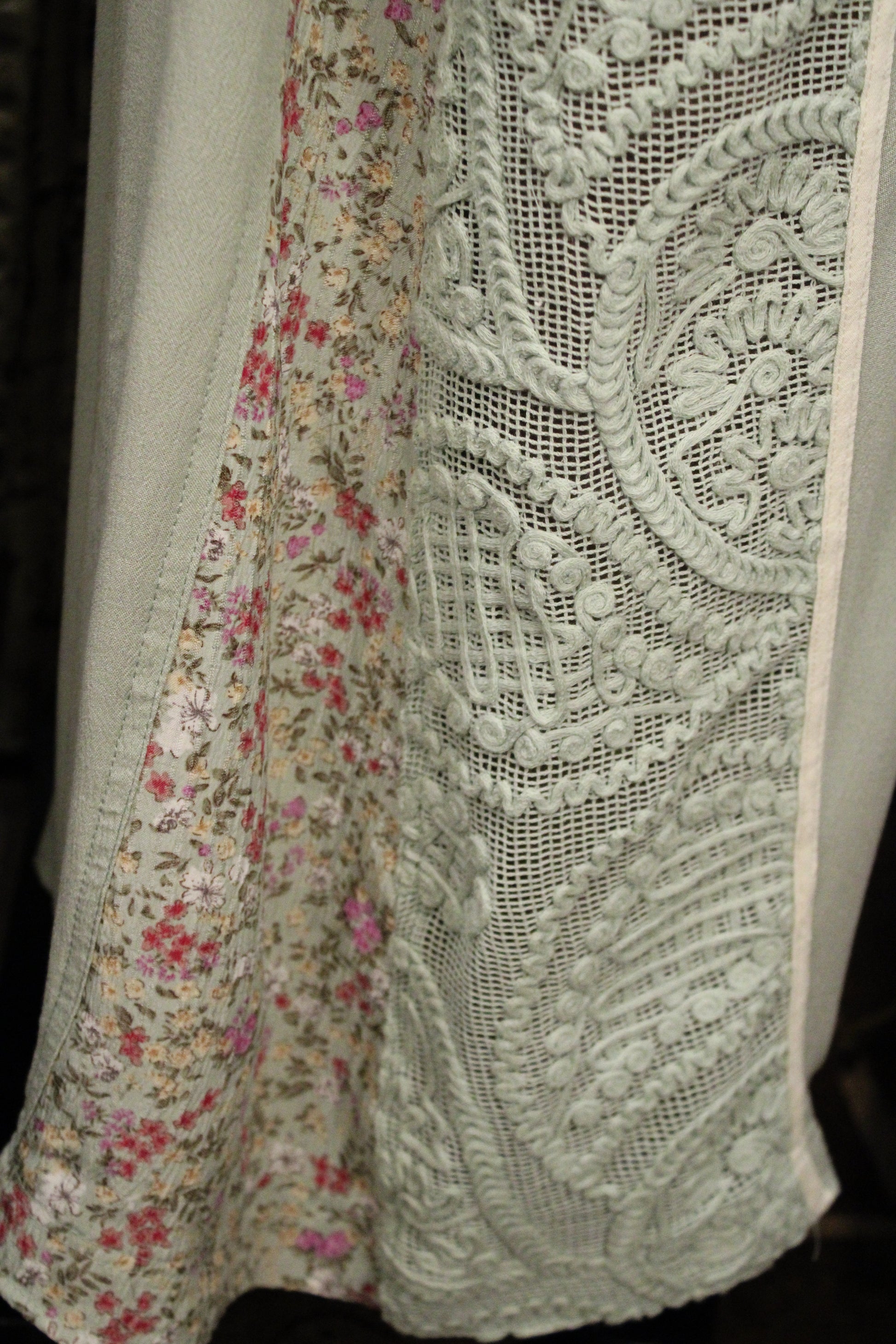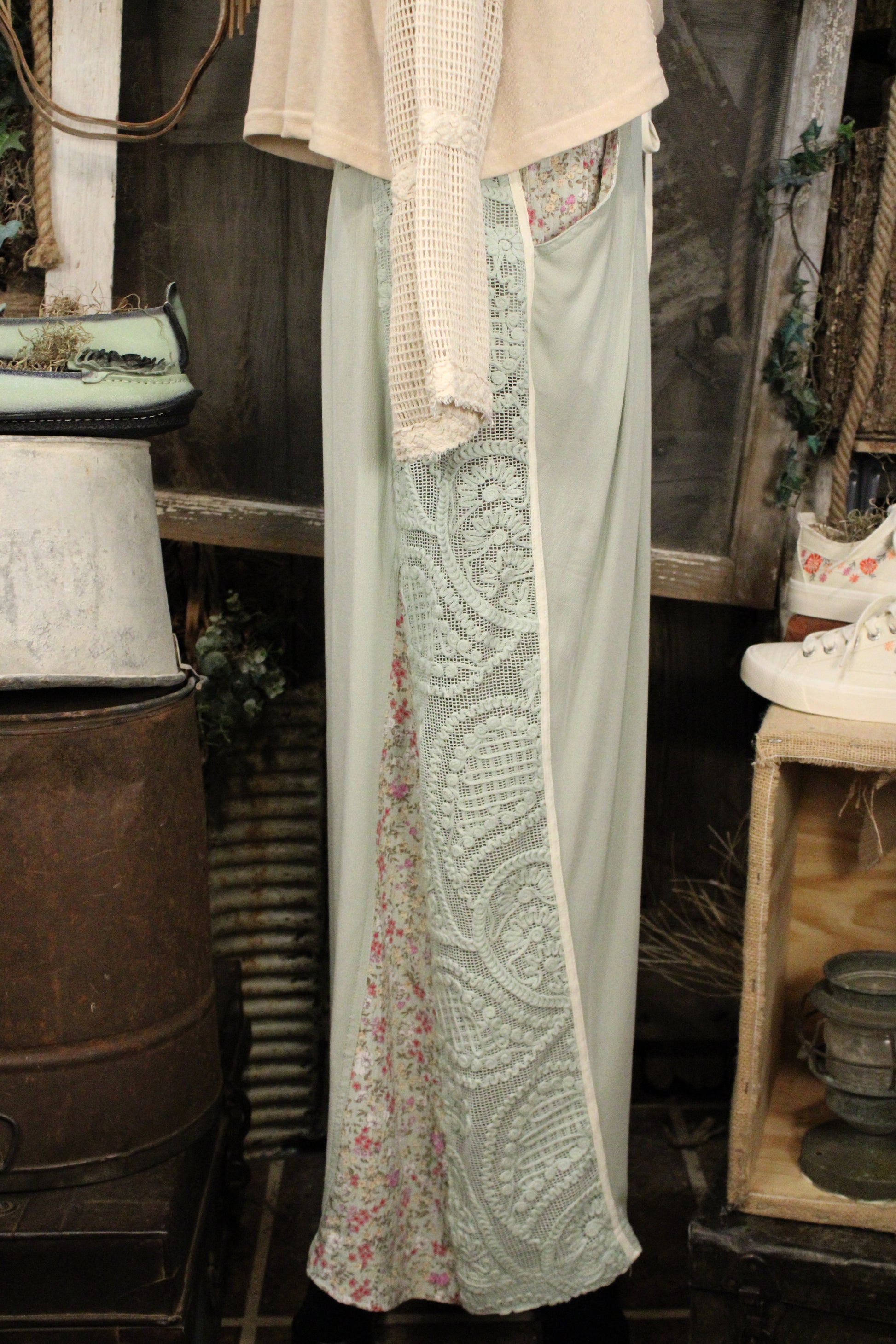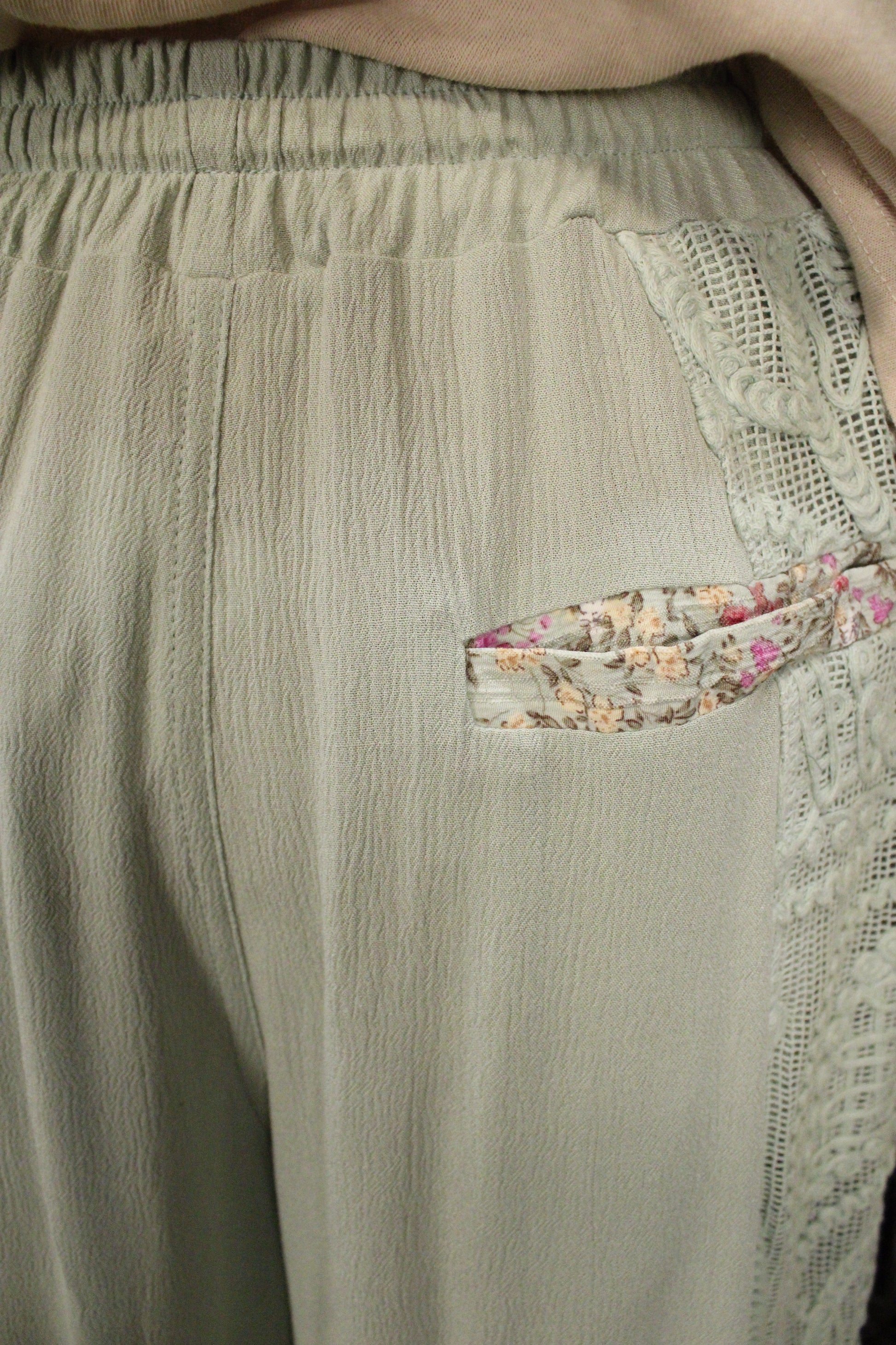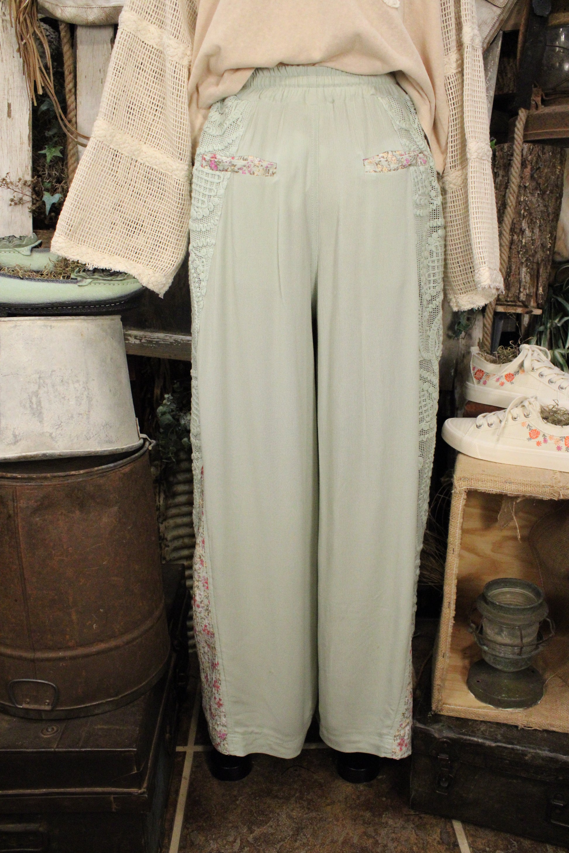 Introducing the Mint Meadow Lace Pants -Soft, flowy, and full of charming detail—these Mint Meadow Lace & Floral Pants are made for effortless everyday style with a romantic, farm-girl touch. Designed in a soothing sage-mint hue, these wide-leg pants feature beautiful lace panels along the sides paired with subtle floral accents that add texture and visual interest from every angle.