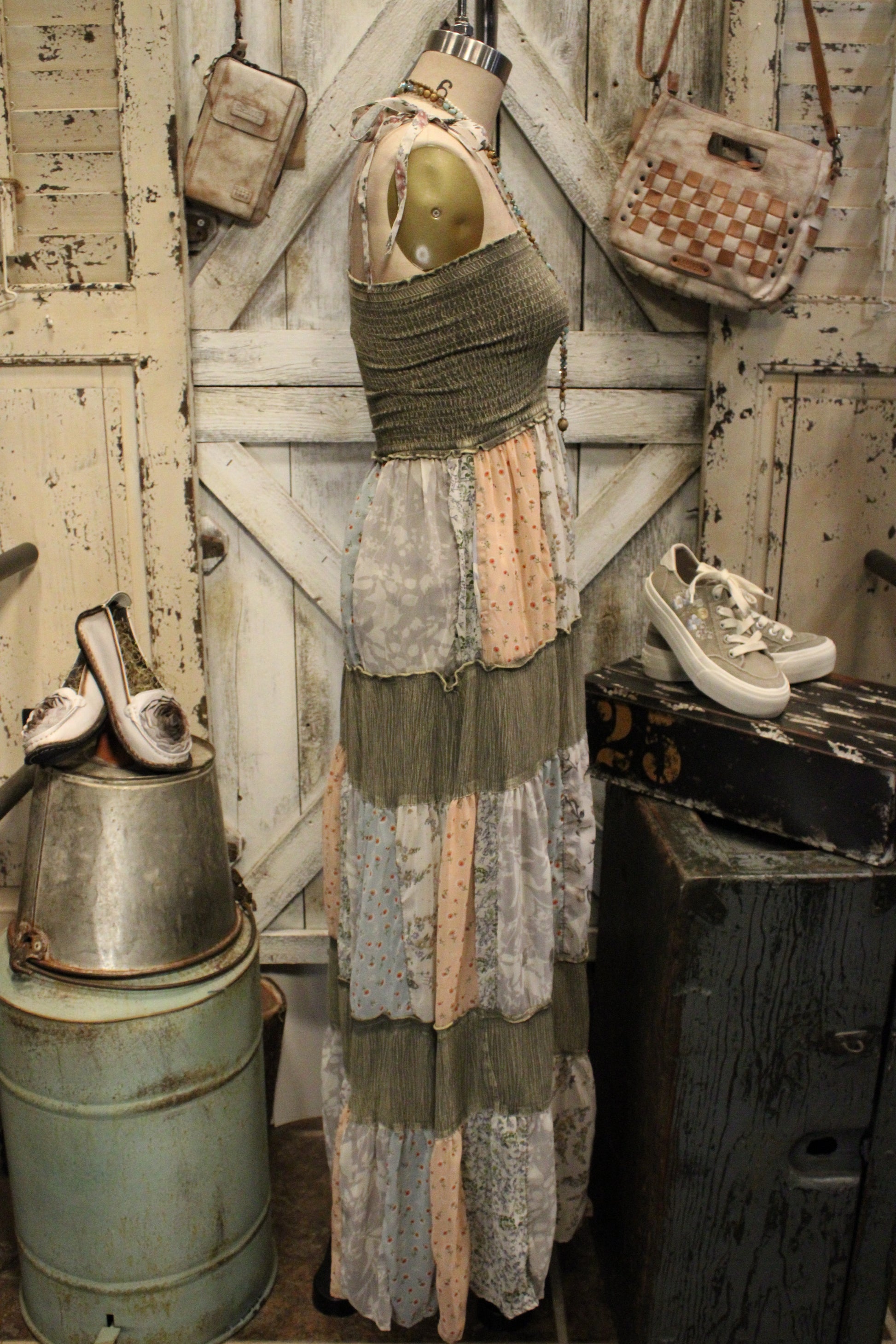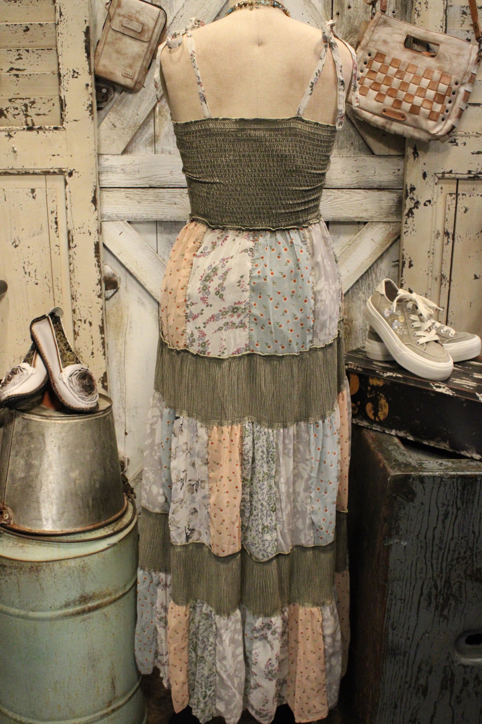 Introducing the Mismatched Mindy Gravel Patched Maxi Dress -This flowy favorite features a stretchy smocked bodice for a flattering, fuss-free fit and charming tie-up shoulder straps that add a playful, feminine touch. The full-length tiered skirt is designed with a dreamy mix of boho floral prints and textured sage panels, creating a soft, romantic patchwork look that moves with ease.