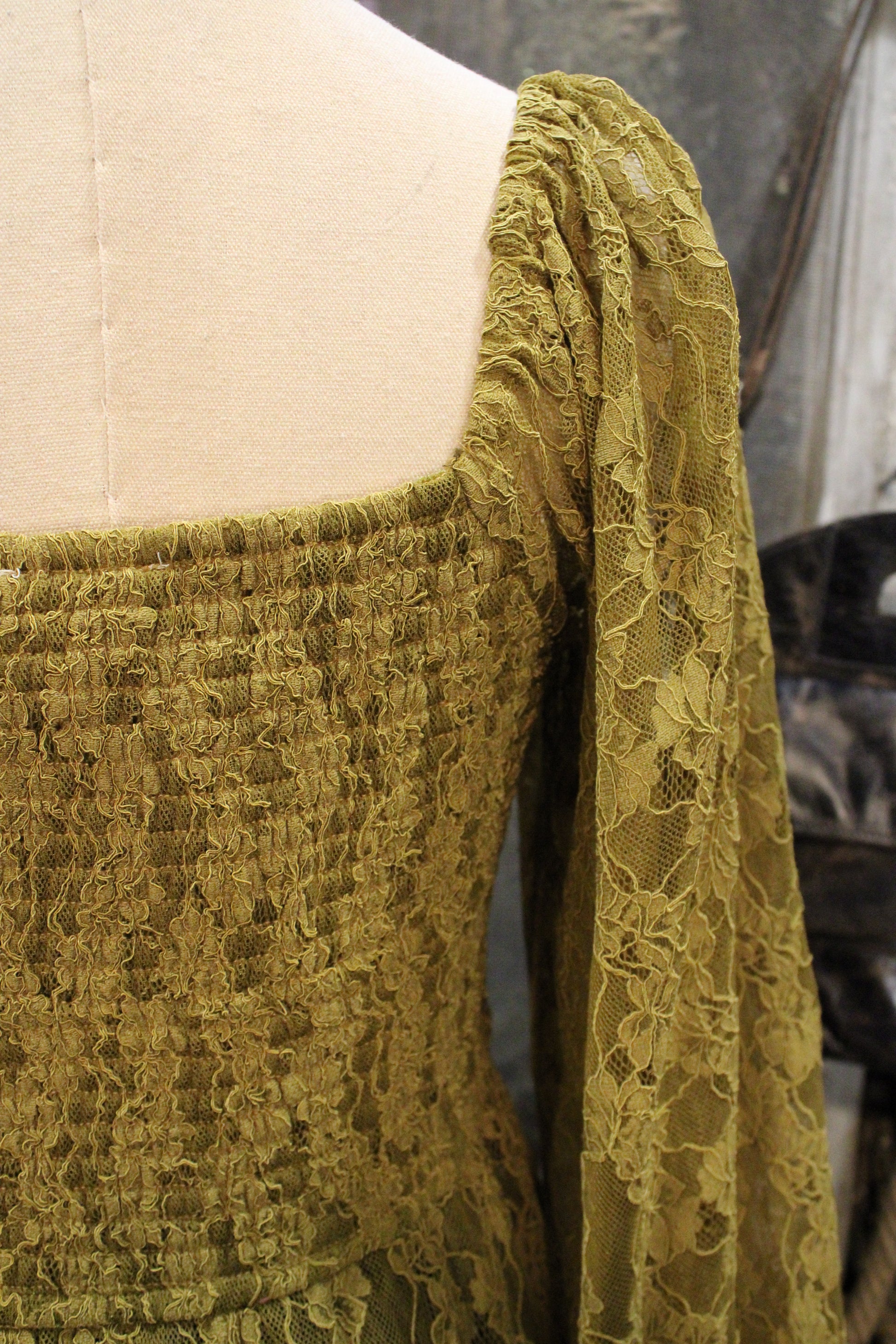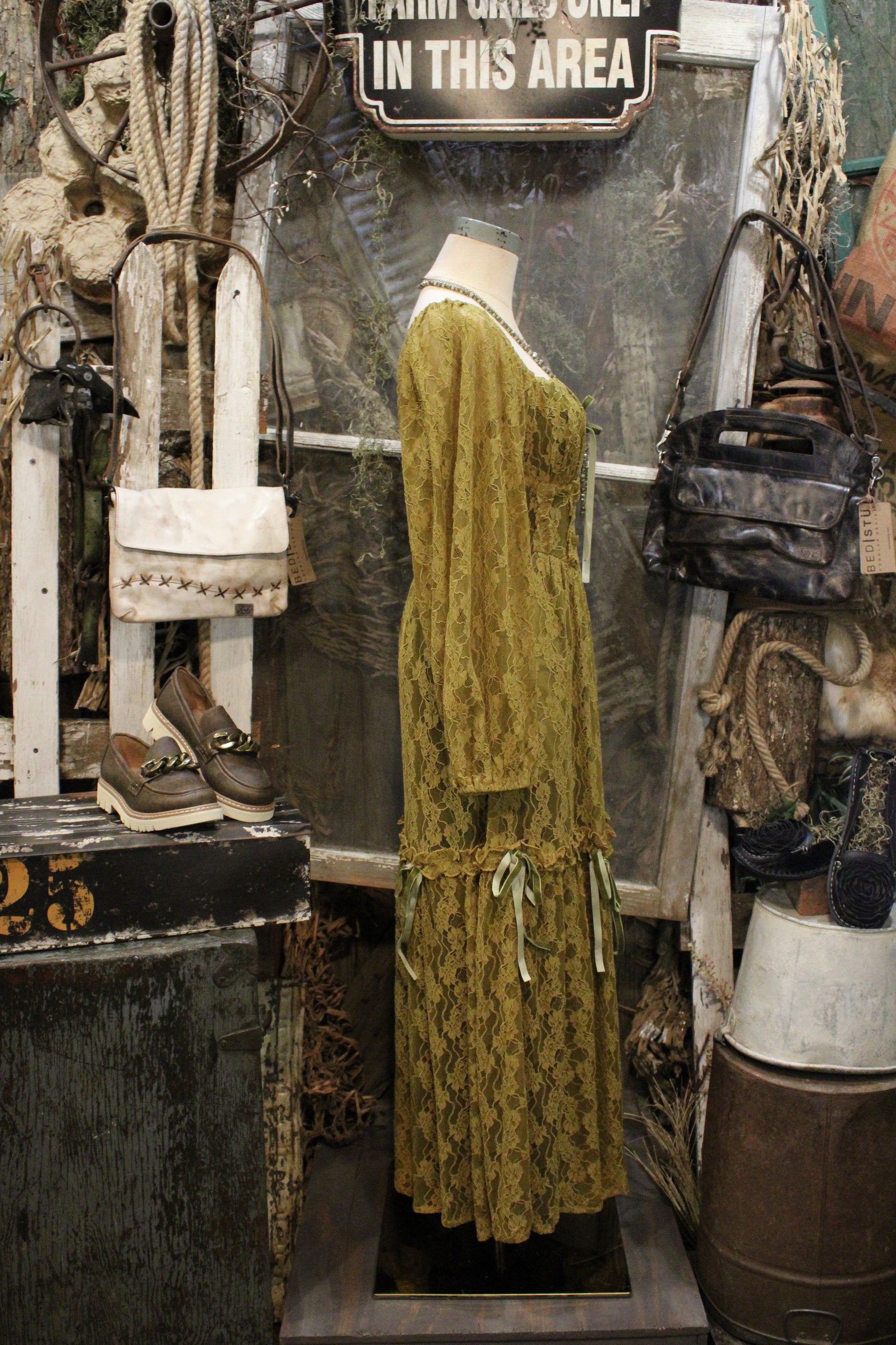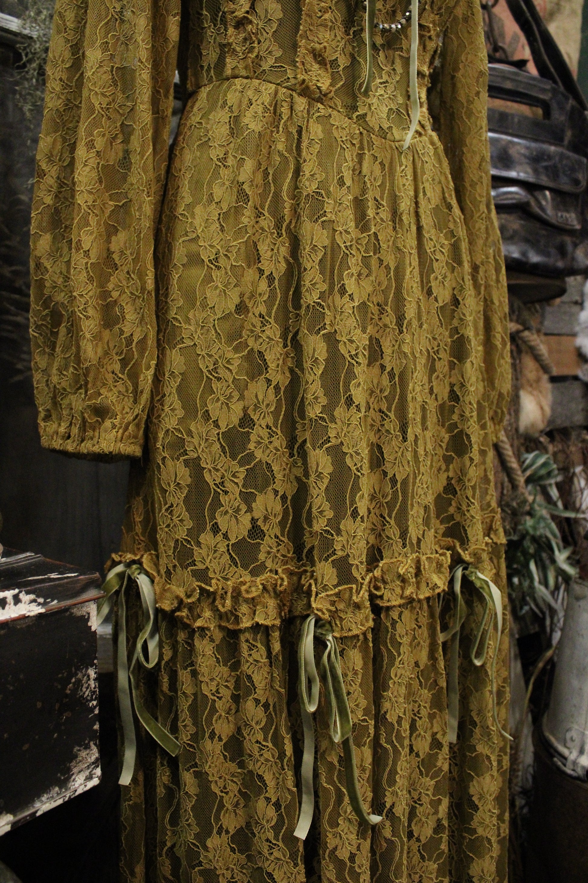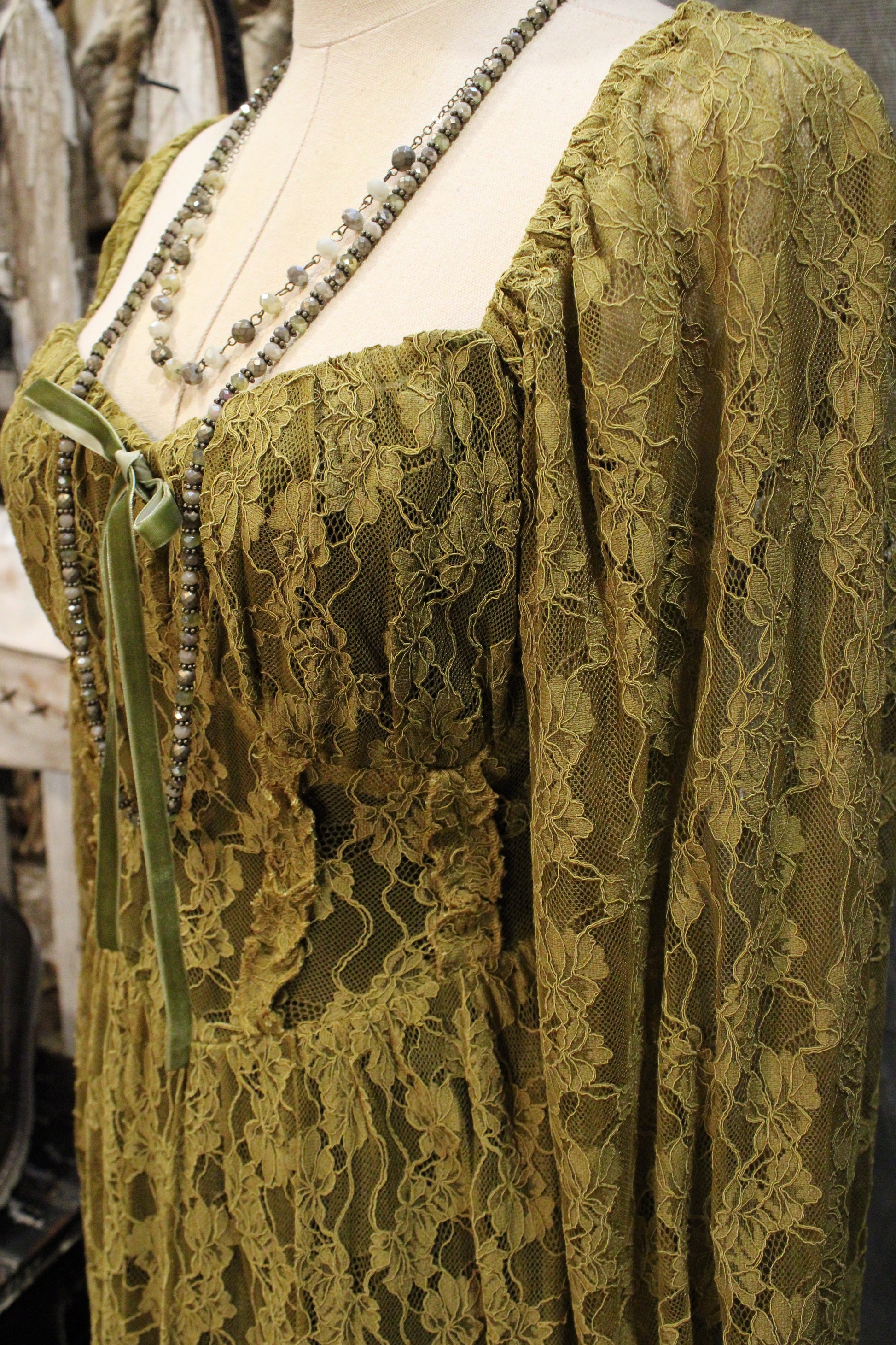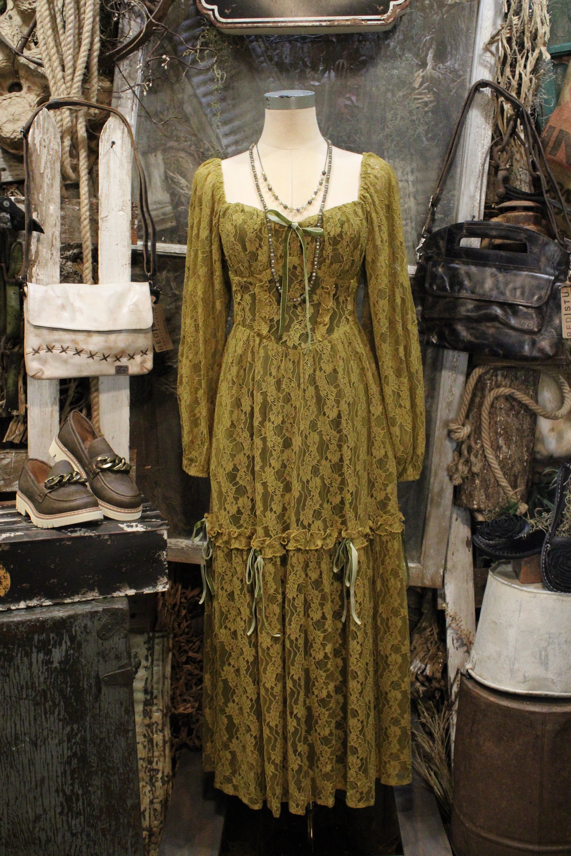 Introducing the Miss Melody Olive Dress-a spellbinding blend of vintage romance and forest magic. Crafted in a rich mossy green floral lace, this dress features a fitted bodice with a sweetheart neckline, dainty satin ribbon ties, and long sheer sleeves that whisper of enchanted woods and moonlit evenings.