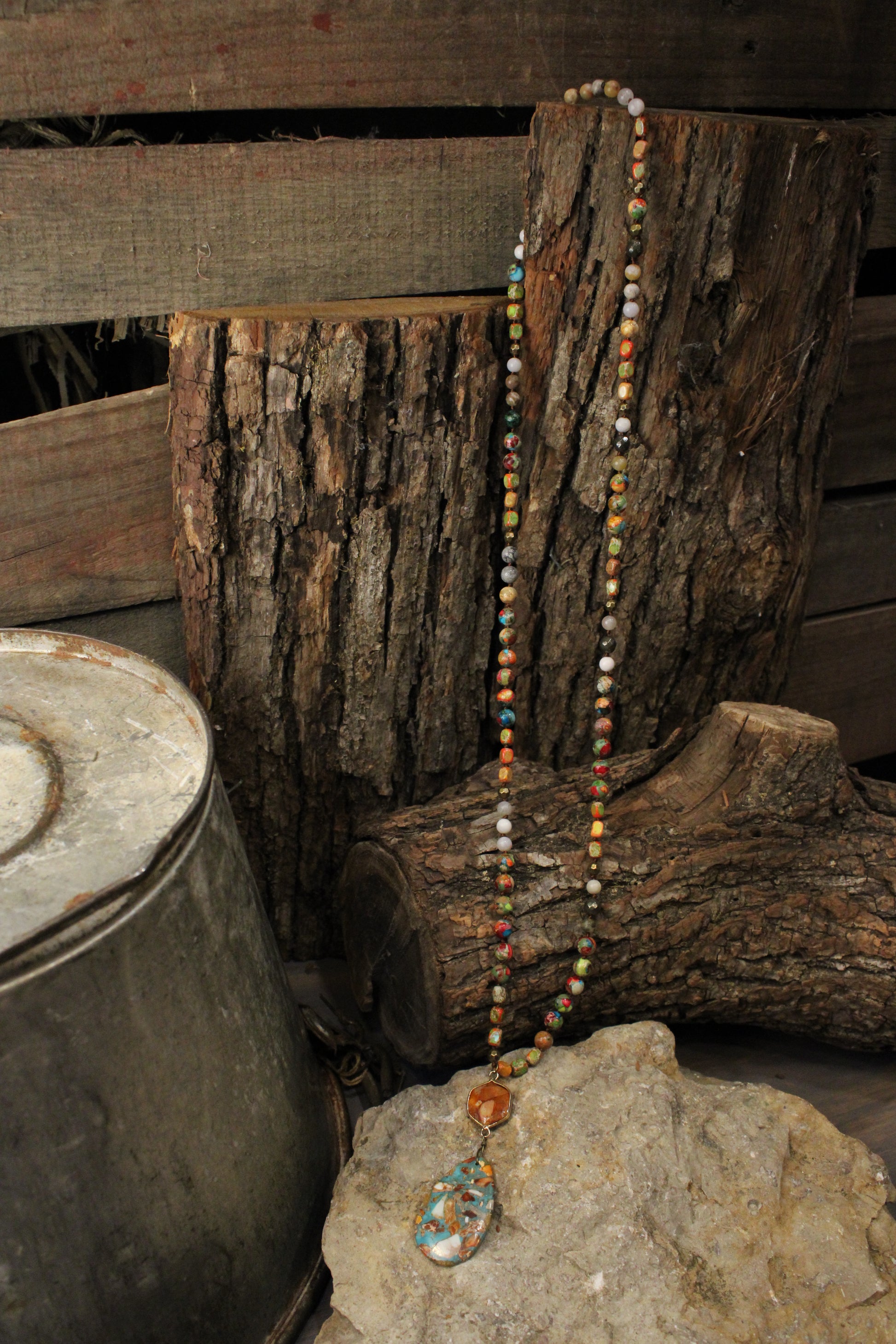 Each bead tells its own story with rich earth tones, pops of turquoise, and hints of amber, all leading to a stunning teardrop stone pendant that steals the show. Whether you’re dressing up your favorite denim or adding flair to a simple top, this necklace is the perfect finishing touch for that farm-girl-meets-boho look.