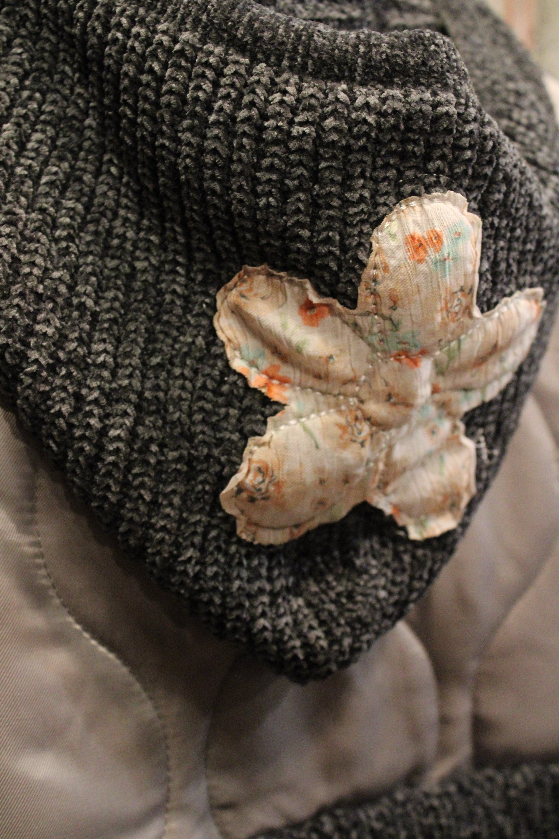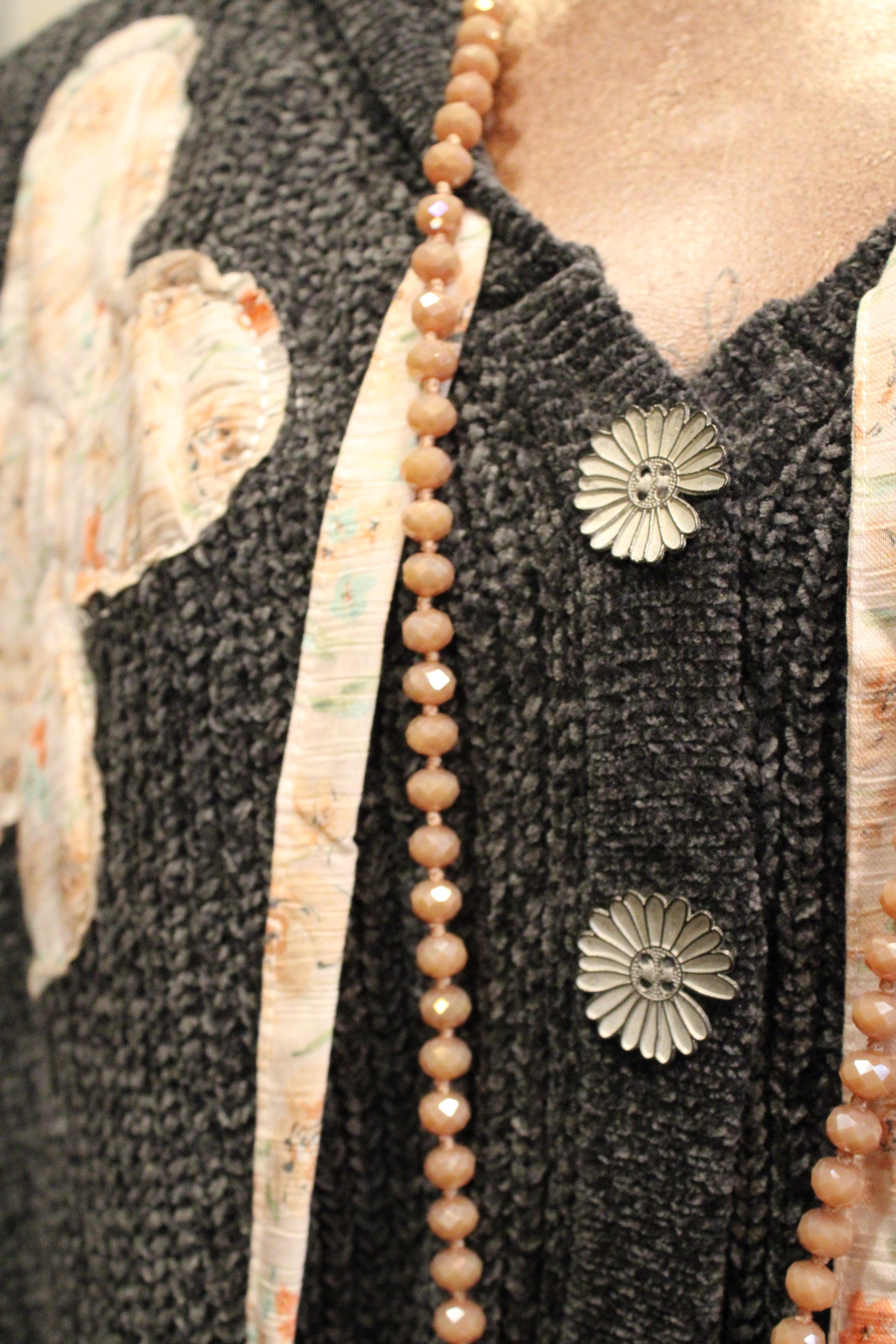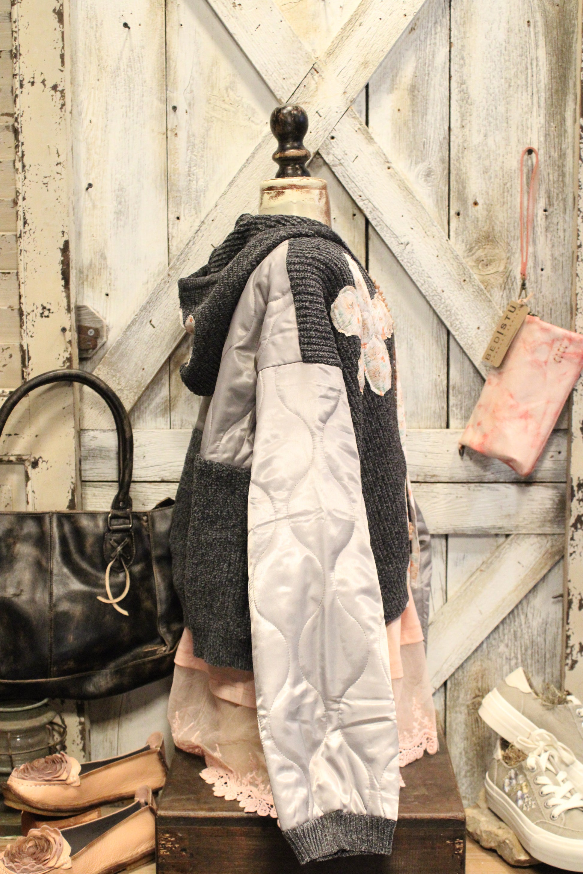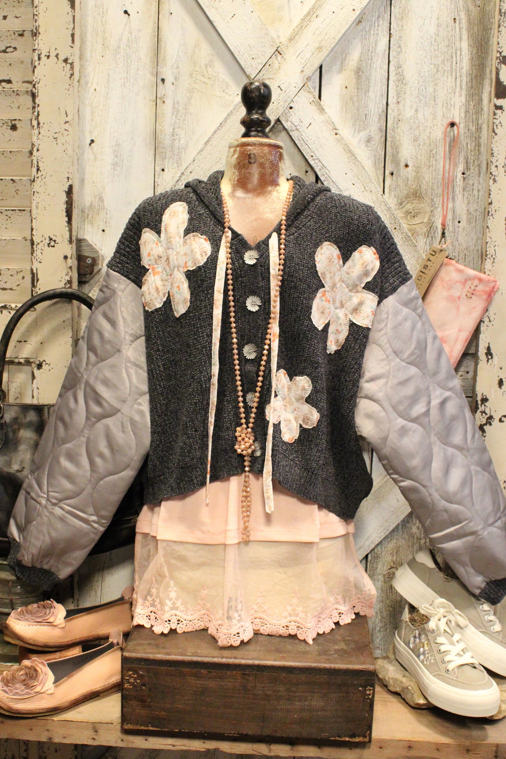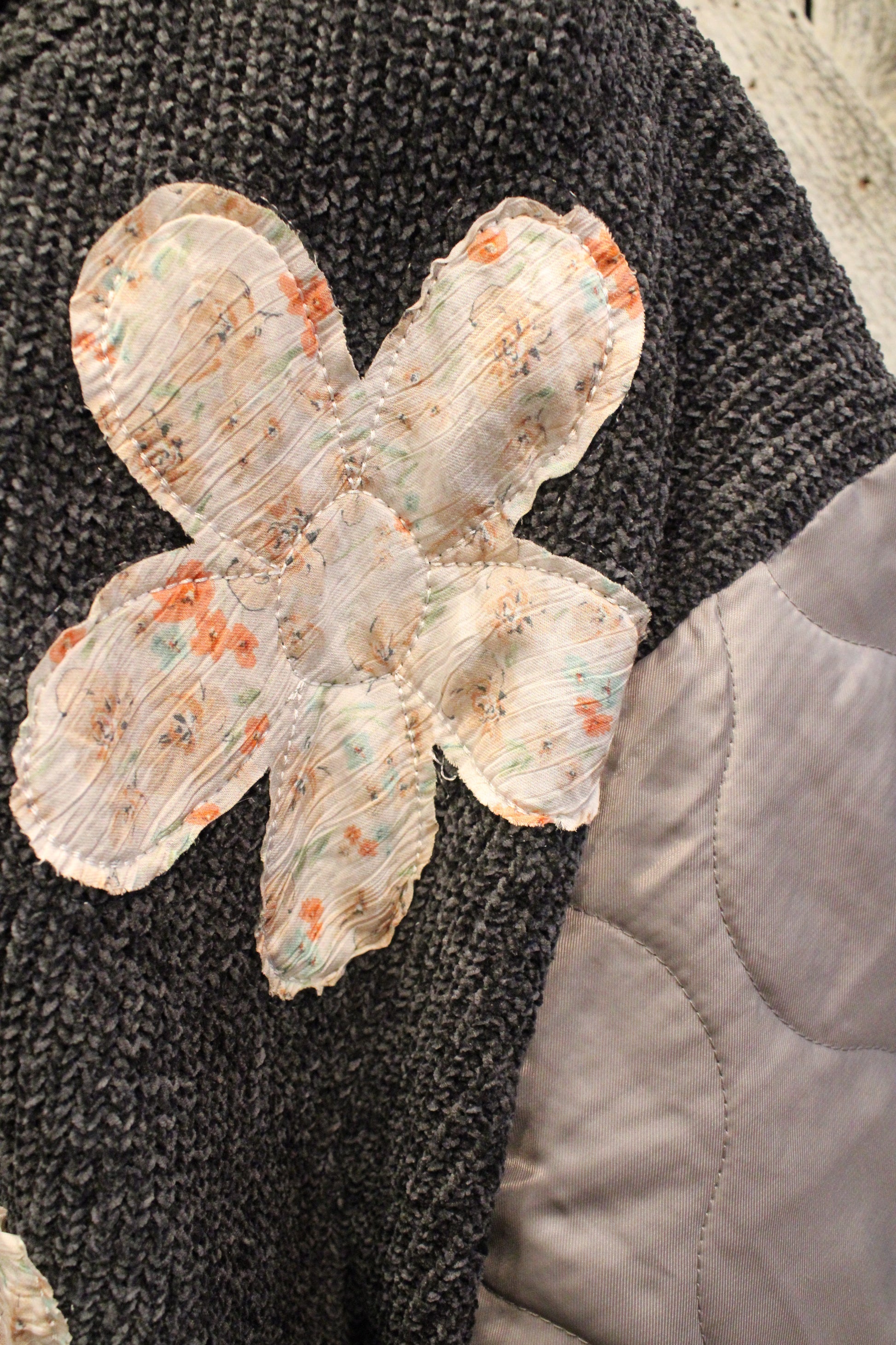 Introducing the stylish Moonflower Patchwork Bomber Jacket- This mixed-texture jacket features a soft waffle-knit body in a muted slate tone, contrasted by silky quilted sleeves in a dreamy dove gray. Delicate floral appliqués and floral-inspired buttons add just the right amount of vintage charm and artisan flair.