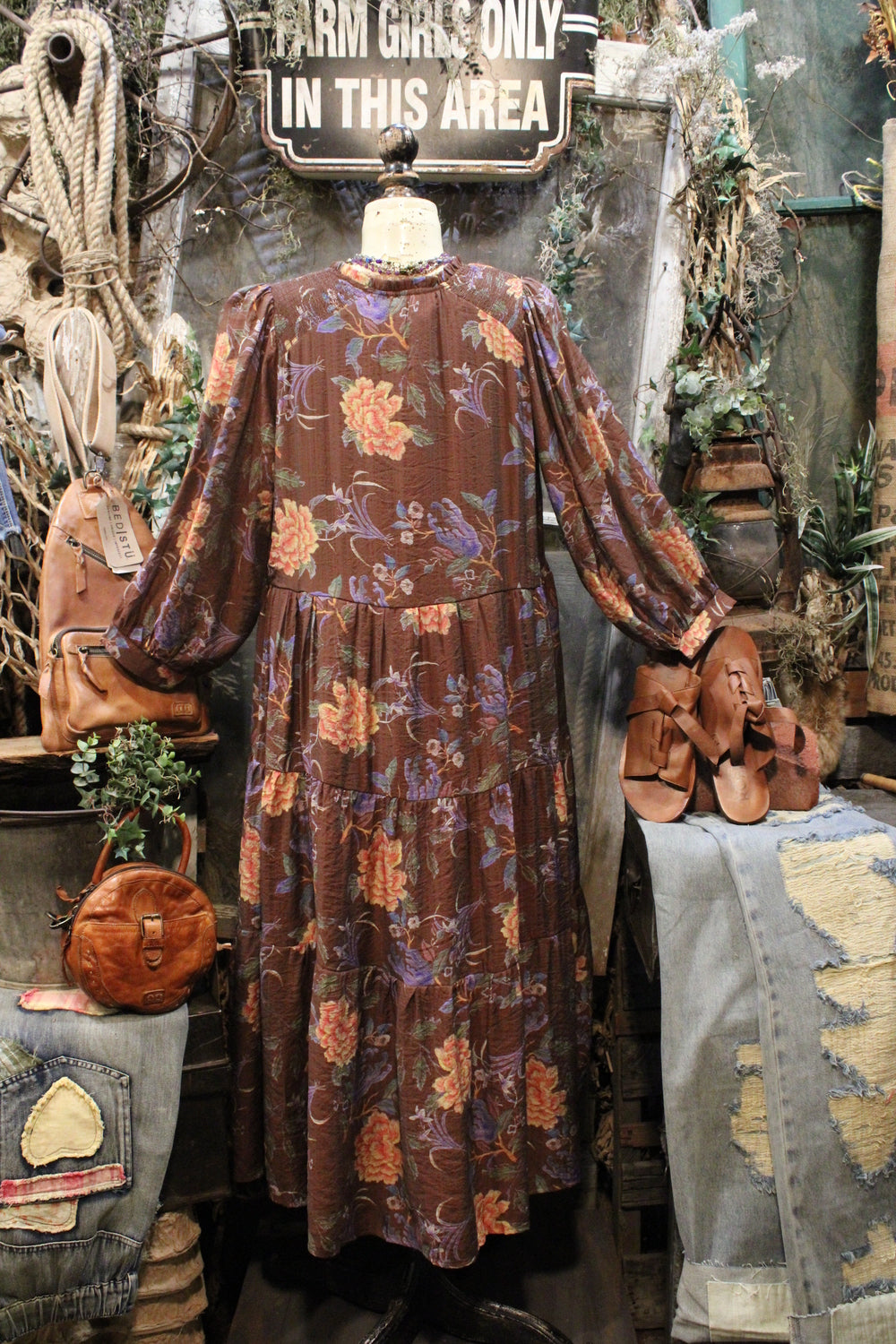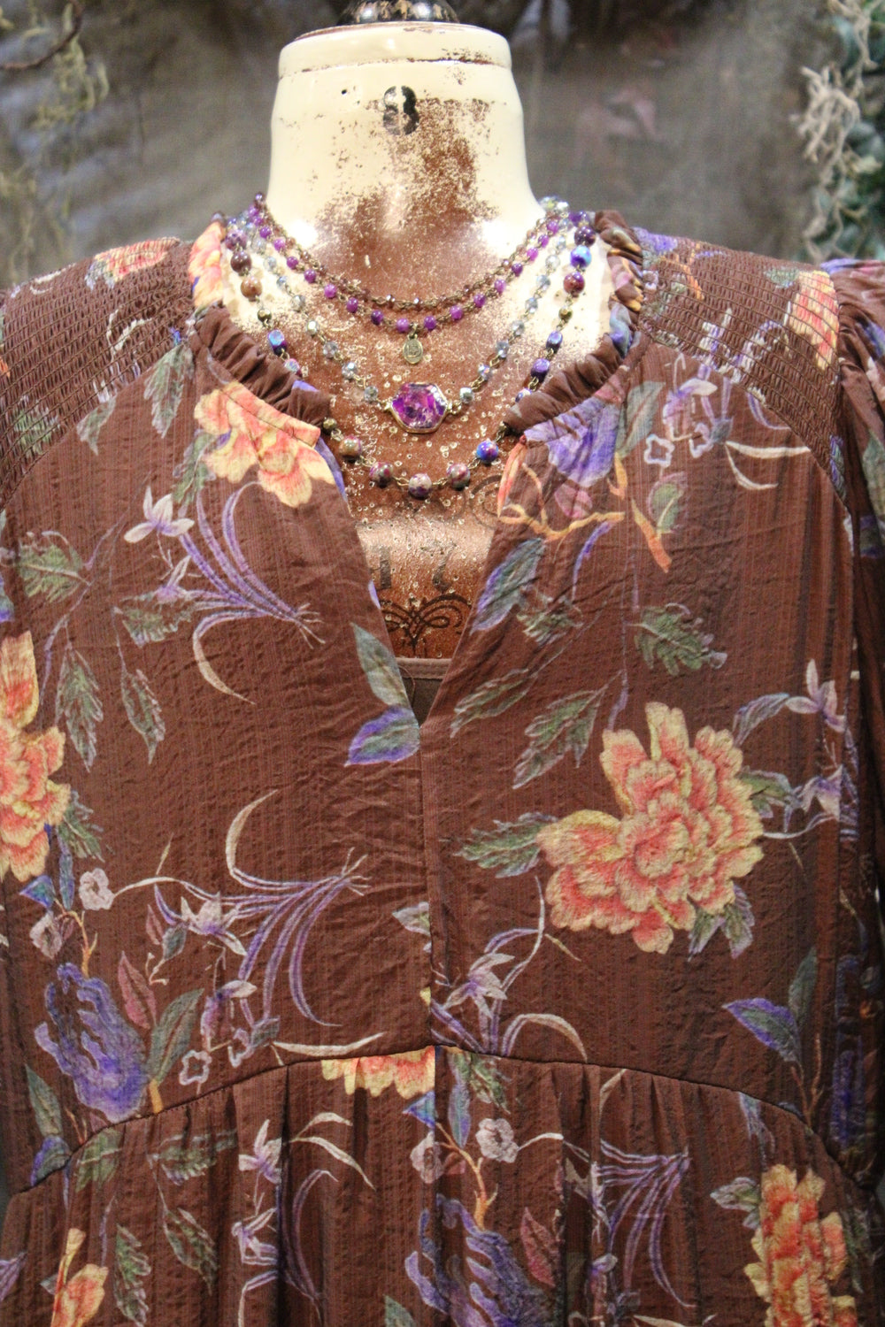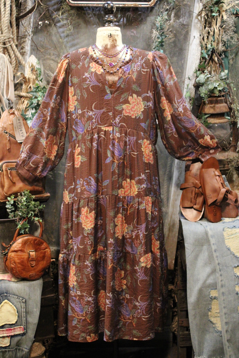 Moonlit Mum Dress- Full of charm and rich color, this dress is a must-have for days when you want comfort without sacrificing style. Set against a deep brown backdrop, the floral print bursts to life with shades of lavender, dusty rose, and golden marigold — perfect for seasonal transitions.