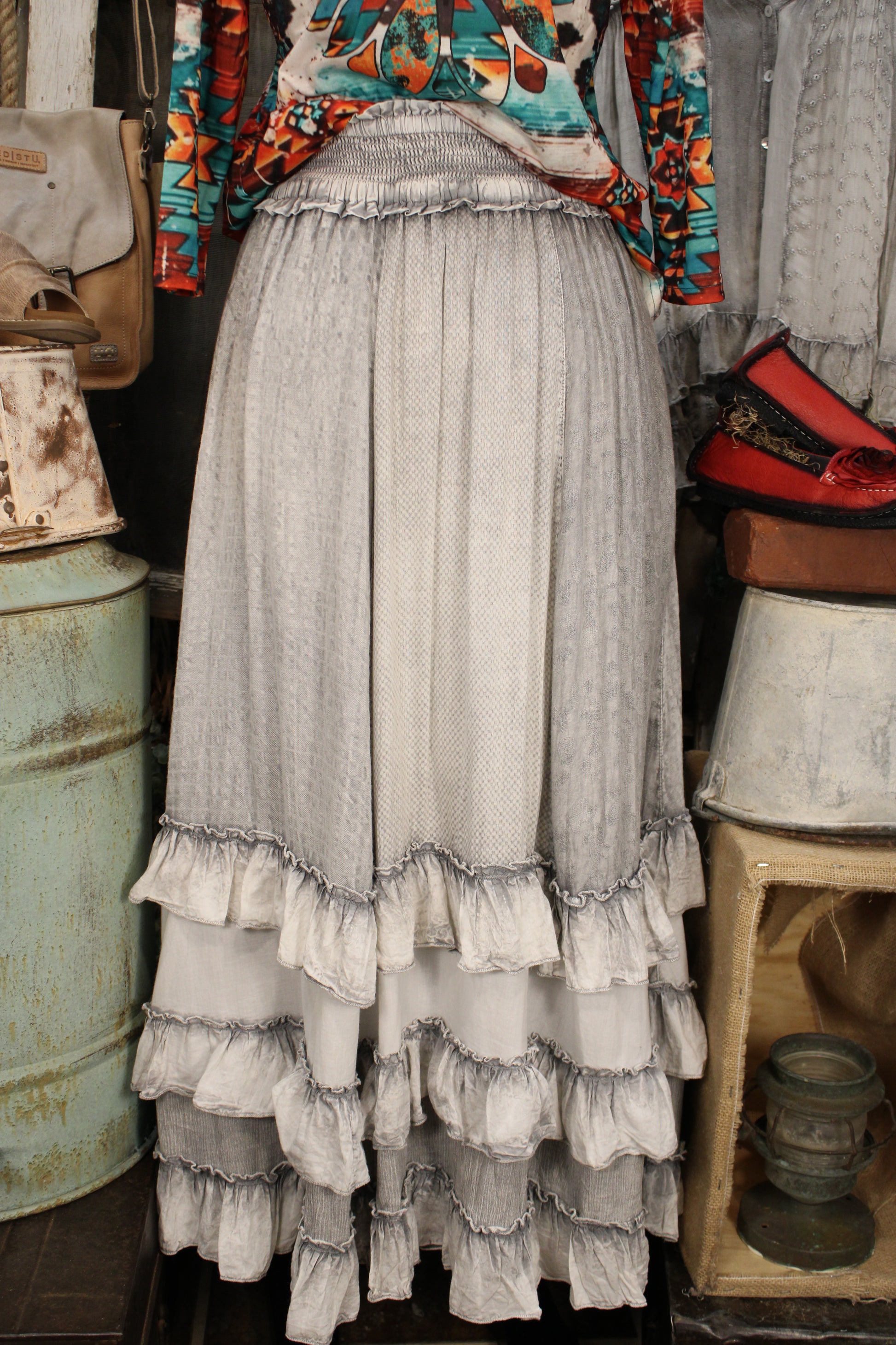 Introducing the Moonmist Maxi Skirt by Young Threads - A romantic, flowy skirt made for twirling through every season. This soft neutral maxi features a comfortable elastic waistband and cascading ruffle tiers that add beautiful movement and texture with every step. The lightweight fabric drapes effortlessly, making it easy to dress up or keep casual with your favorite graphic tee or sweater. Feminine, versatile, and full of farm-girl charm, this skirt is the kind of piece you’ll reach for again and again.