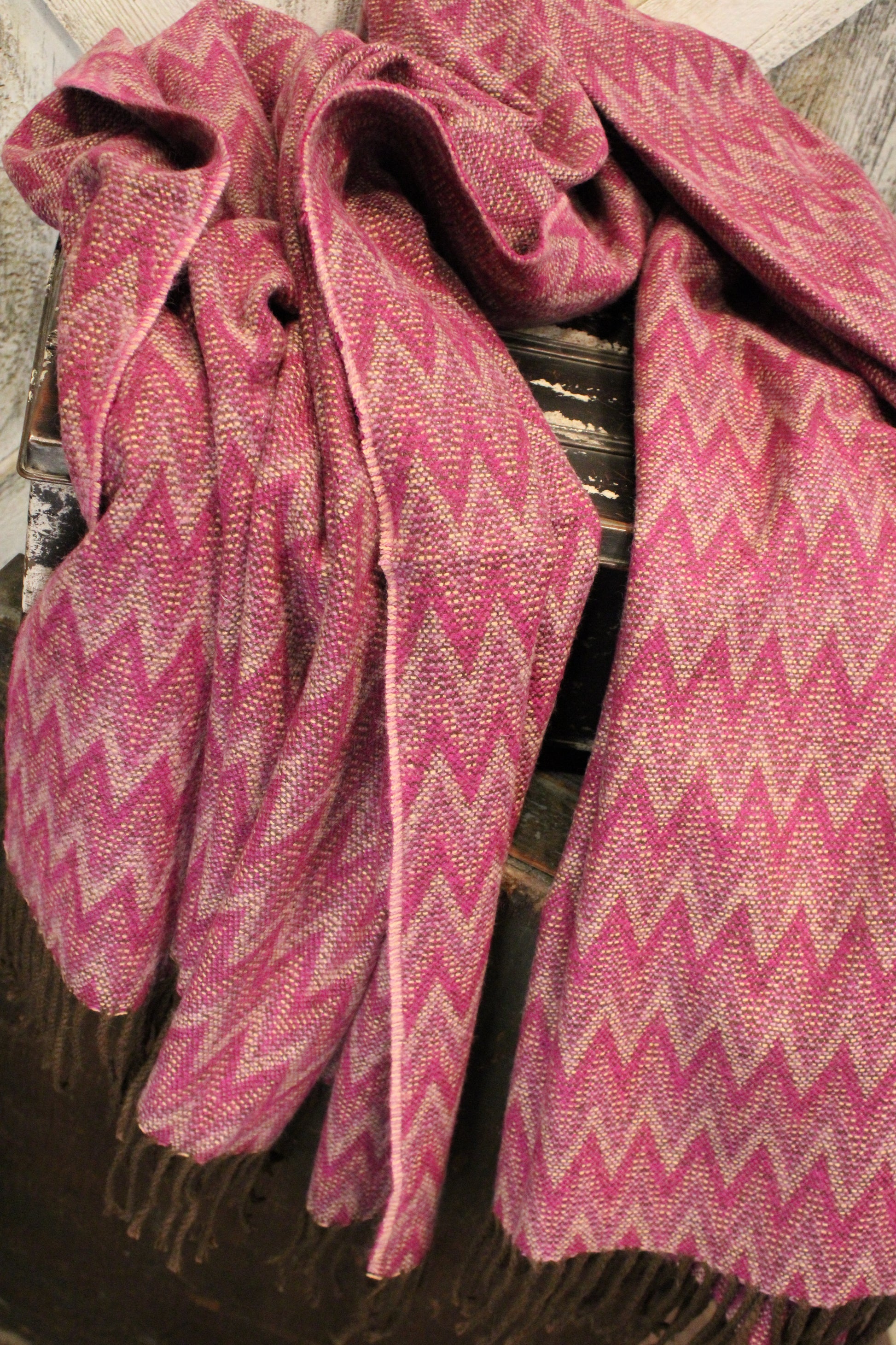 The rich pink hue and timeless zigzag weave give it a refined, artisan look that instantly elevates even the simplest outfit. Whether draped over your shoulders, wrapped snug around your neck, or styled as a statement accessory, this scarf adds effortless elegance with a cozy, western-boho feel.