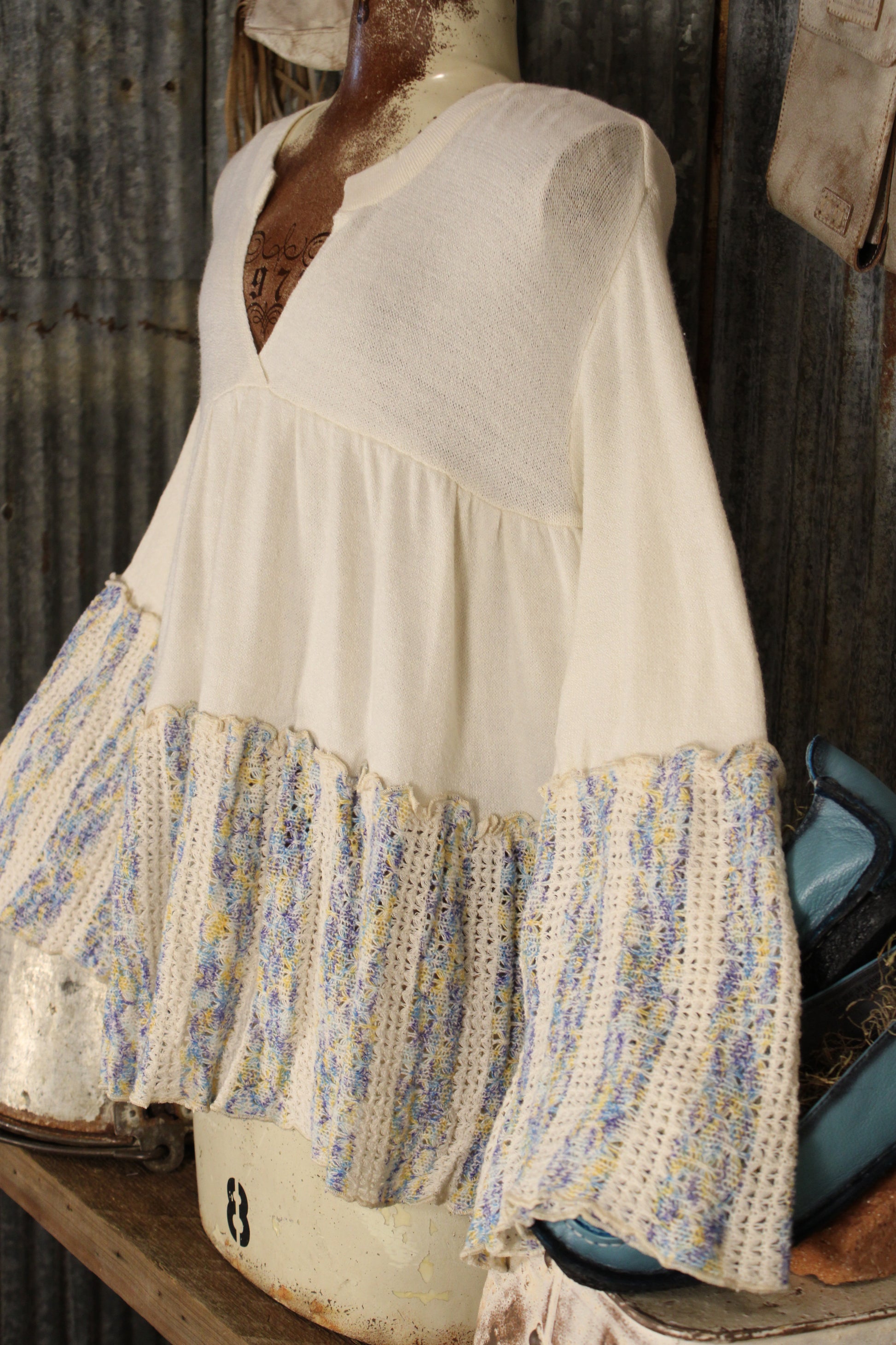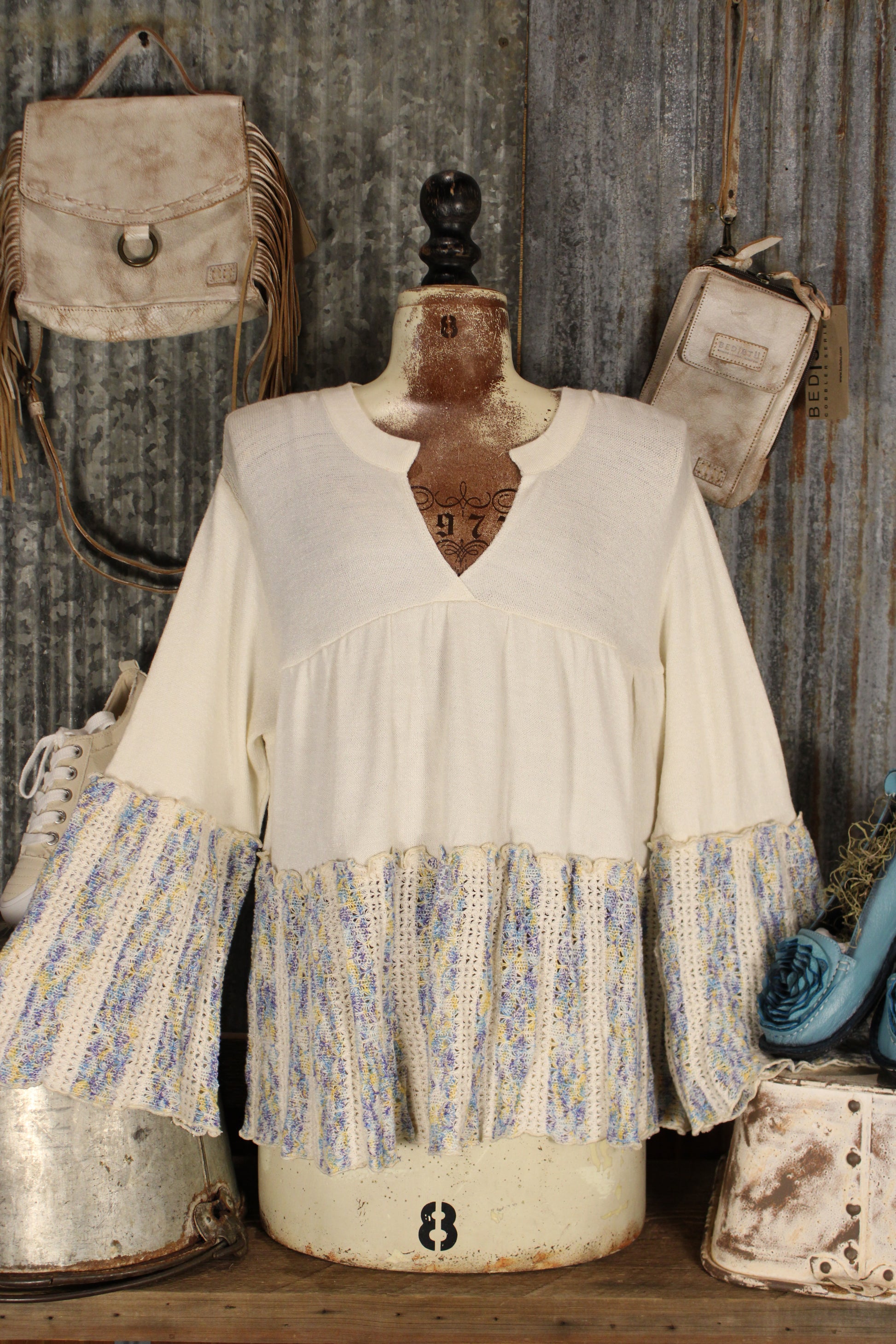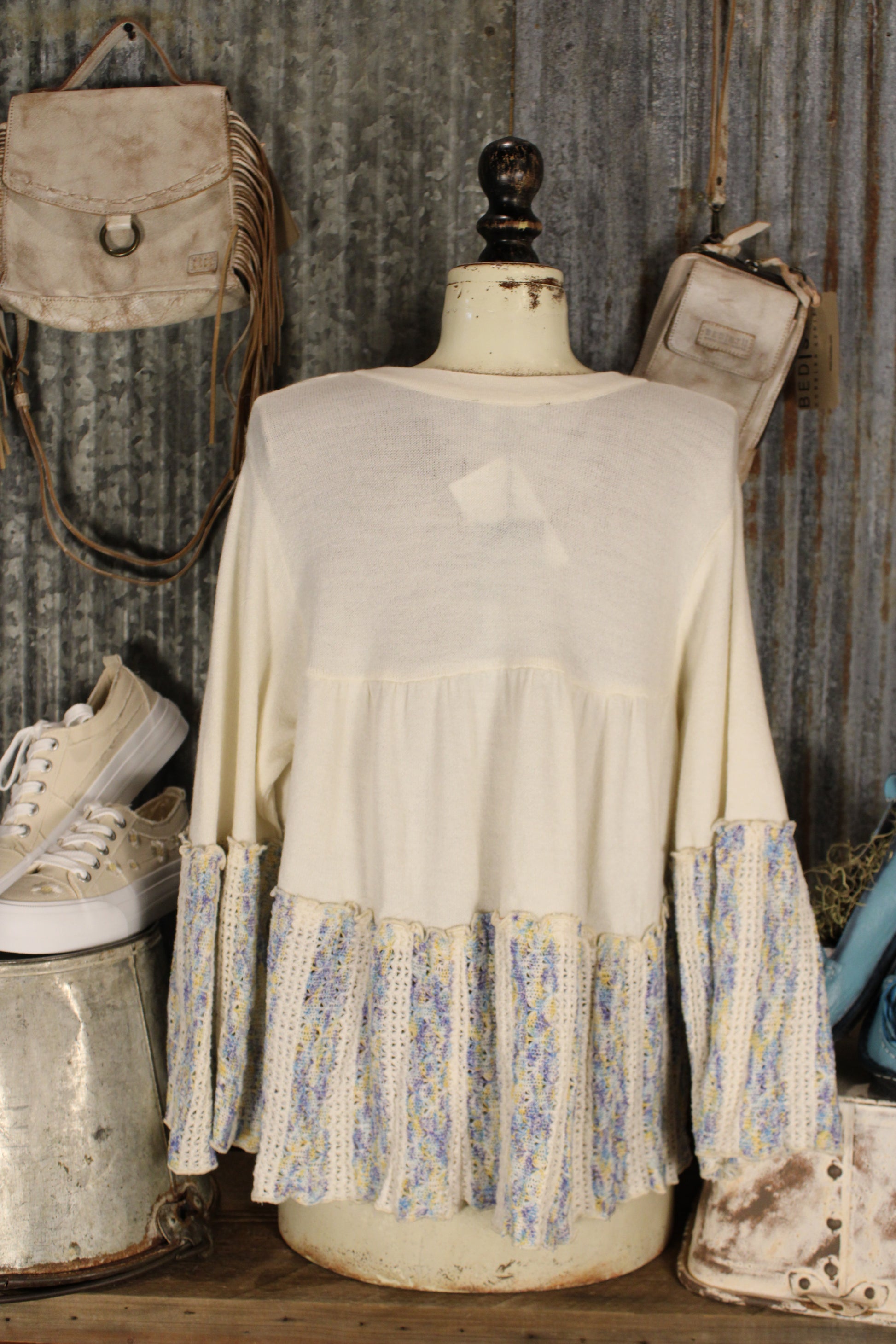 Introducing the Mystic Meadow Morning Top- This cream knit boho top brings soft texture and effortless charm to your everyday lineup. Designed with a flattering split neckline and relaxed bodice, it features statement bell sleeves and a gathered hem in a textured crochet stripe blend of soft blues, yellows, and neutrals for that perfectly layered, artisan-inspired look.