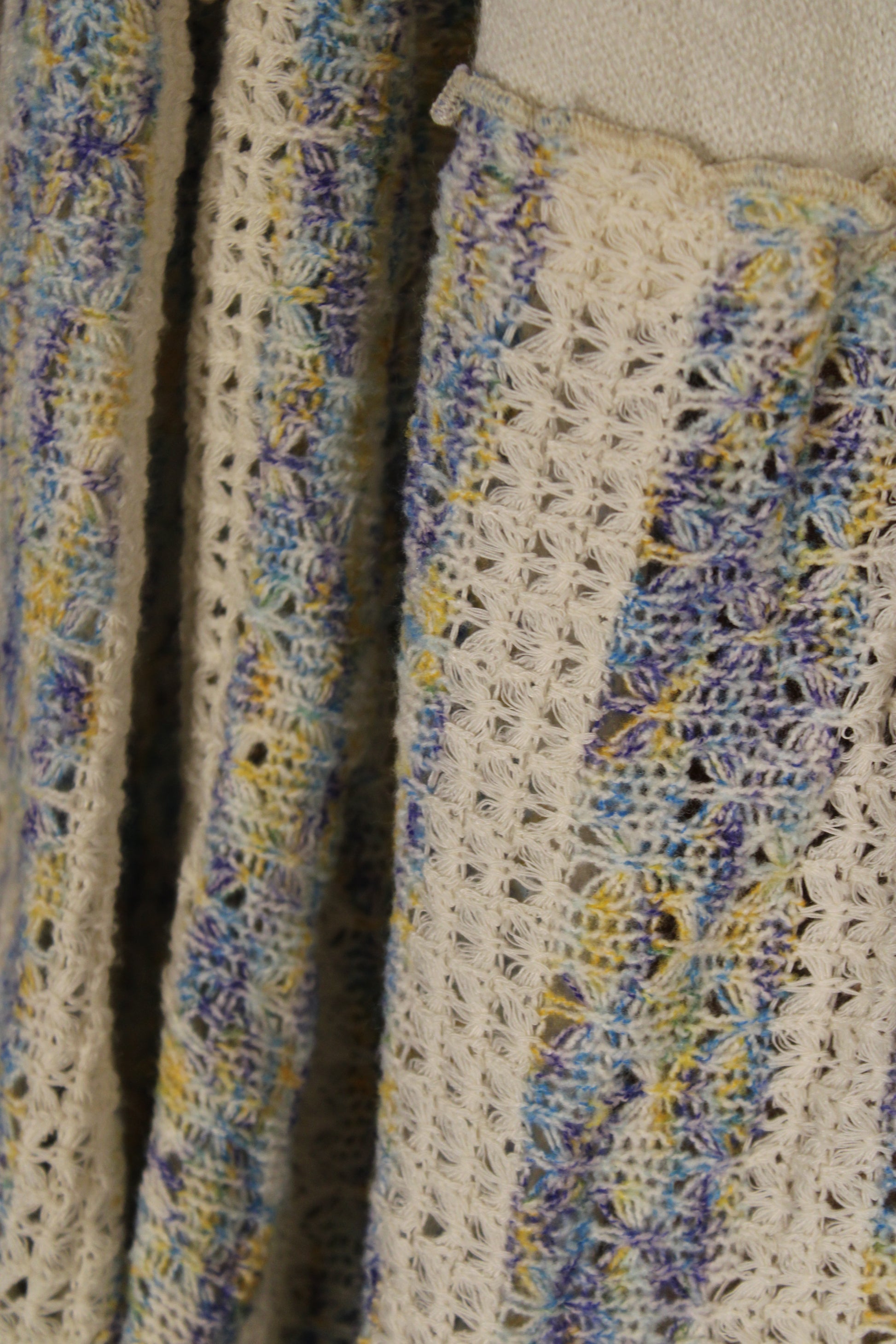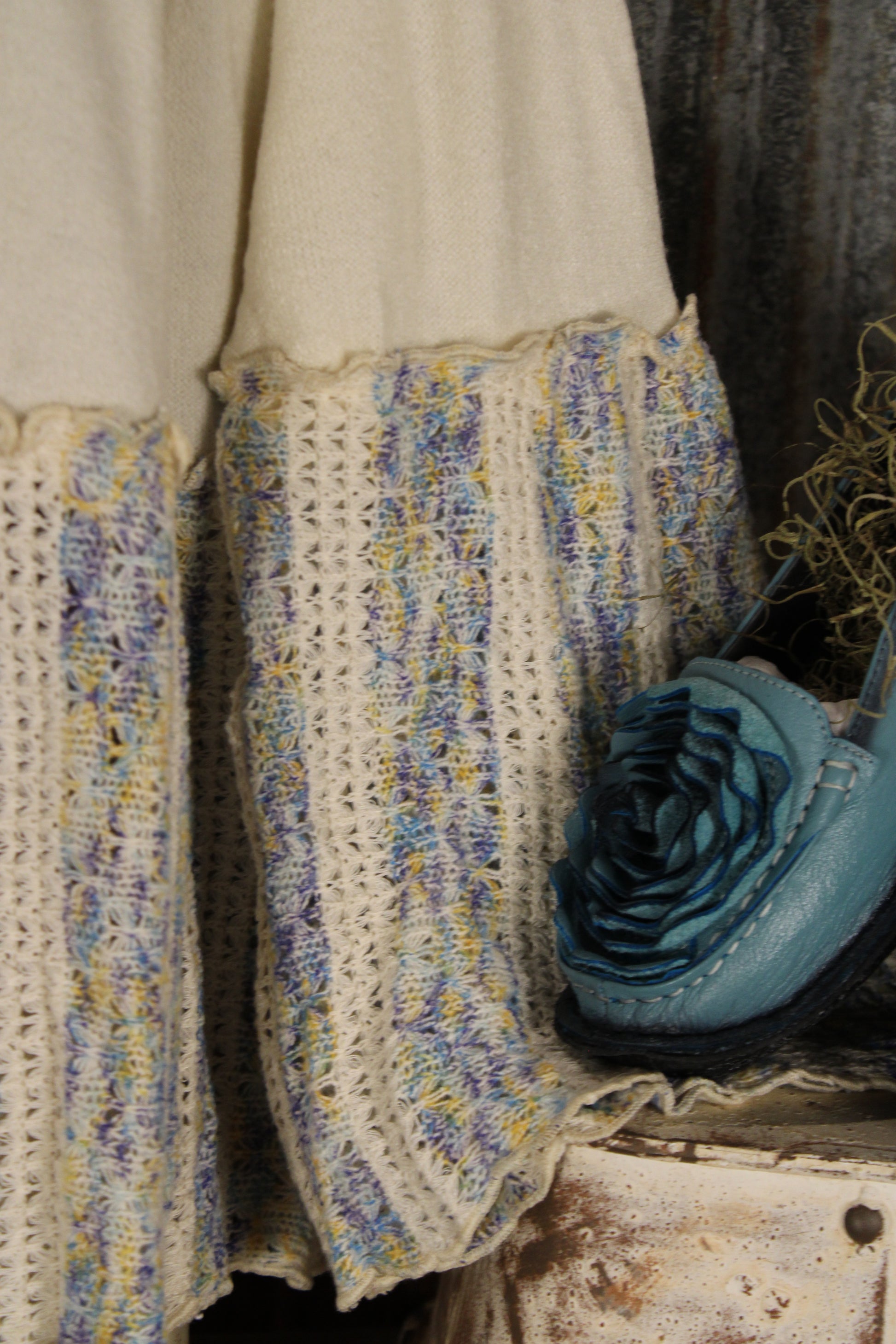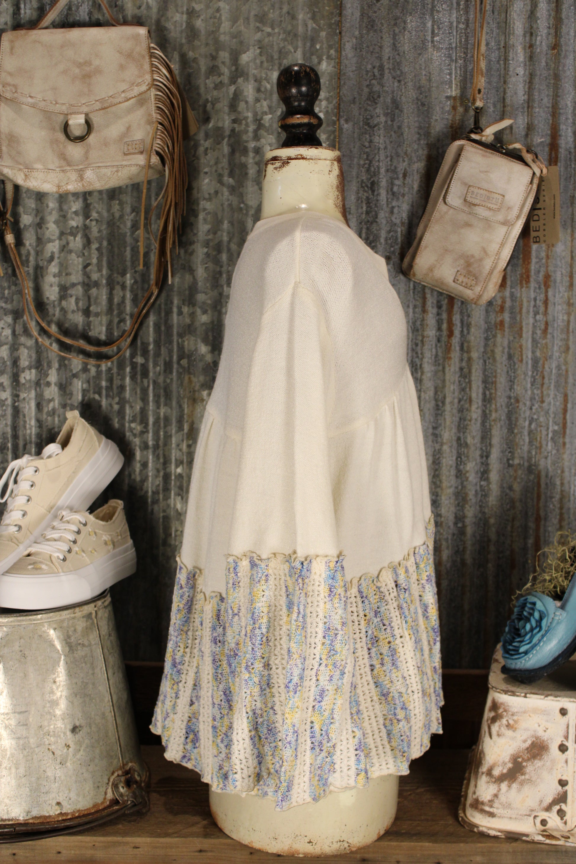 Introducing the Mystic Meadow Morning Top- This cream knit boho top brings soft texture and effortless charm to your everyday lineup. Designed with a flattering split neckline and relaxed bodice, it features statement bell sleeves and a gathered hem in a textured crochet stripe blend of soft blues, yellows, and neutrals for that perfectly layered, artisan-inspired look.