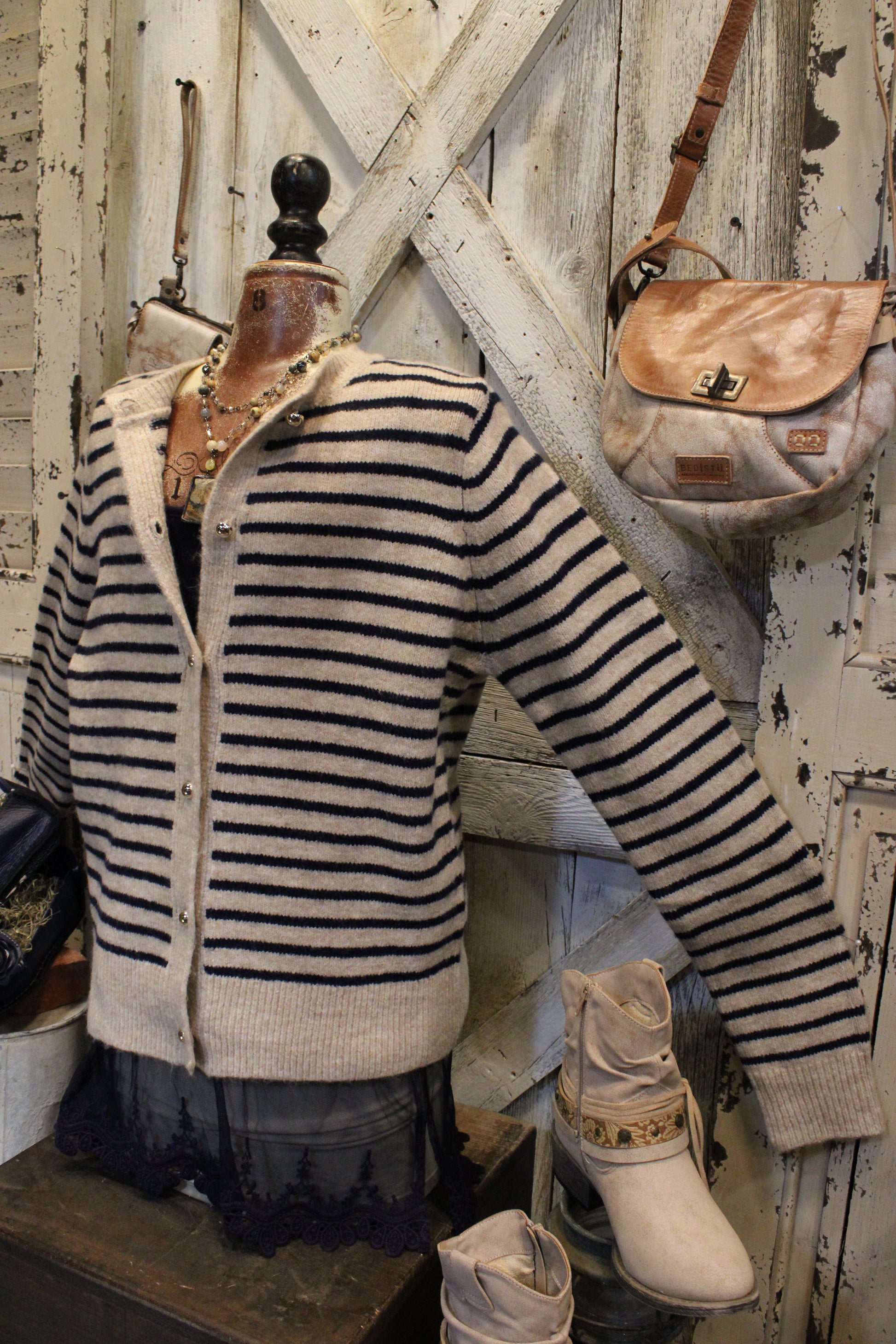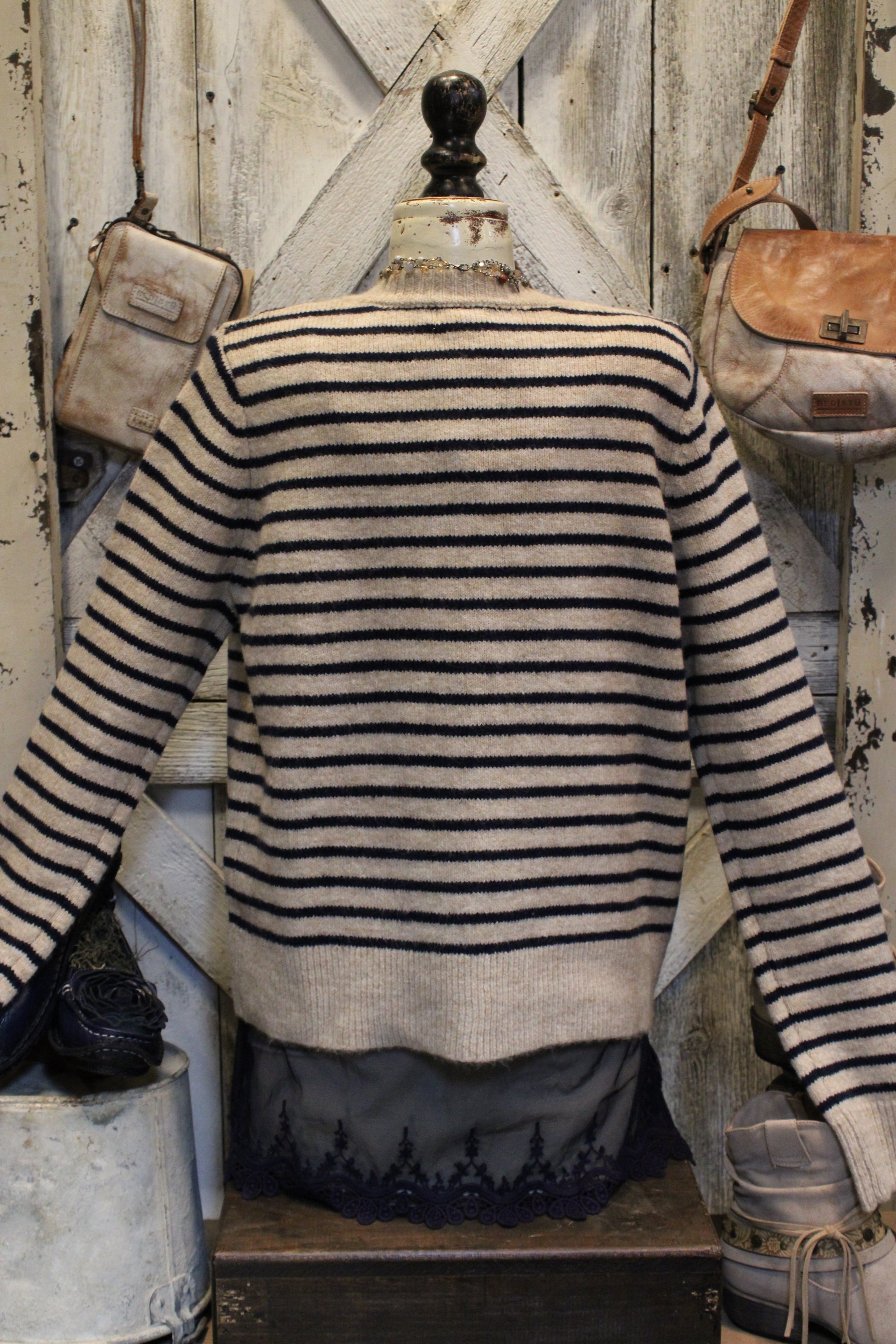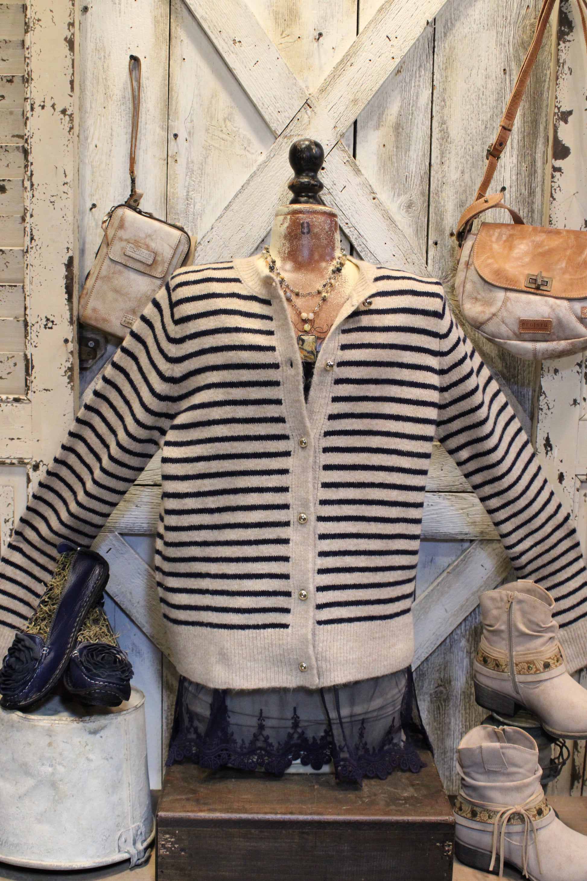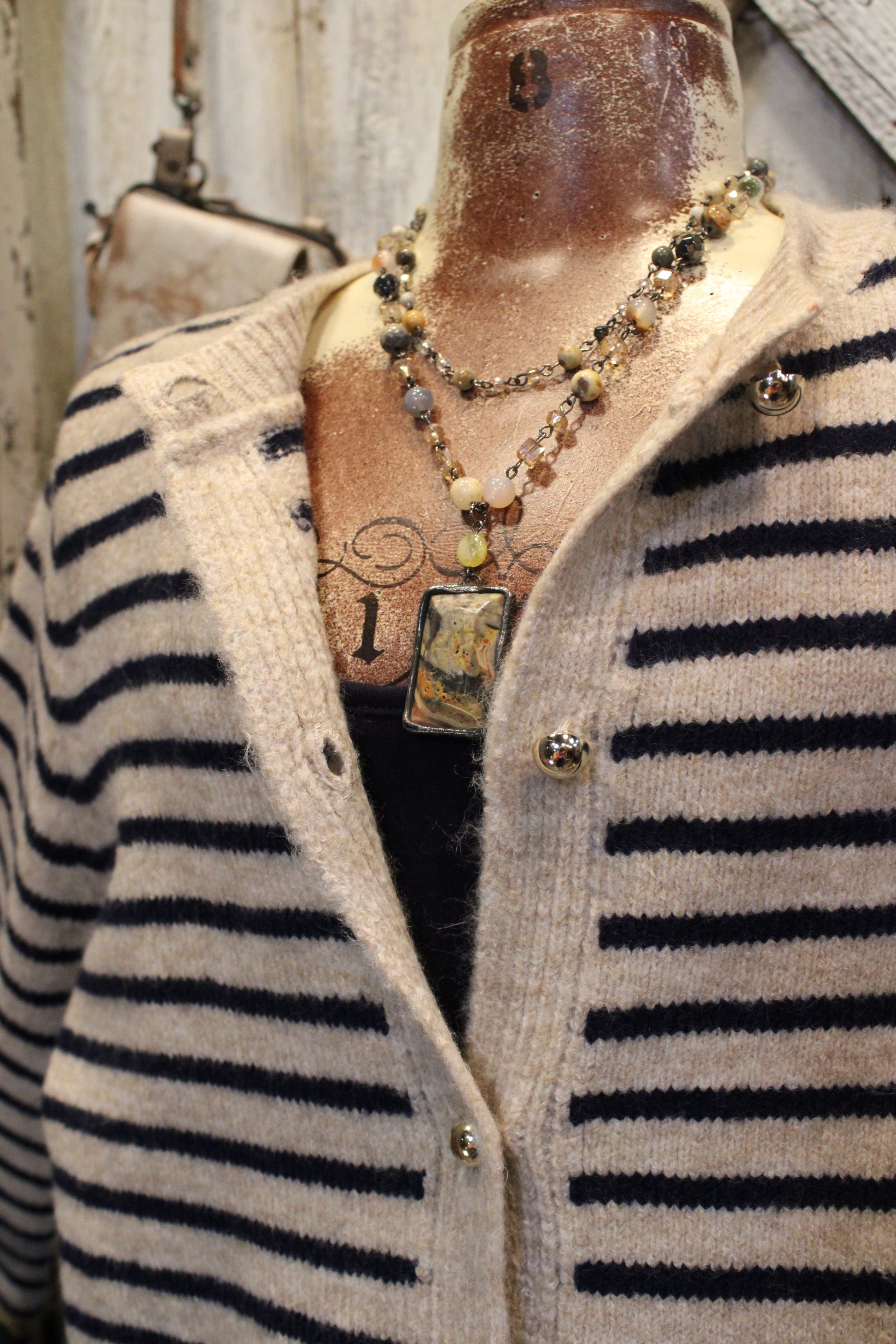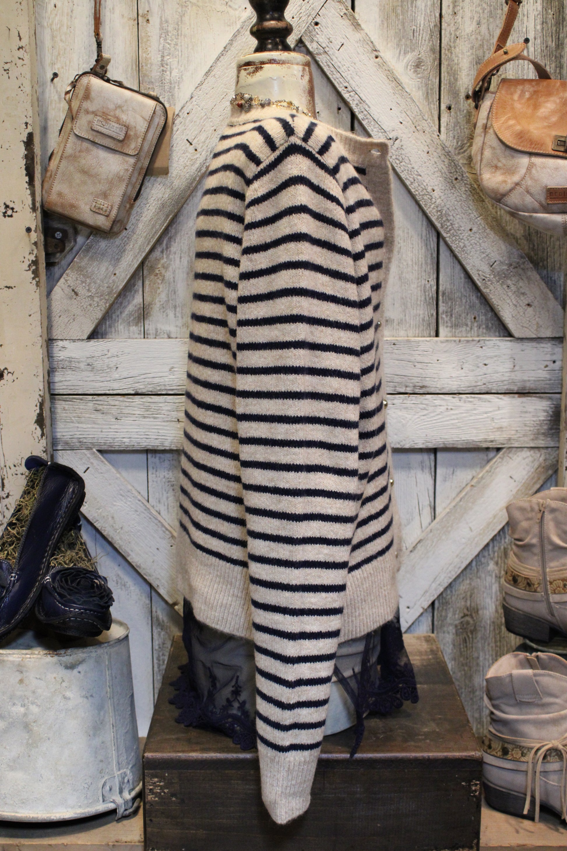 Introducing the Off We Go Cardigan- Effortlessly chic and timeless, this striped button-up cardigan is a must-have staple for your year-round wardrobe. Crafted from a soft and cozy knit, this cardigan features classic horizontal navy stripes against a warm tan base, giving it a versatile nautical-inspired look.