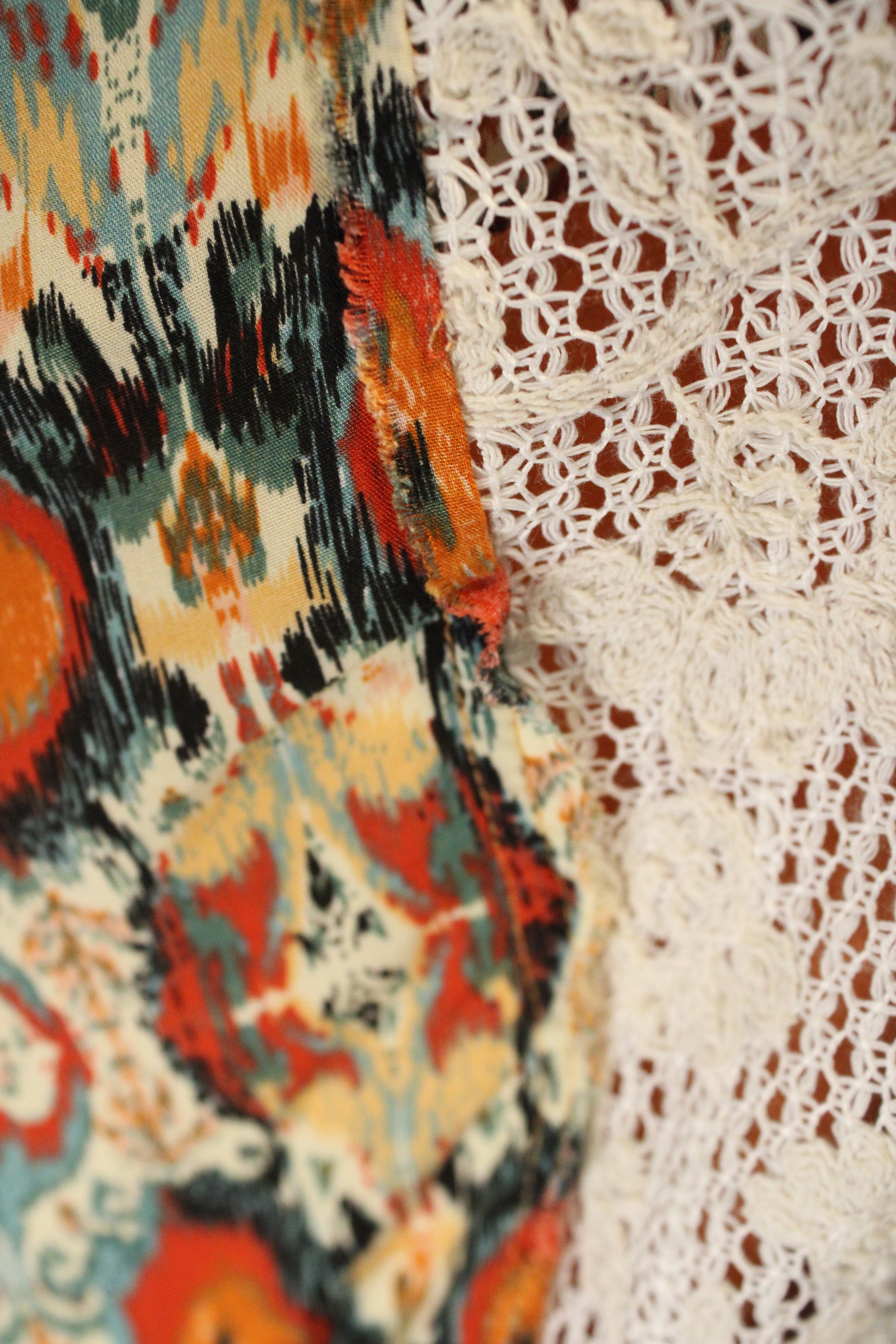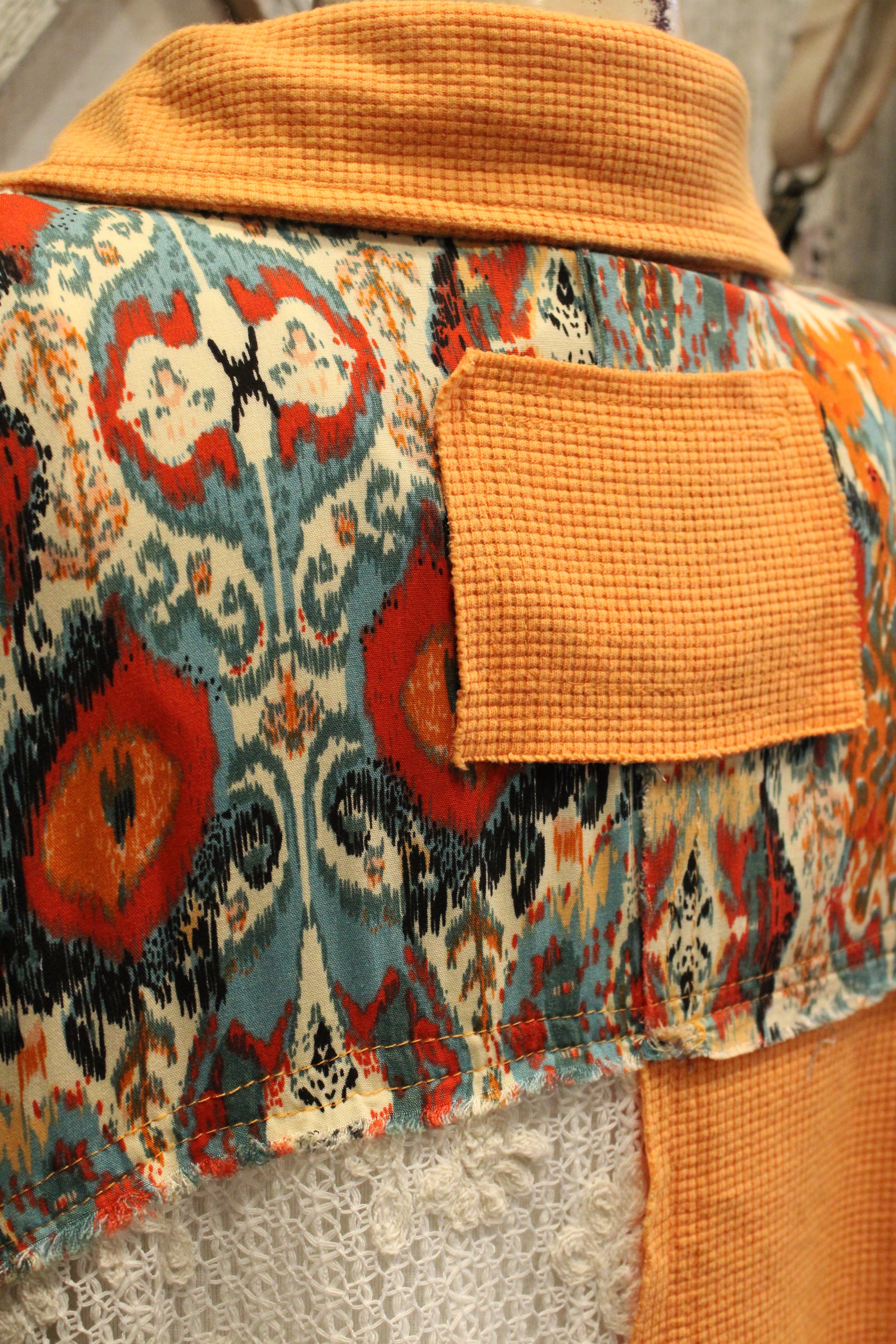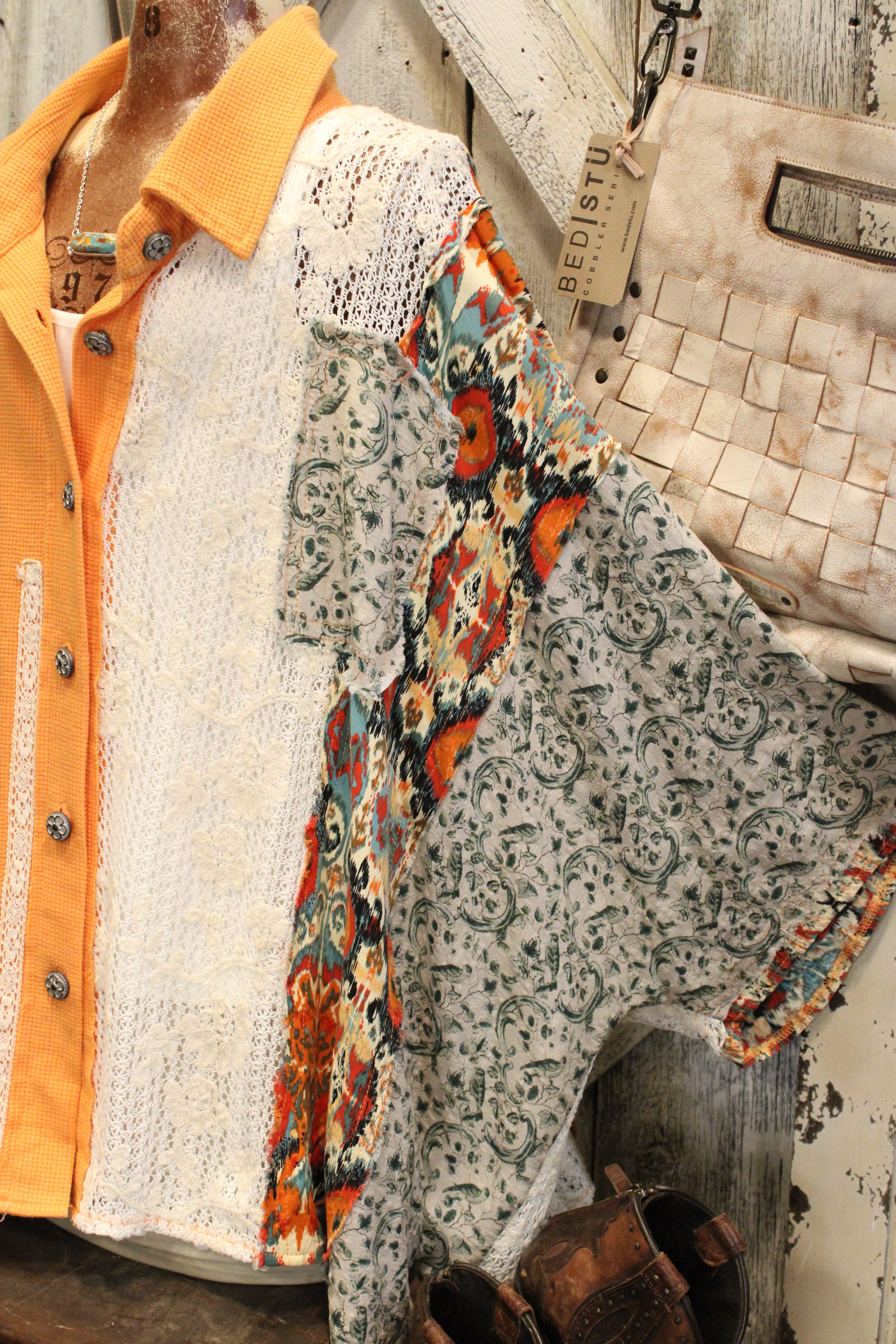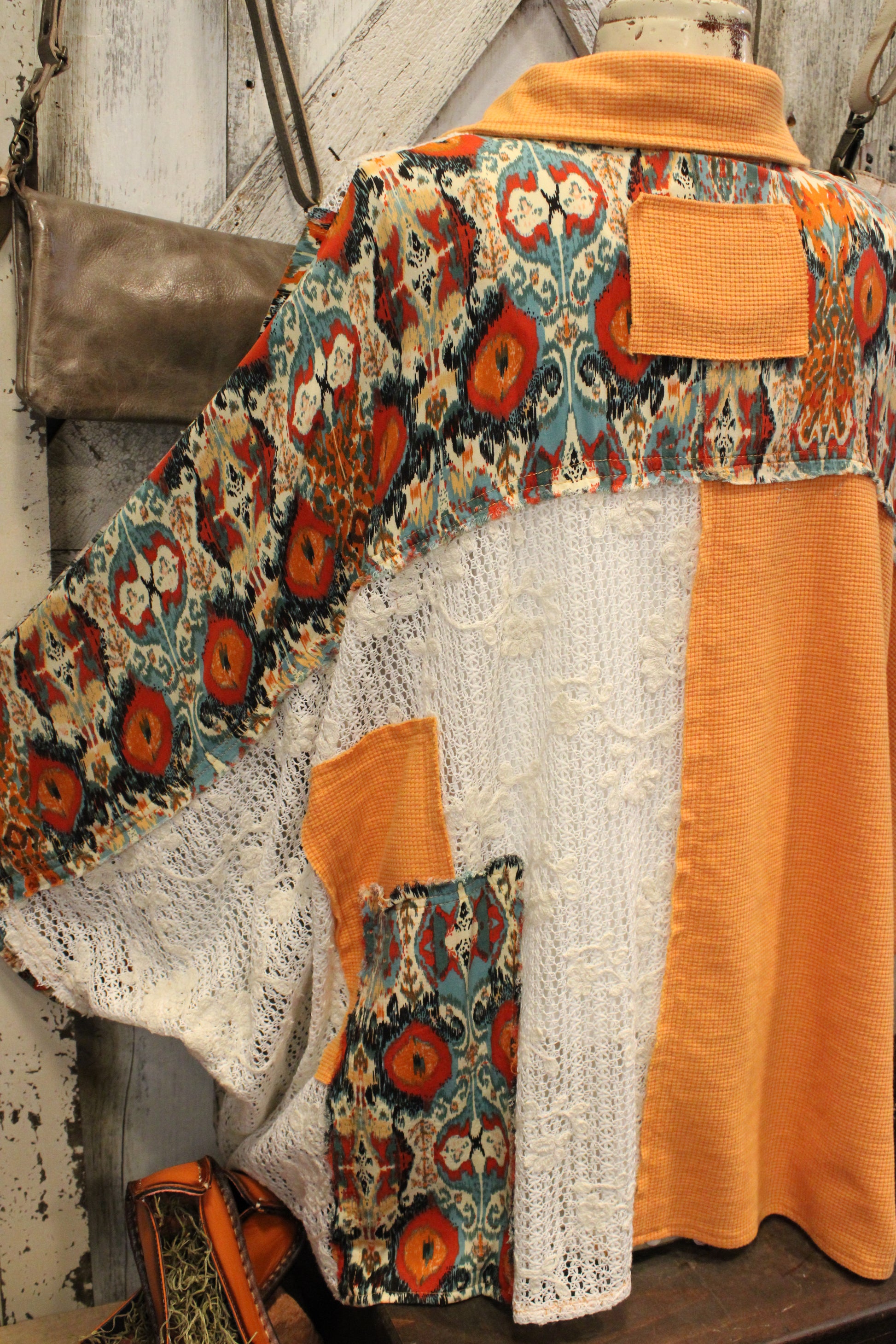 Introducing the Orange You Glad Top- This one-of-a-kind top blends warm autumn tones with lace details and bold patterned panels for a look that’s farmhouse-chic with a touch of boho flair. The mustardy-orange base sets the stage while vintage-inspired florals and soft lace inserts make every angle interesting. A relaxed, flowy fit and easy button-front design keep it comfy and versatile—wear it open as a lightweight layer or buttoned up as a statement blouse.