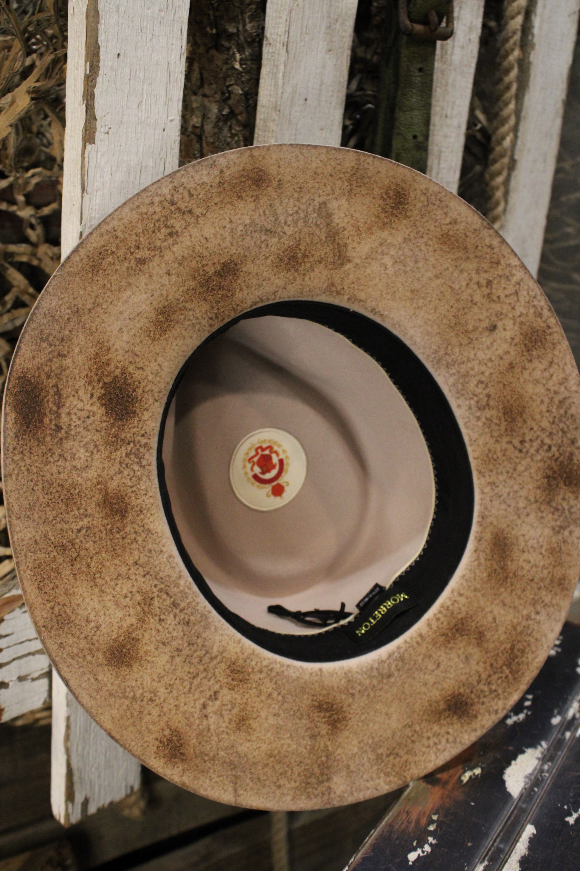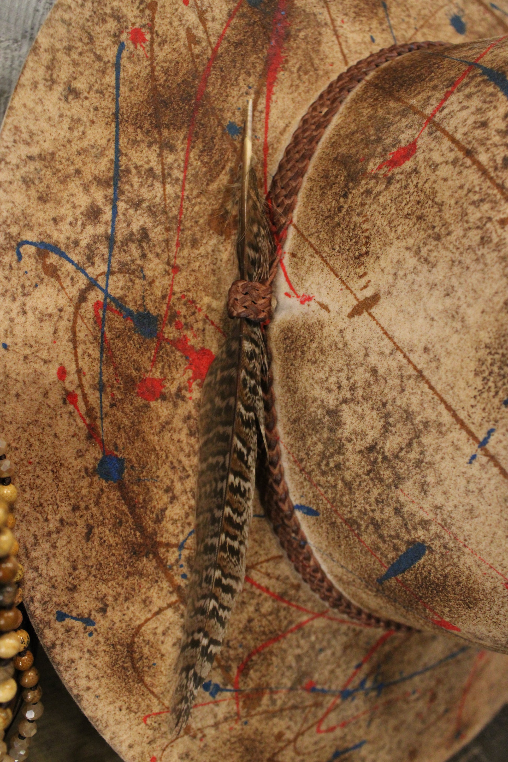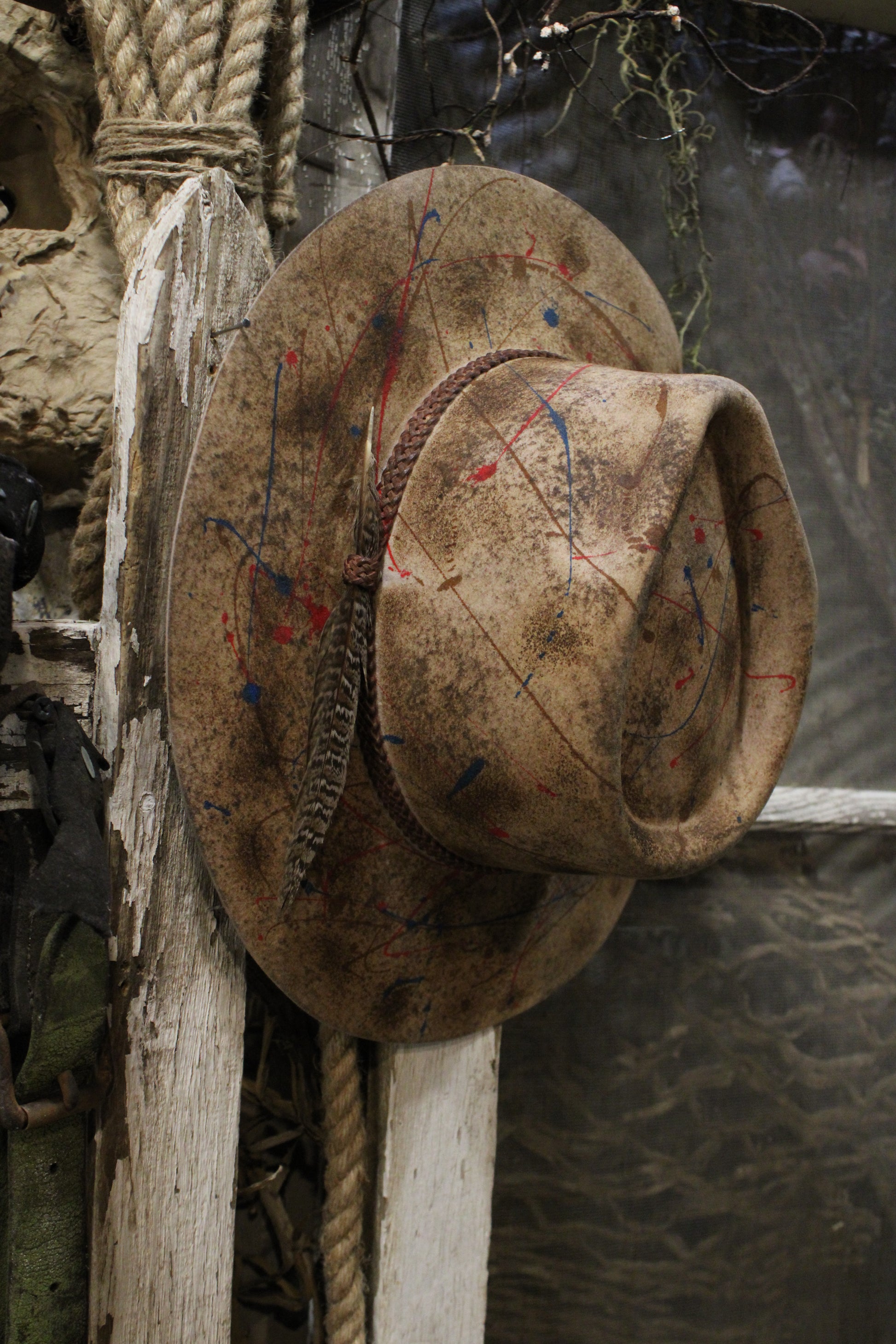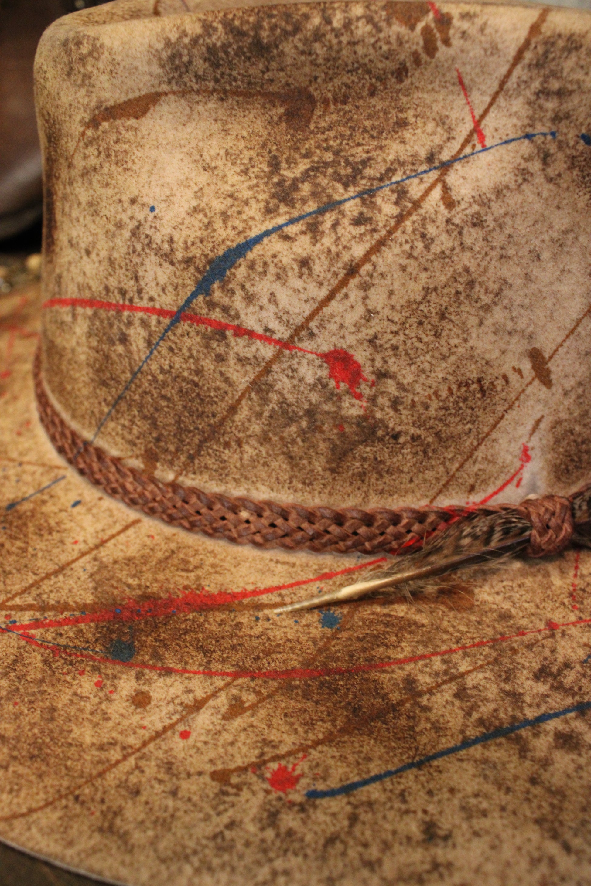Introducing our Paint The Town Fedora- A true one-of-a-kind piece that blends rugged cowgirl charm with bold artistic vibes. This distressed tan hat features hand-splattered paint details in red and blue, making every hat as unique as the gal who wears it. The braided hatband and feather accent add just the right touch of boho-western flair.