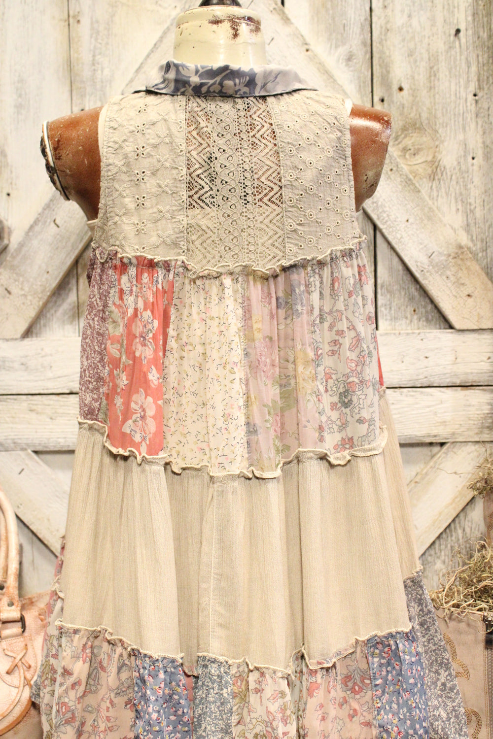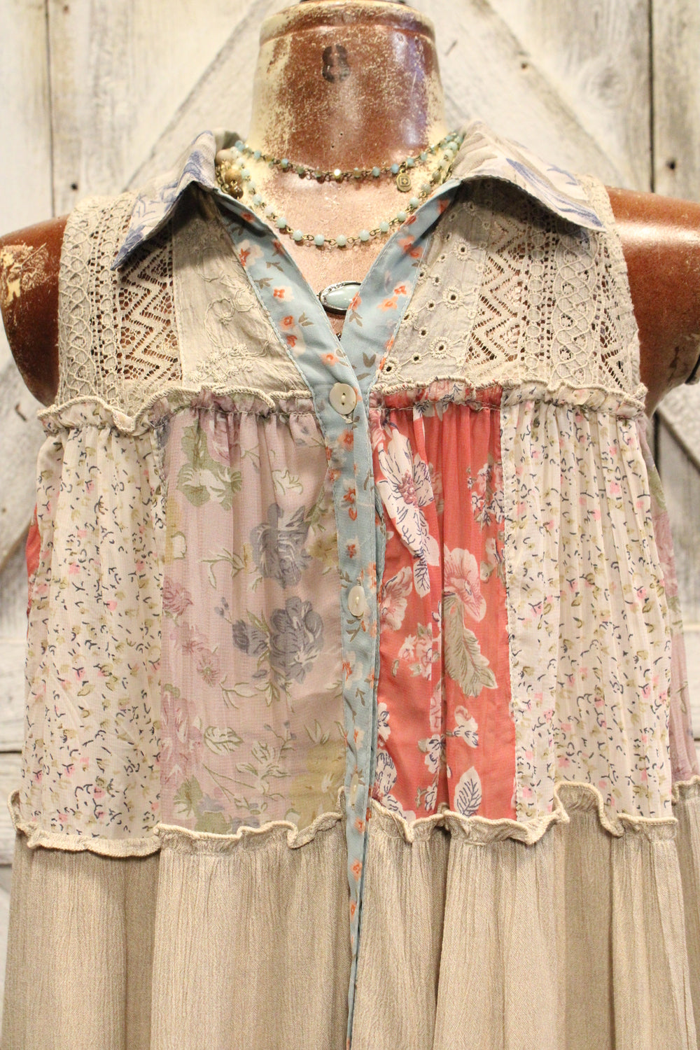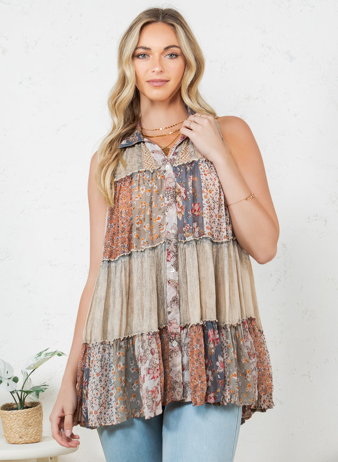 Introducing our Patchwork Meadow Latte Tank - Bring a bohemian touch to your wardrobe with this patchwork tank top. Featuring a loose, flowy fit, this sleeveless top has a button-down front and a relaxed shape for comfortable, everyday wear. The tiered patchwork design combines floral and textured patterns in warm, earthy tones, giving it a handcrafted, artsy vibe. Perfect for pairing with jeans, shorts, or skirts, this tank adds unique style to any casual outfit.