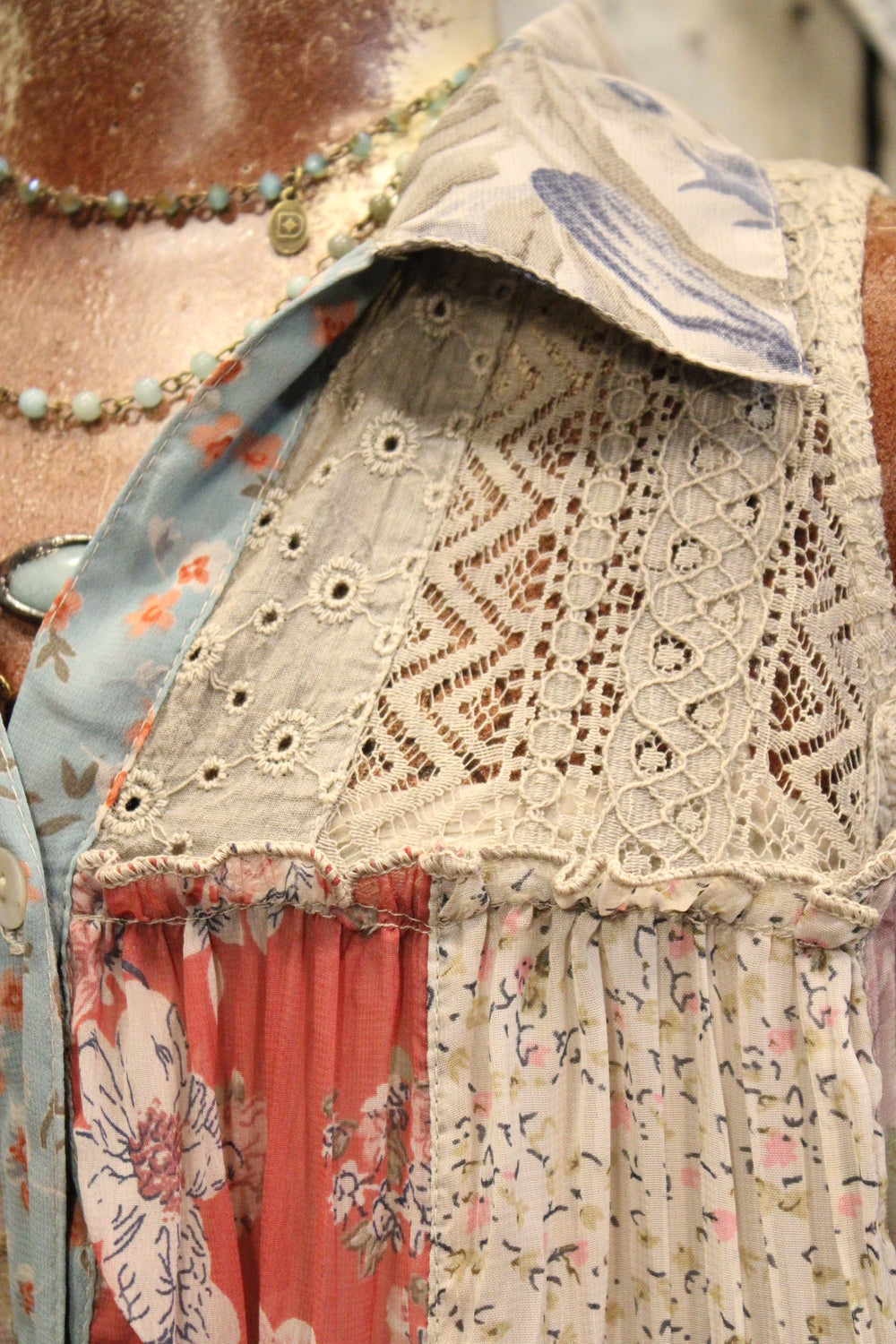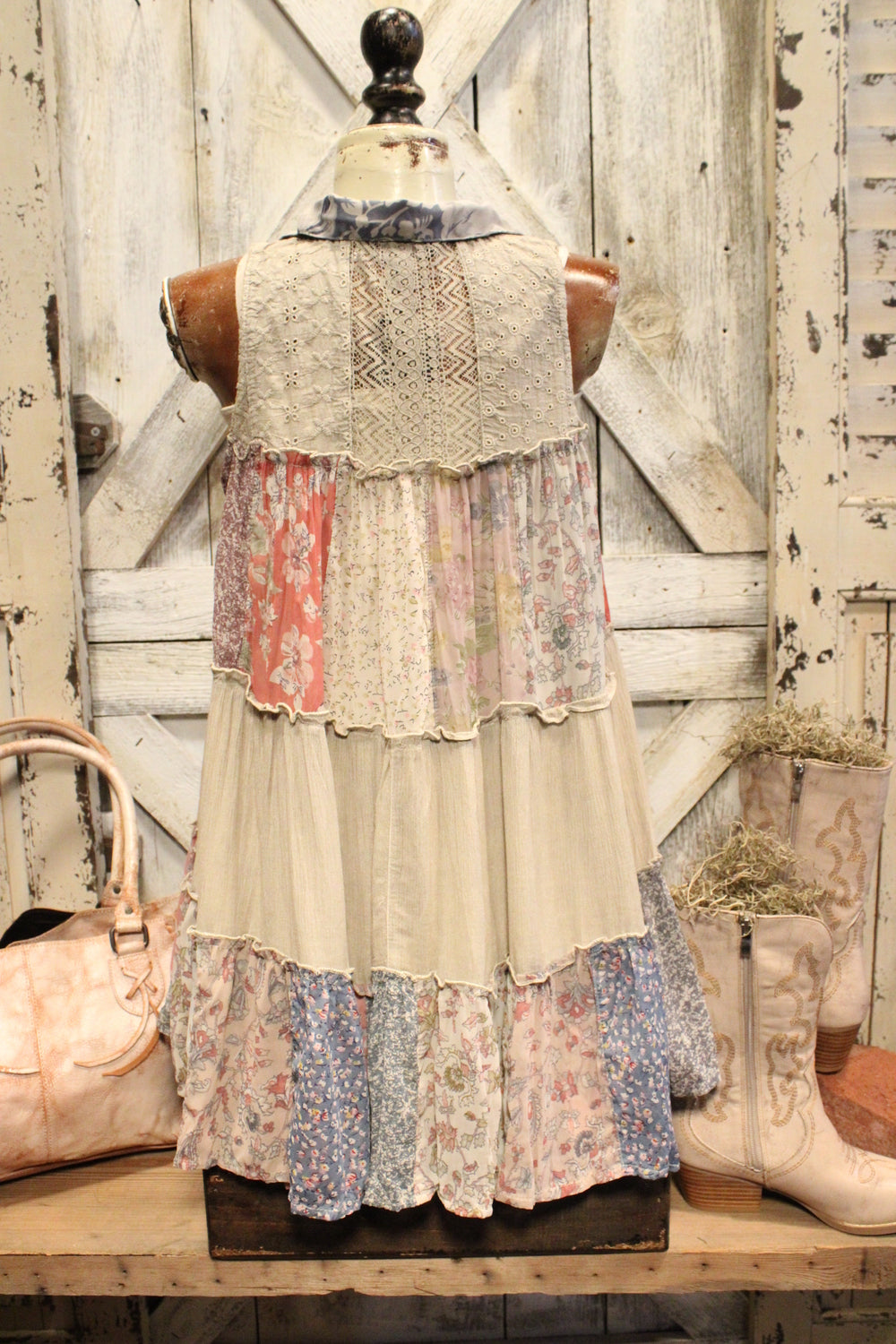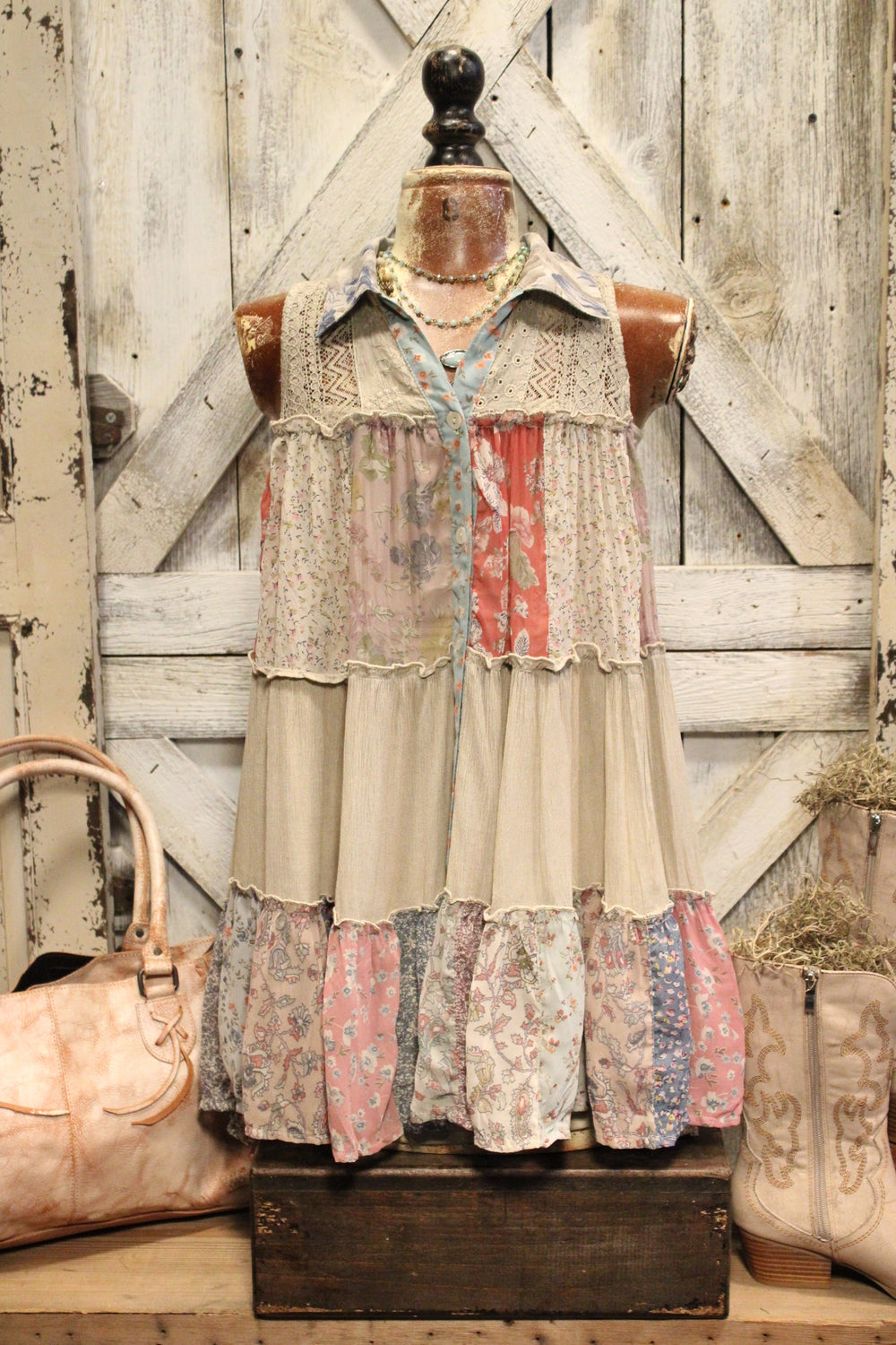 Introducing our Patchwork Meadow Latte Tank - Bring a bohemian touch to your wardrobe with this patchwork tank top. Featuring a loose, flowy fit, this sleeveless top has a button-down front and a relaxed shape for comfortable, everyday wear. The tiered patchwork design combines floral and textured patterns in warm, earthy tones, giving it a handcrafted, artsy vibe. Perfect for pairing with jeans, shorts, or skirts, this tank adds unique style to any casual outfit.