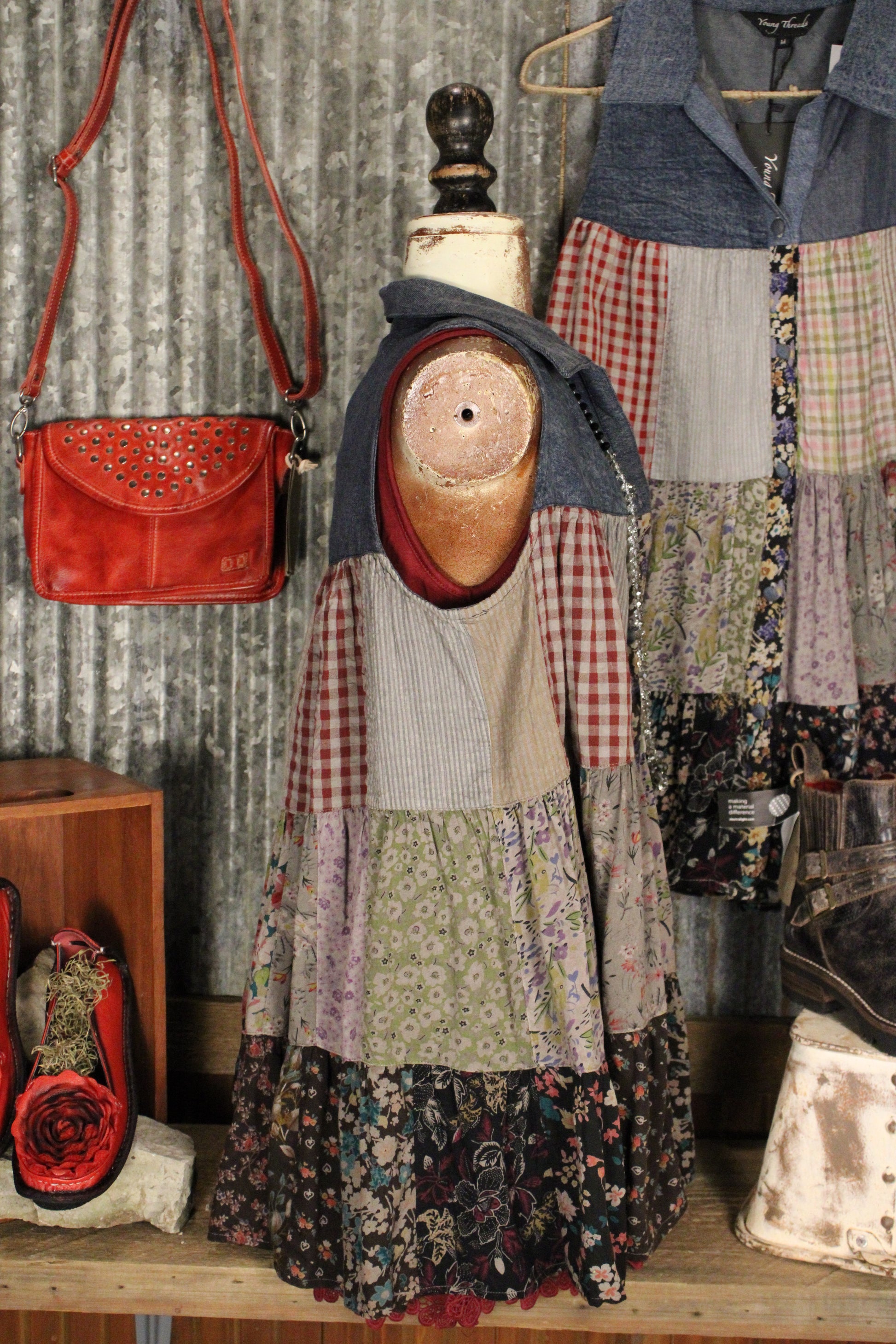 Perfect for layering with a lace top, bralette, or wearing solo on warmer days, this patchwork midi dress pairs effortlessly with boots for that signature Farm Girl look. A true statement piece for the girl who loves color, texture, and a little country soul in her wardrobe.