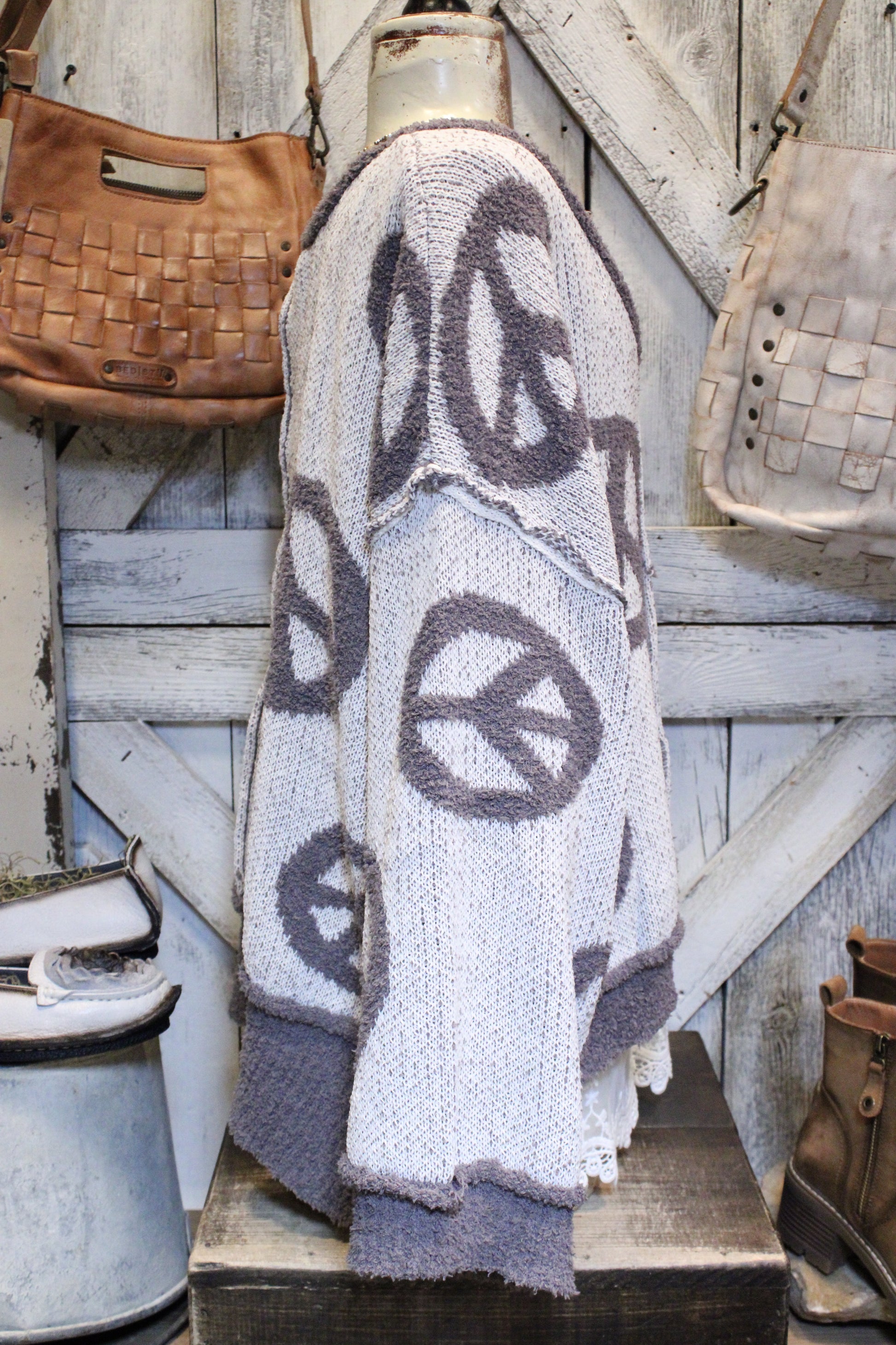 Introducing the Peace & Cozy Sweater- This relaxed-fit knit brings all the good energy with its soft neutral tones and oversized peace-sign design. Featuring a comfy V-neckline, dropped shoulders, and the perfect slouchy shape — it’s that effortlessly cool piece you’ll reach for again and again.
