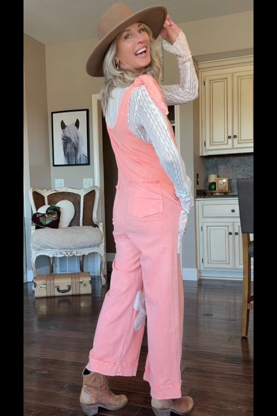 Introducing the Peach Blossom Jumpsuit- This playful floral jumpsuit is made for sunny days and easygoing moments. Designed in a soft peachy hue, it features wide legs and a relaxed silhouette that feels light and comfortable all day long. The statement floral appliqué details add texture and personality, giving this piece a fun, artsy feel.