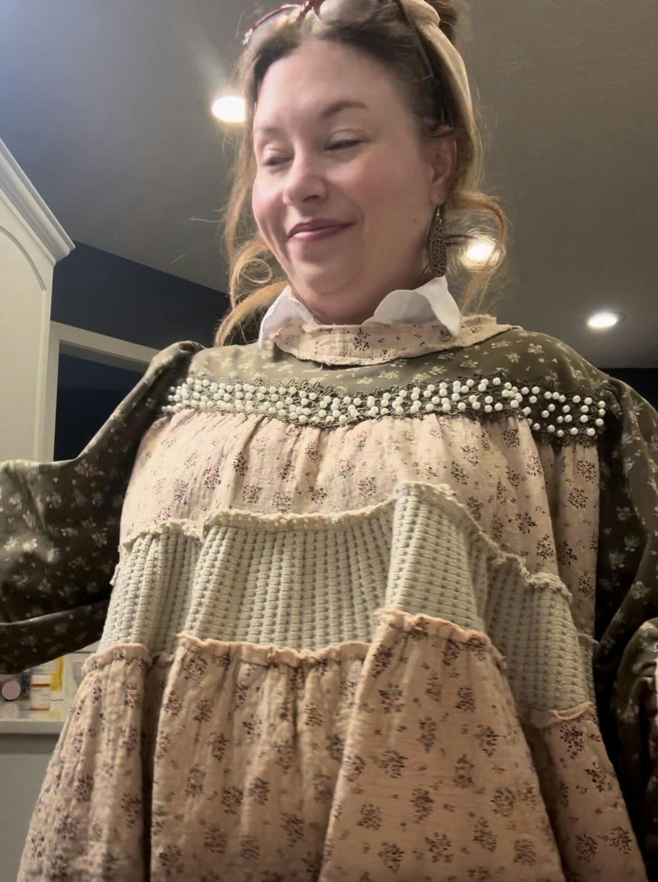 Introducing the Pearls And Ruffles Blouse- This darling mixed-print top gives all the cottage-core meets country-girl vibes. With its sweet floral pattern, soft earthy tones, and unique textured patchwork bodice, it’s made for those who love a hint of vintage charm. The flowy fit, gathered details, and raw hem add that perfectly imperfect finish that makes every outfit feel one-of-a-kind.