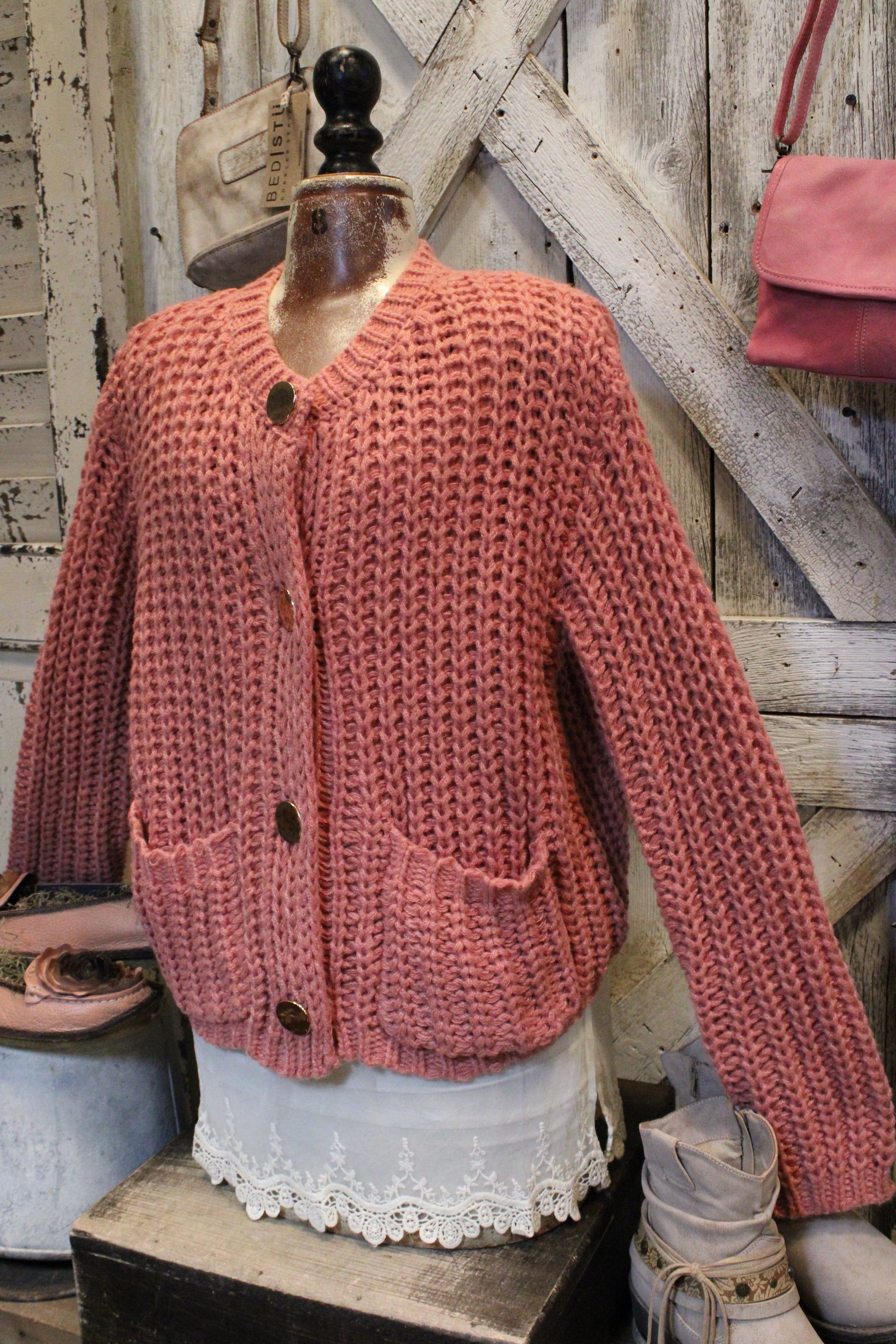 Introducing our Peony Pearl Cardigan- This chunky knit beauty wraps you in warmth while keeping things effortlessly stylish. The soft rose hue, oversized gold buttons, and deep front pockets give it that cozy-but-polished feel — perfect for layering over your favorite tee, dress, or lacy cami.