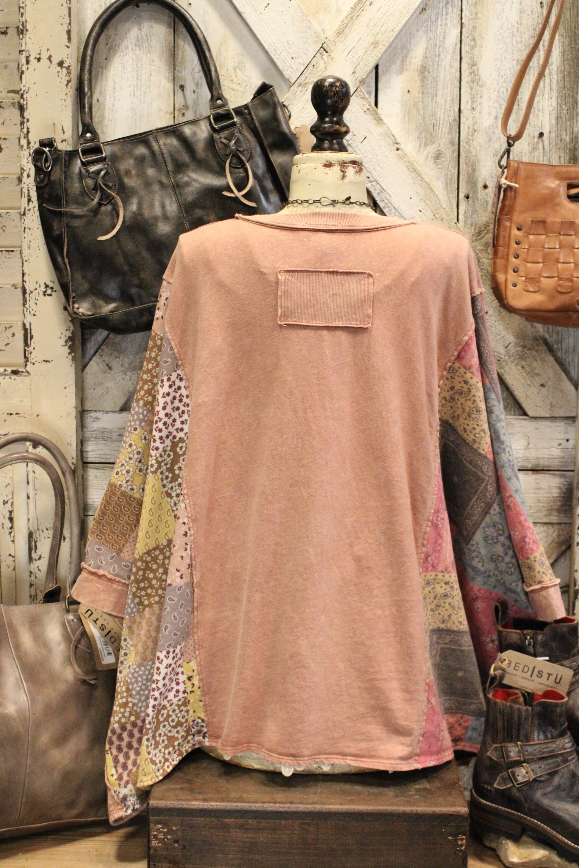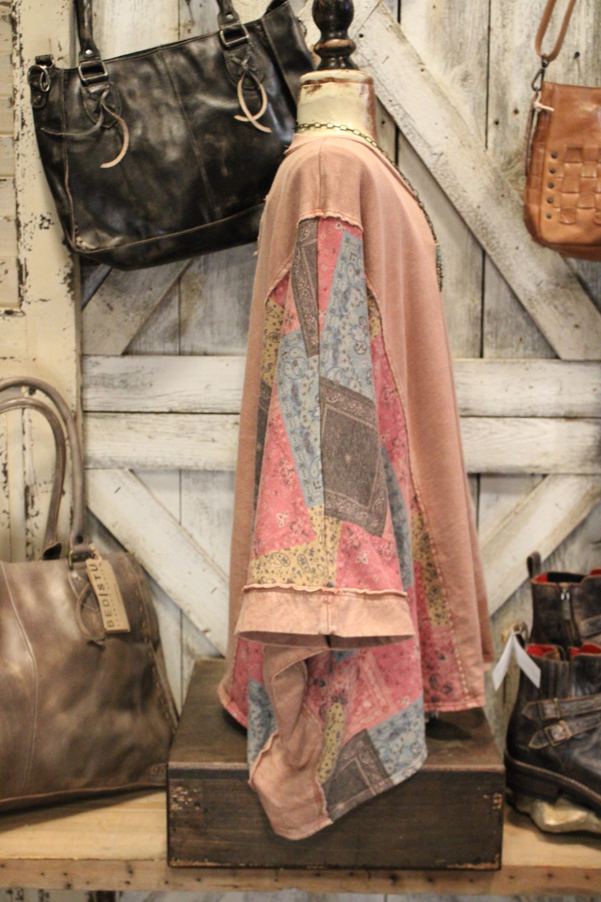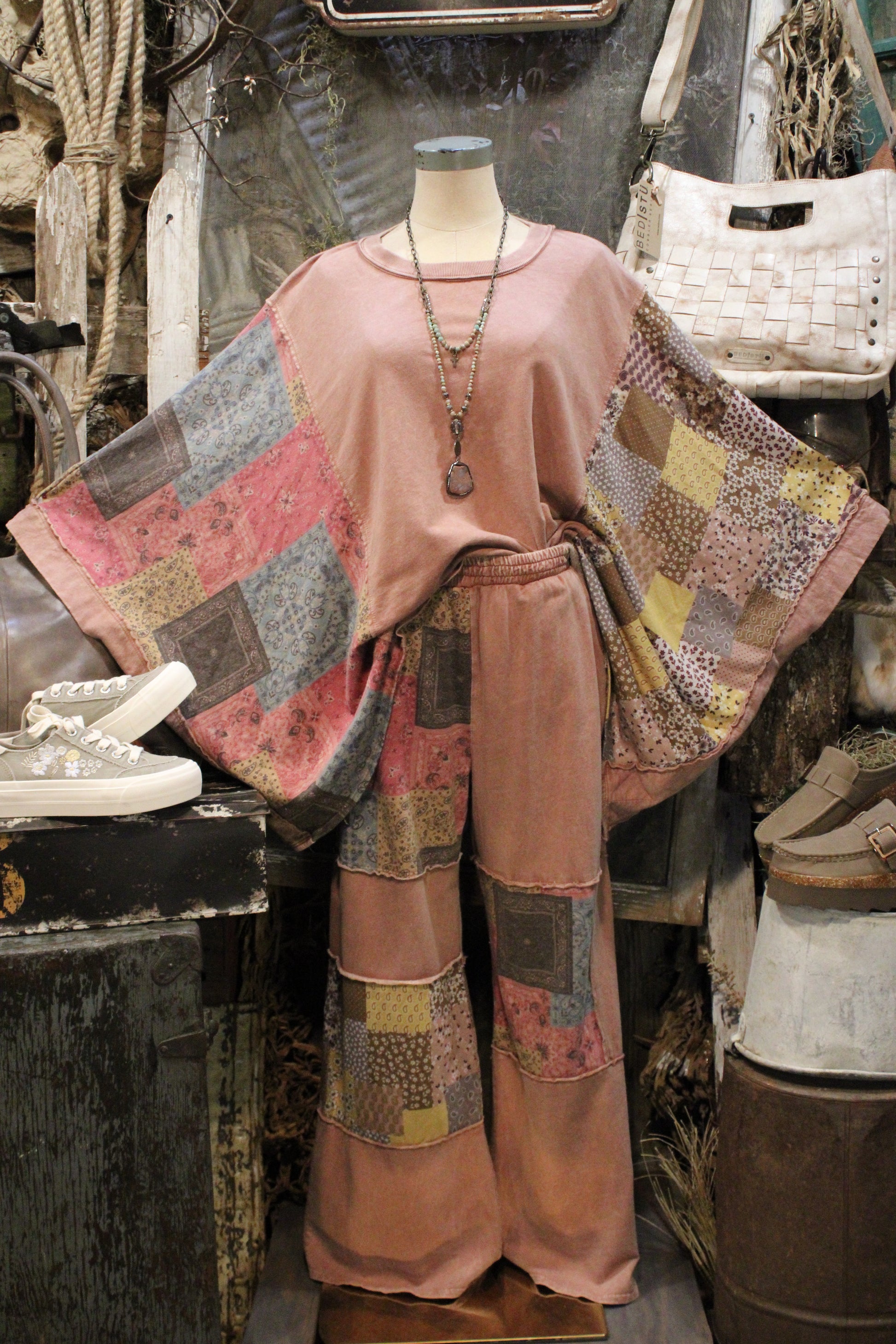 Crafted from a washed rose-hued fabric and adorned with vintage-style patchwork panels on the sleeves and sides, each piece is a wearable story of color, comfort, and craftsmanship. The wide, draped sleeves and relaxed neckline add an extra layer of laid-back charm, making it your go-to for everything from slow mornings to sunset strolls.