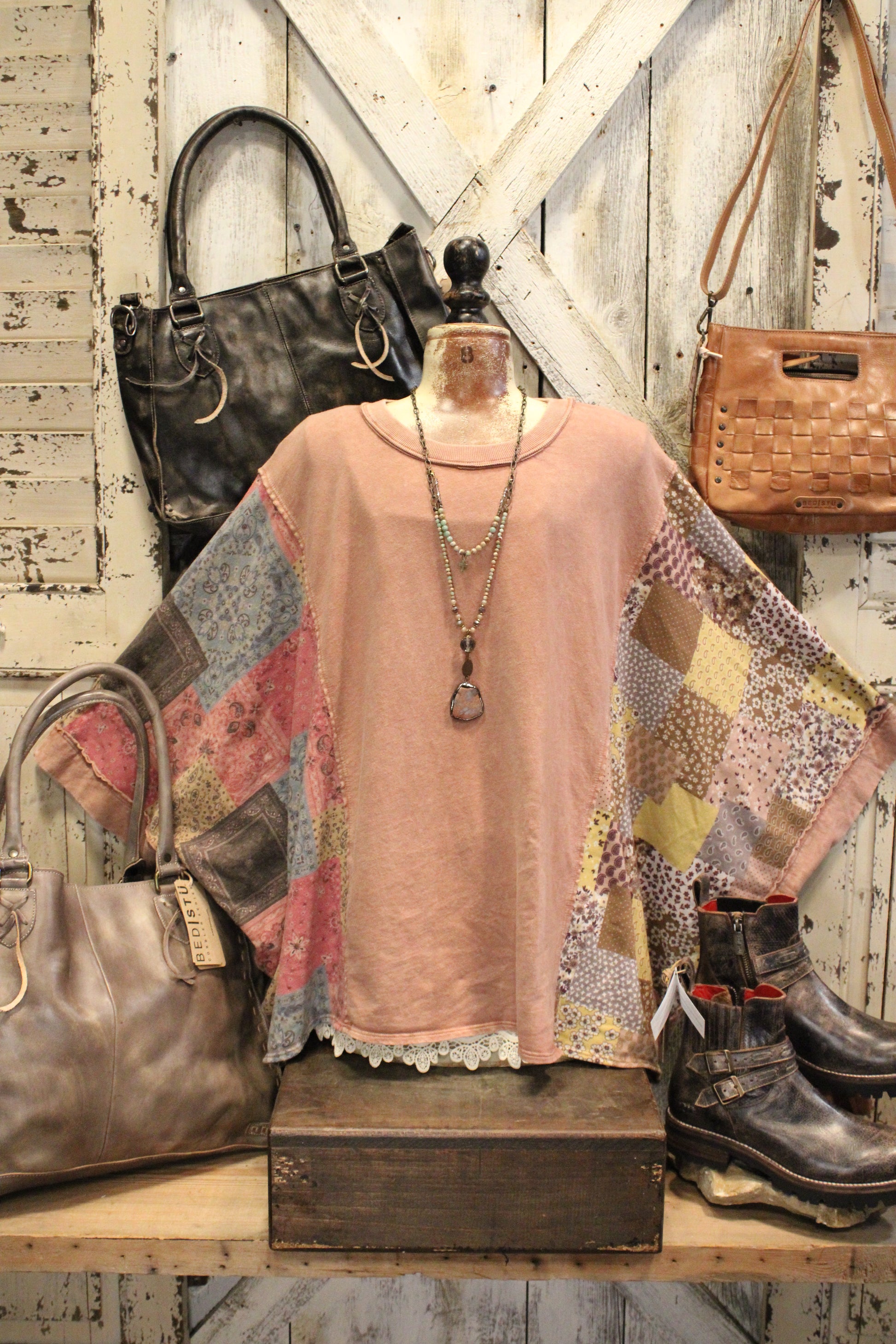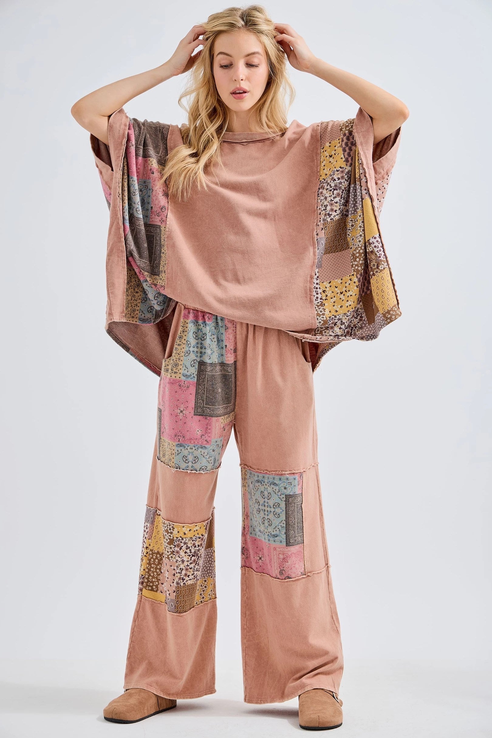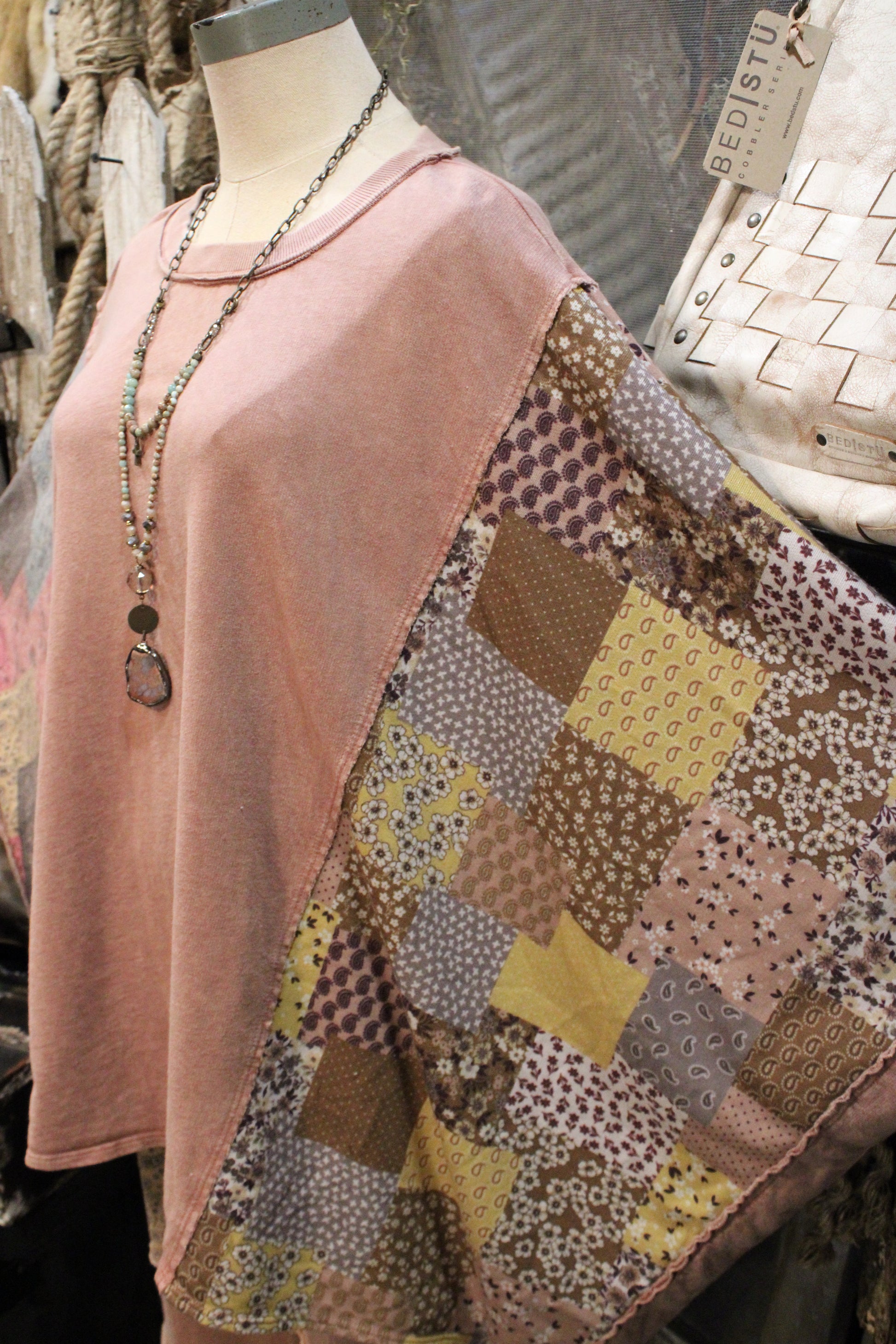 Crafted from a washed rose-hued fabric and adorned with vintage-style patchwork panels on the sleeves and sides, each piece is a wearable story of color, comfort, and craftsmanship. The wide, draped sleeves and relaxed neckline add an extra layer of laid-back charm, making it your go-to for everything from slow mornings to sunset strolls.