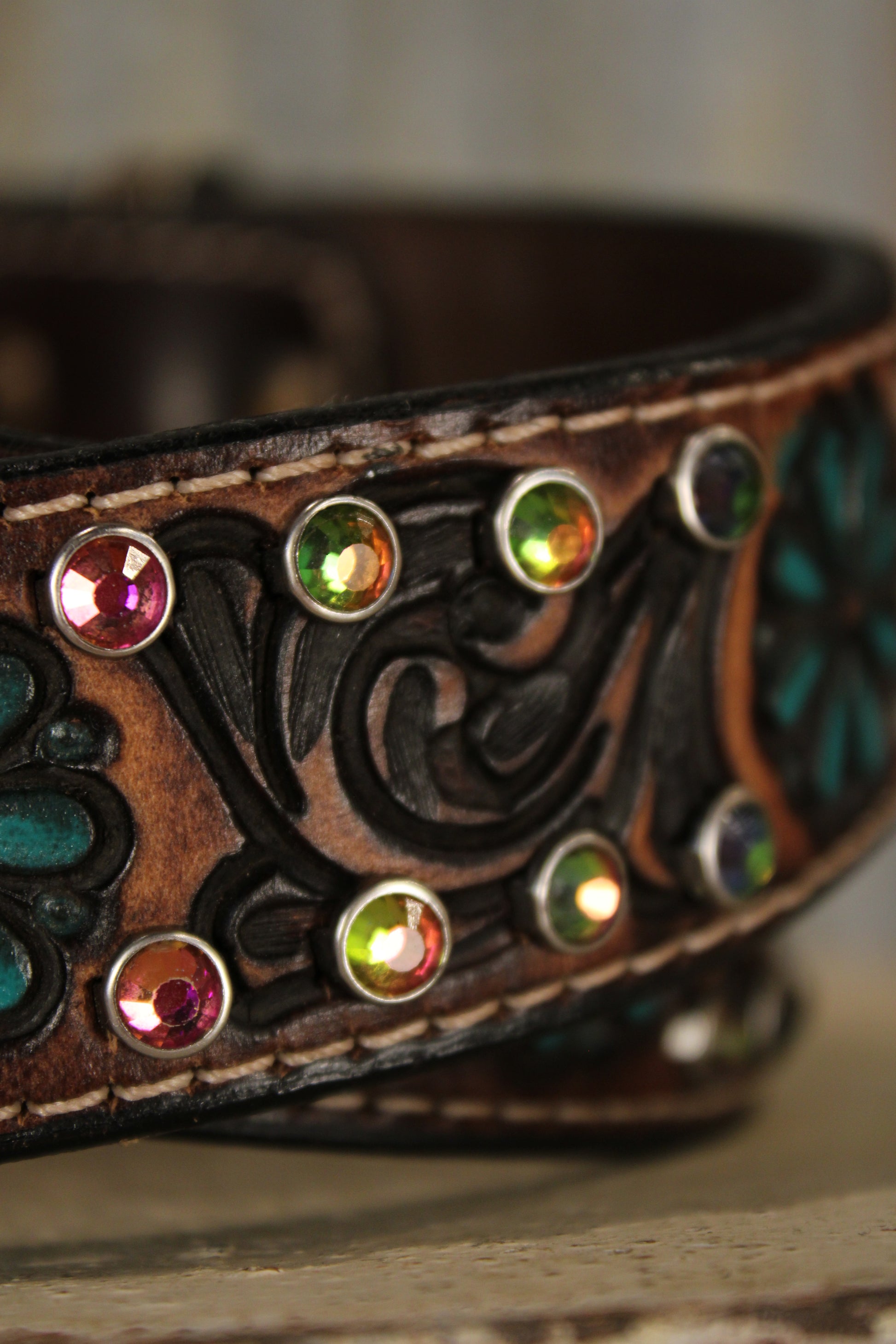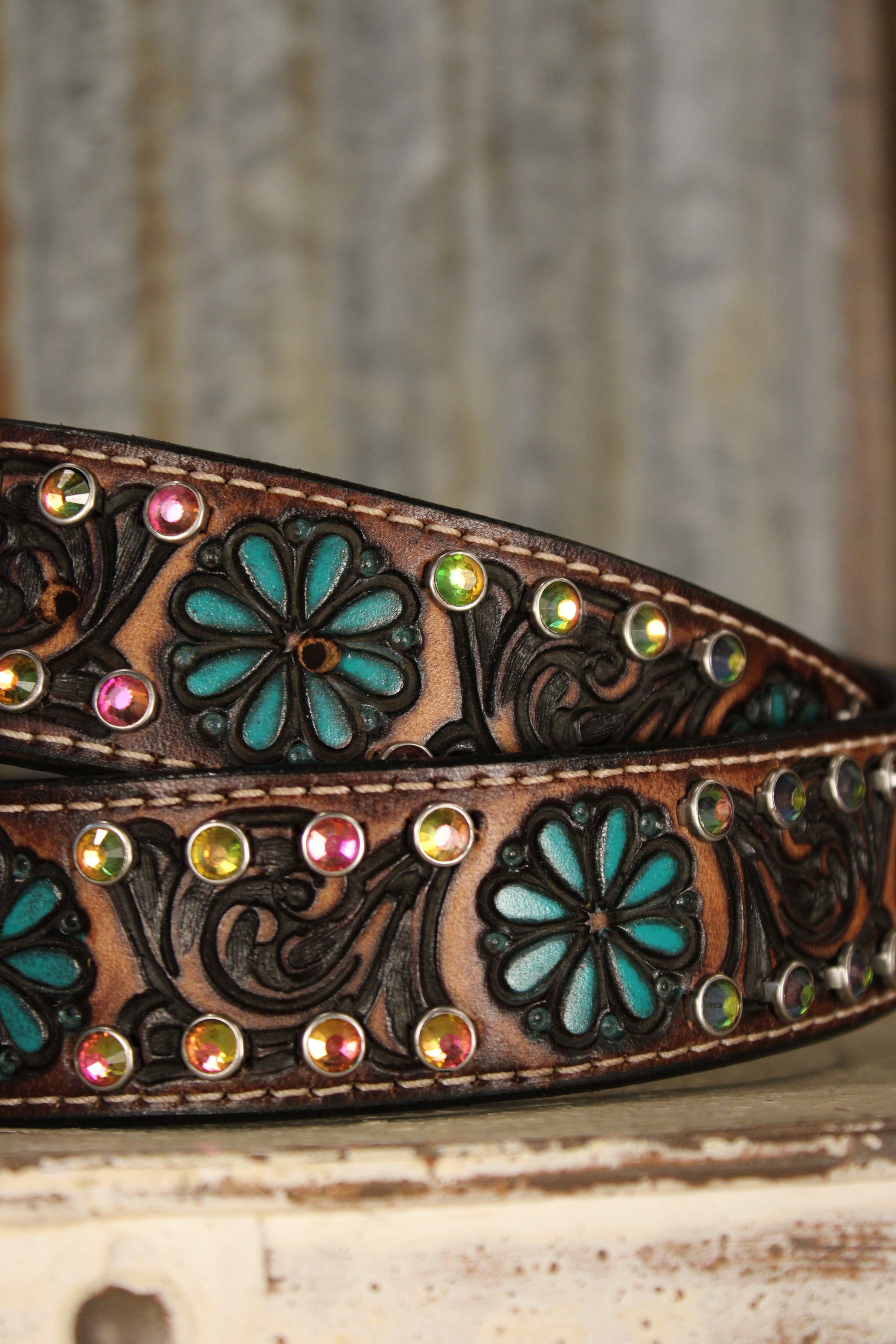 Introducing our Petals And Jewels Leather Belt, This tooled leather belt is a statement piece made to steal the spotlight. Designed with intricate floral tooling, turquoise-inspired accents, and iridescent stud details, it blends western charm with bold boho flair. The rich brown leather and vintage-style buckle add timeless character, making it perfect for pairing with denim, dresses, or layered over a tunic. A standout accessory that instantly elevates any outfit with color, texture, and cowgirl confidence.