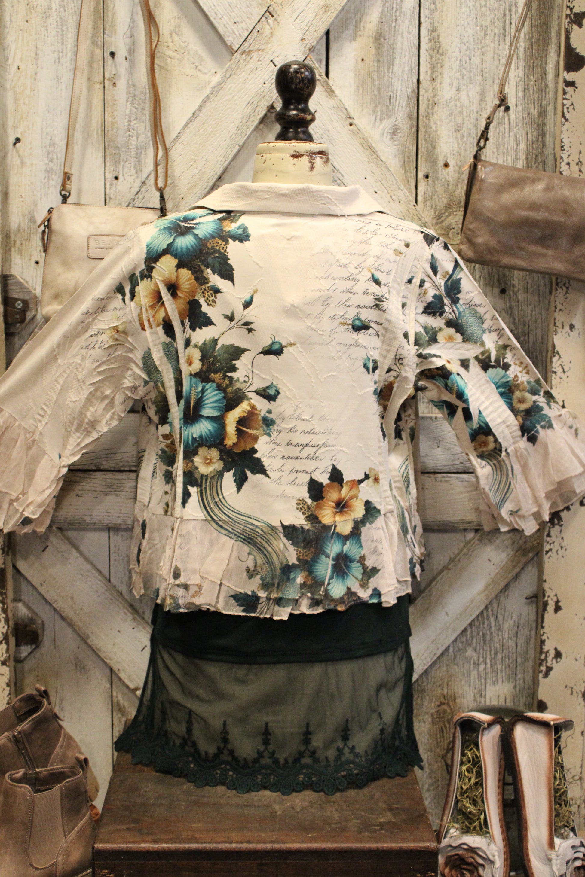 Introducing the charming Petals and Poetry Teal Hibiscus Jacket- Light, airy, and oh-so-romantic, this sheer floral jacket is the perfect layering piece to add a touch of elegance to your outfit. The flowy fabric features painterly blooms in shades of teal, gold, and cream, accented with subtle script details that feel like a love letter written just for you.