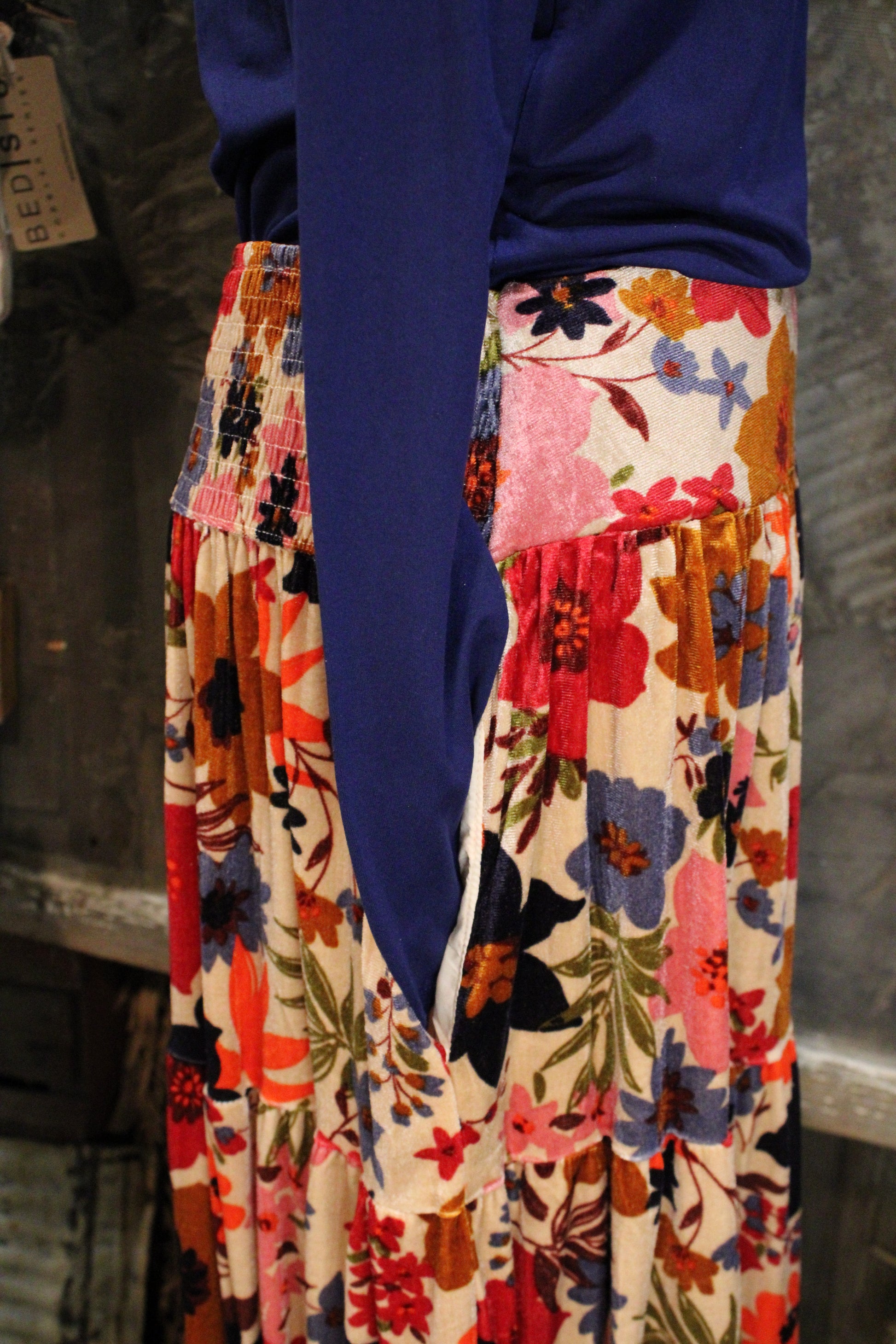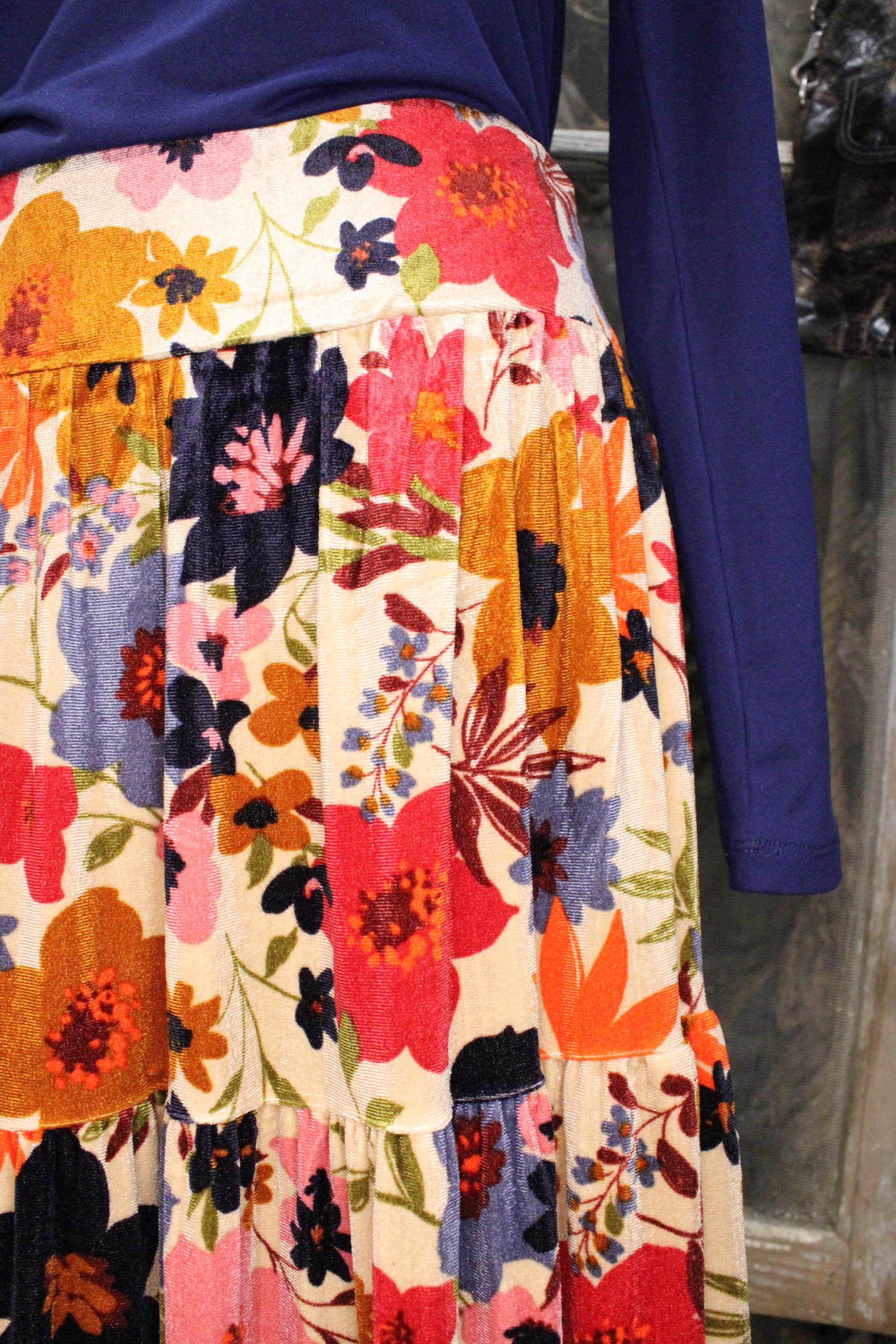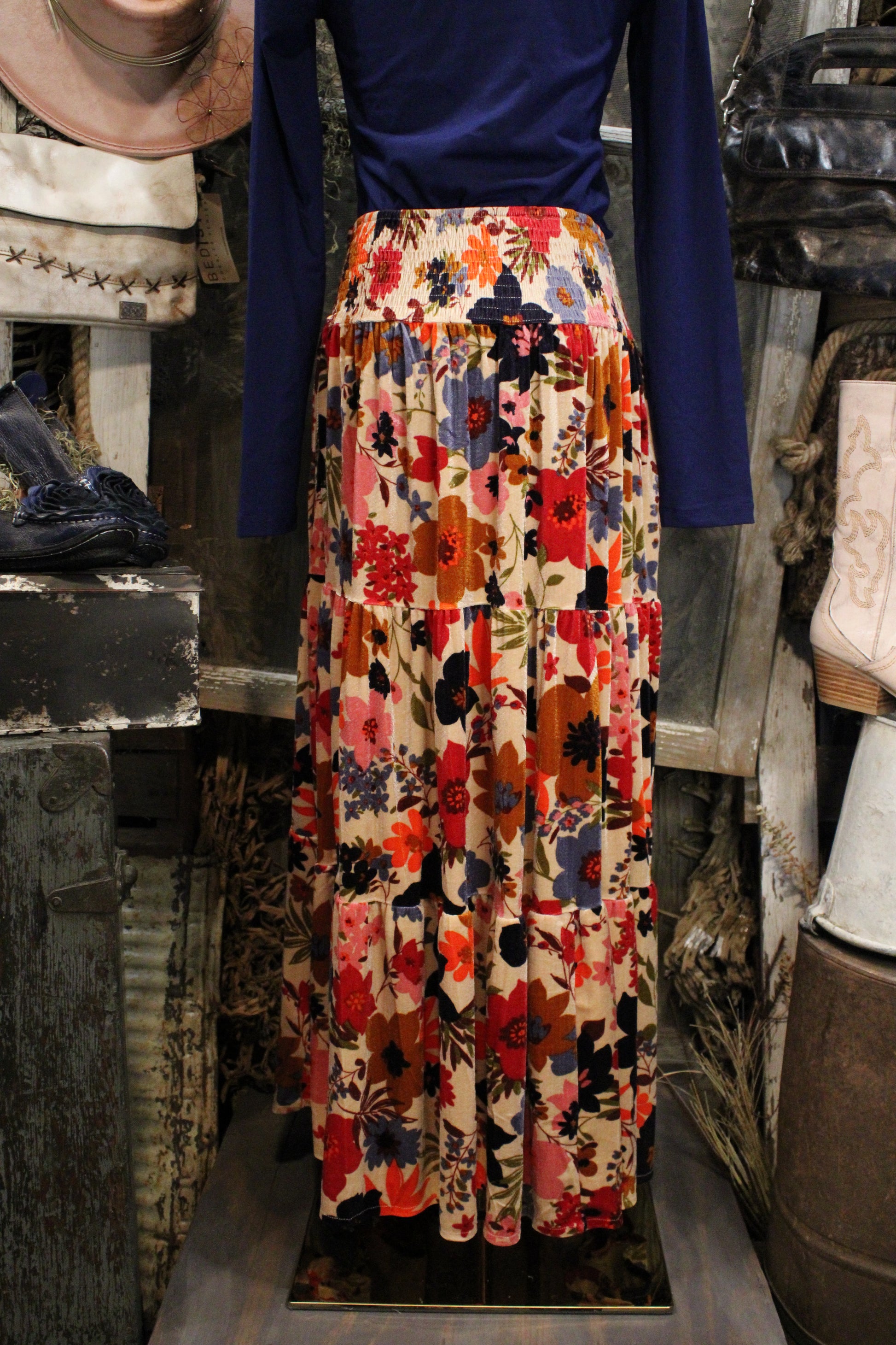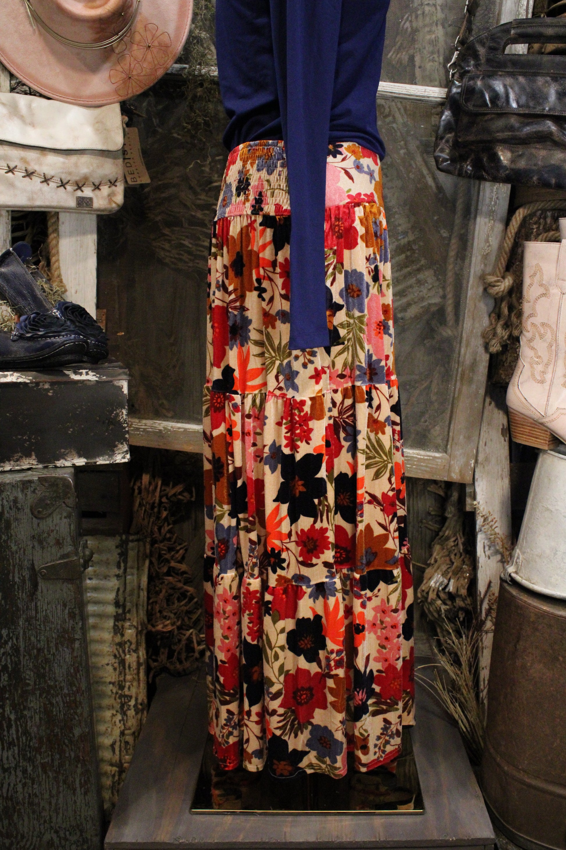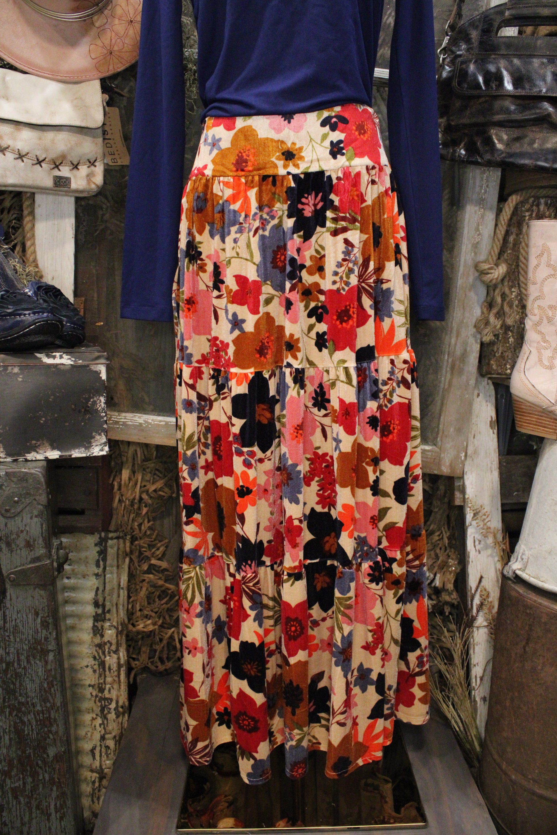 Introducing the Pickin' Wildflowers Skirt - Dance through your day in this fabulous floral skirt — a vibrant, flowy favorite that captures the spirit of boho charm and vintage romance. Featuring a bold, multi-colored floral print in rich autumnal tones, this tiered skirt sways beautifully with every step.