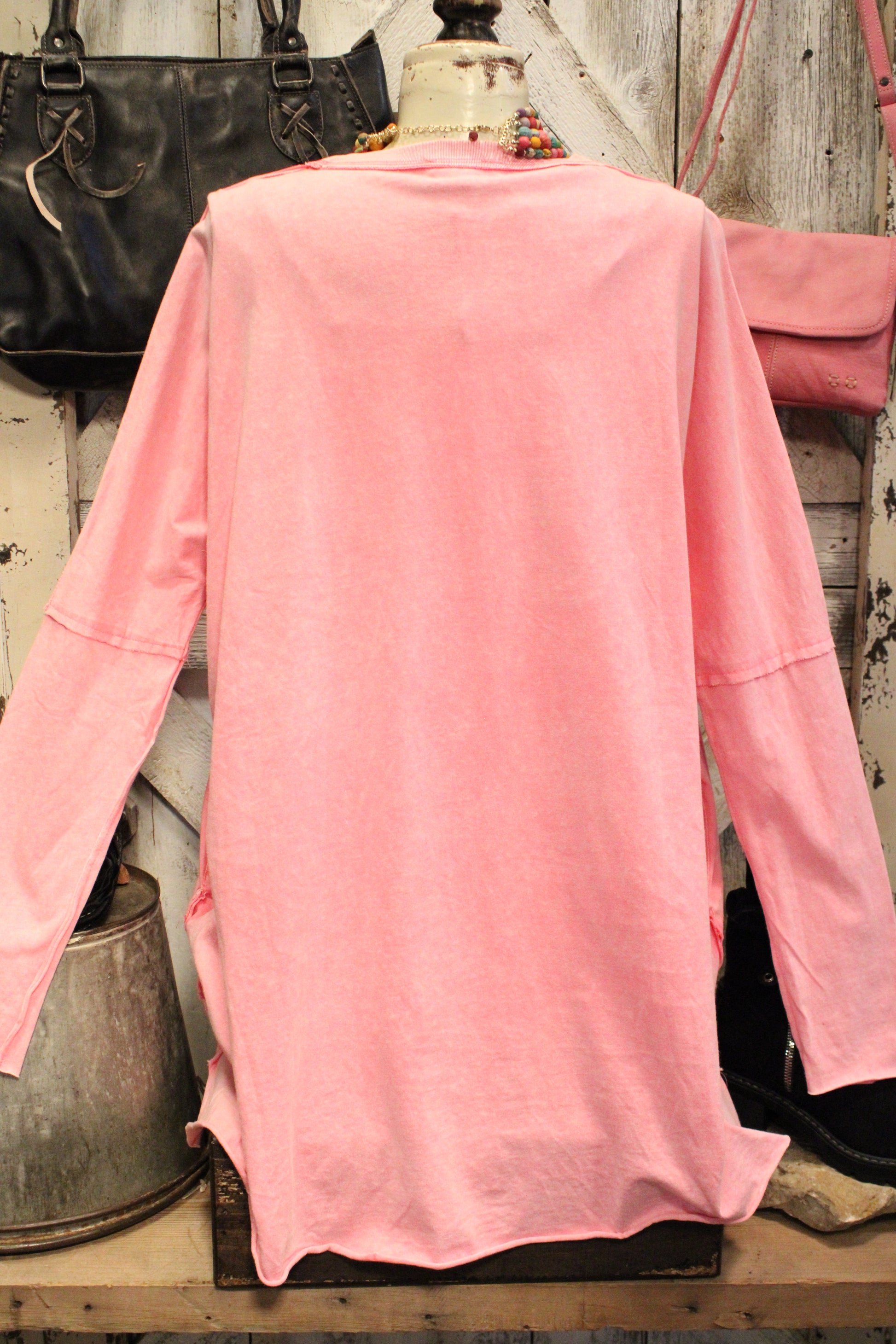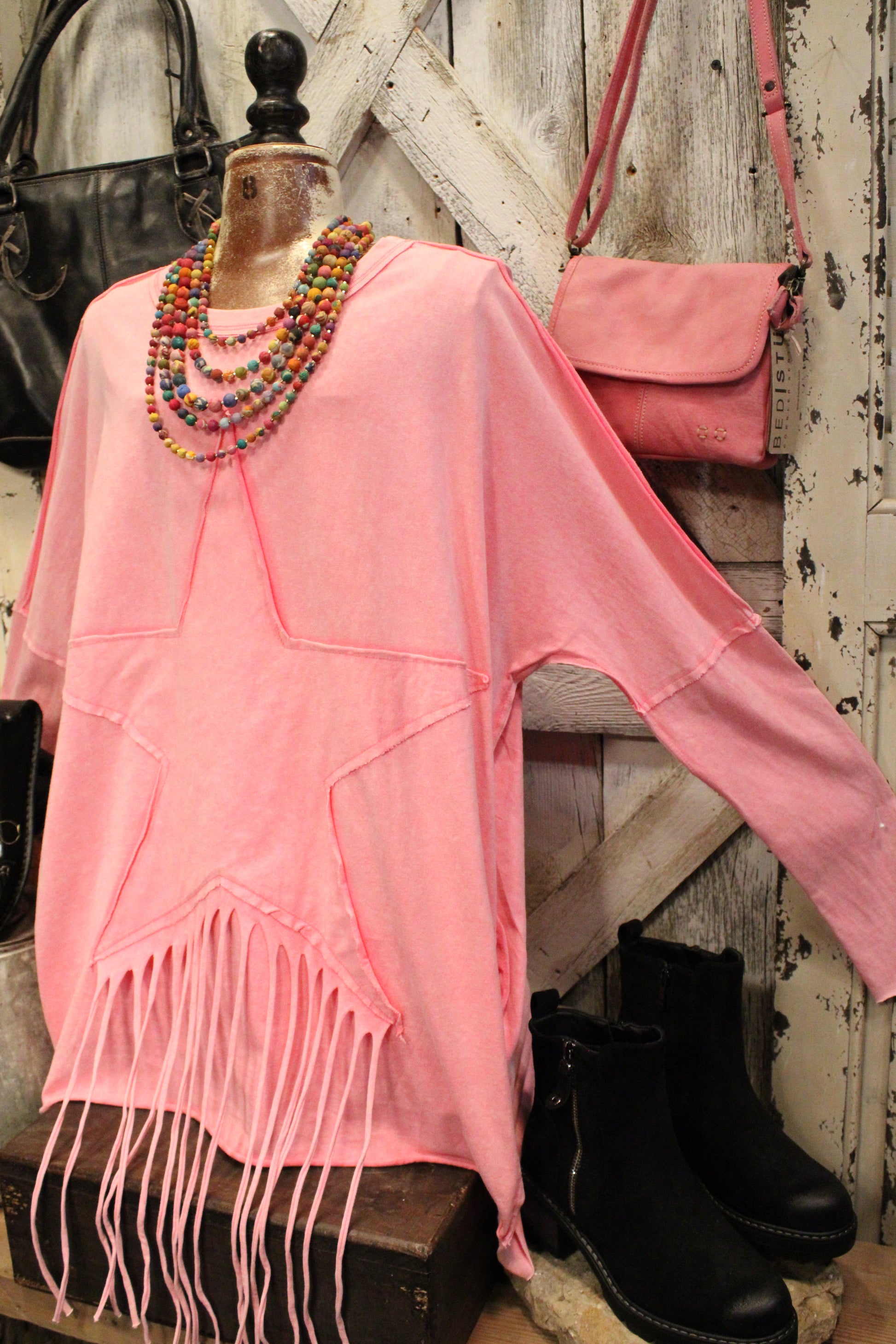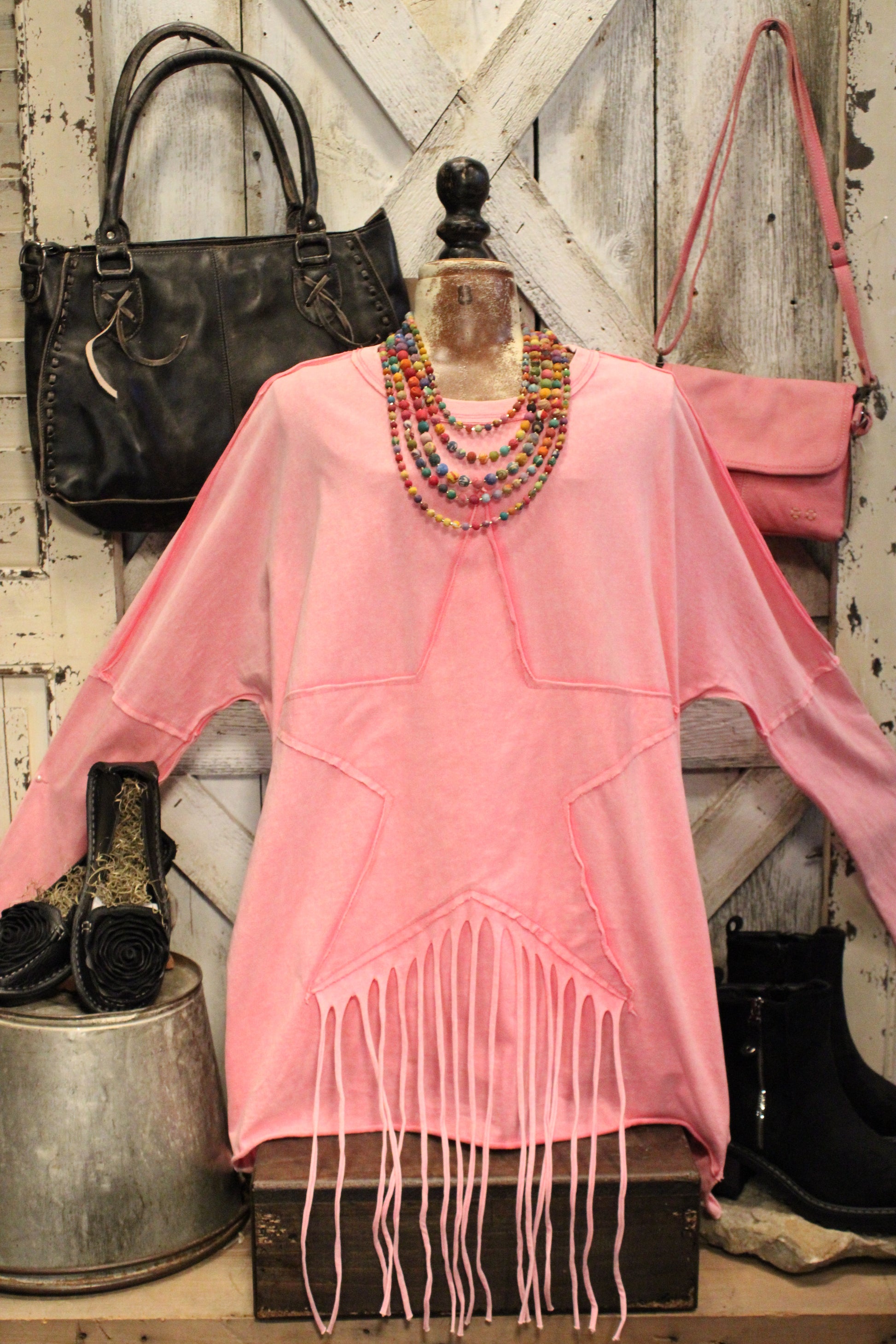 Introducing the Pink Stardust Fringe Top- Shine a little brighter in this playful pink star top! Soft, relaxed, and delightfully unique, it features an oversized star appliqué front and center, complete with dramatic fringe that adds fun movement with every step. The mineral-washed finish gives it a soft, dreamy look, while the roomy silhouette and cozy long sleeves make it an easy go-to for comfy, cute style.