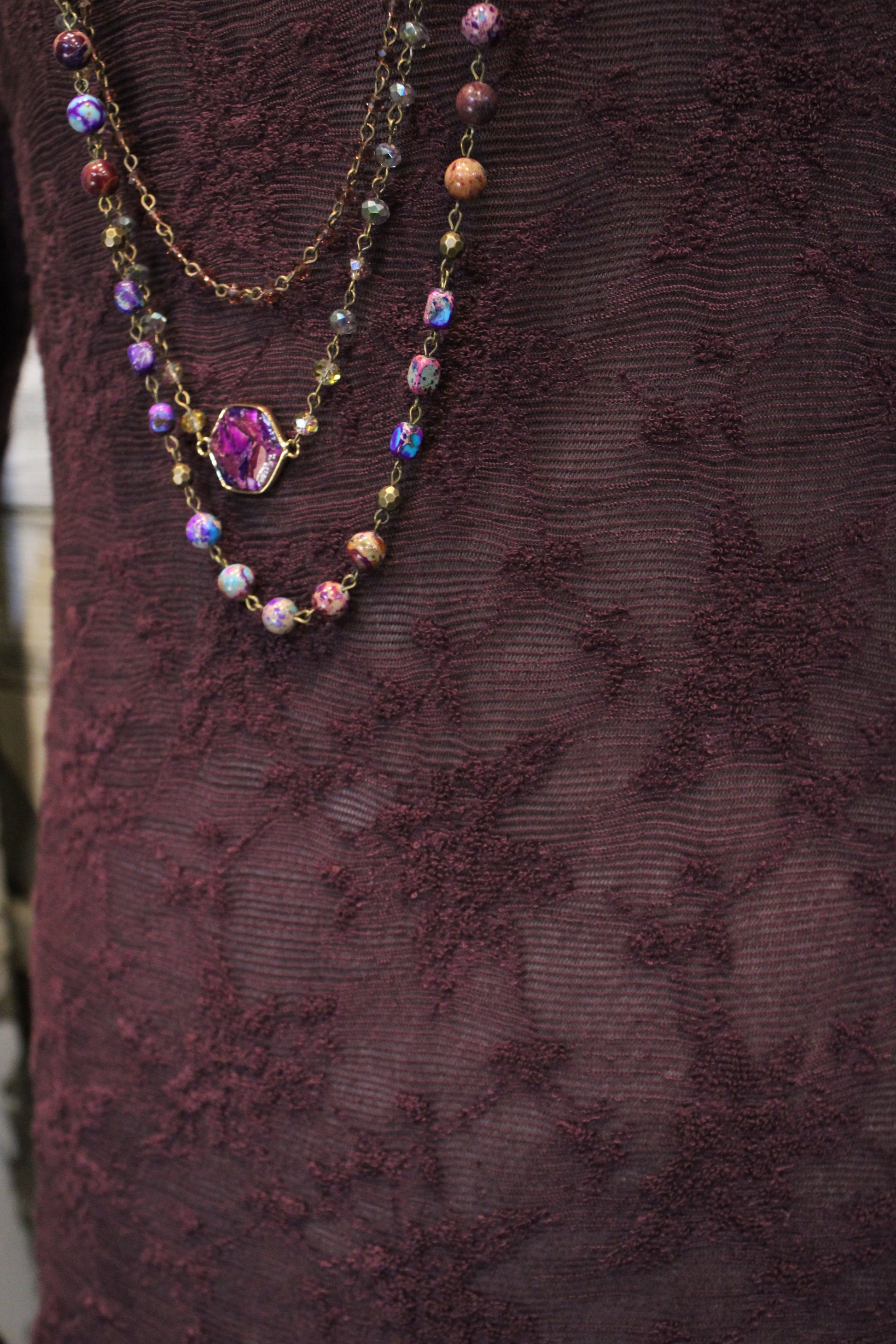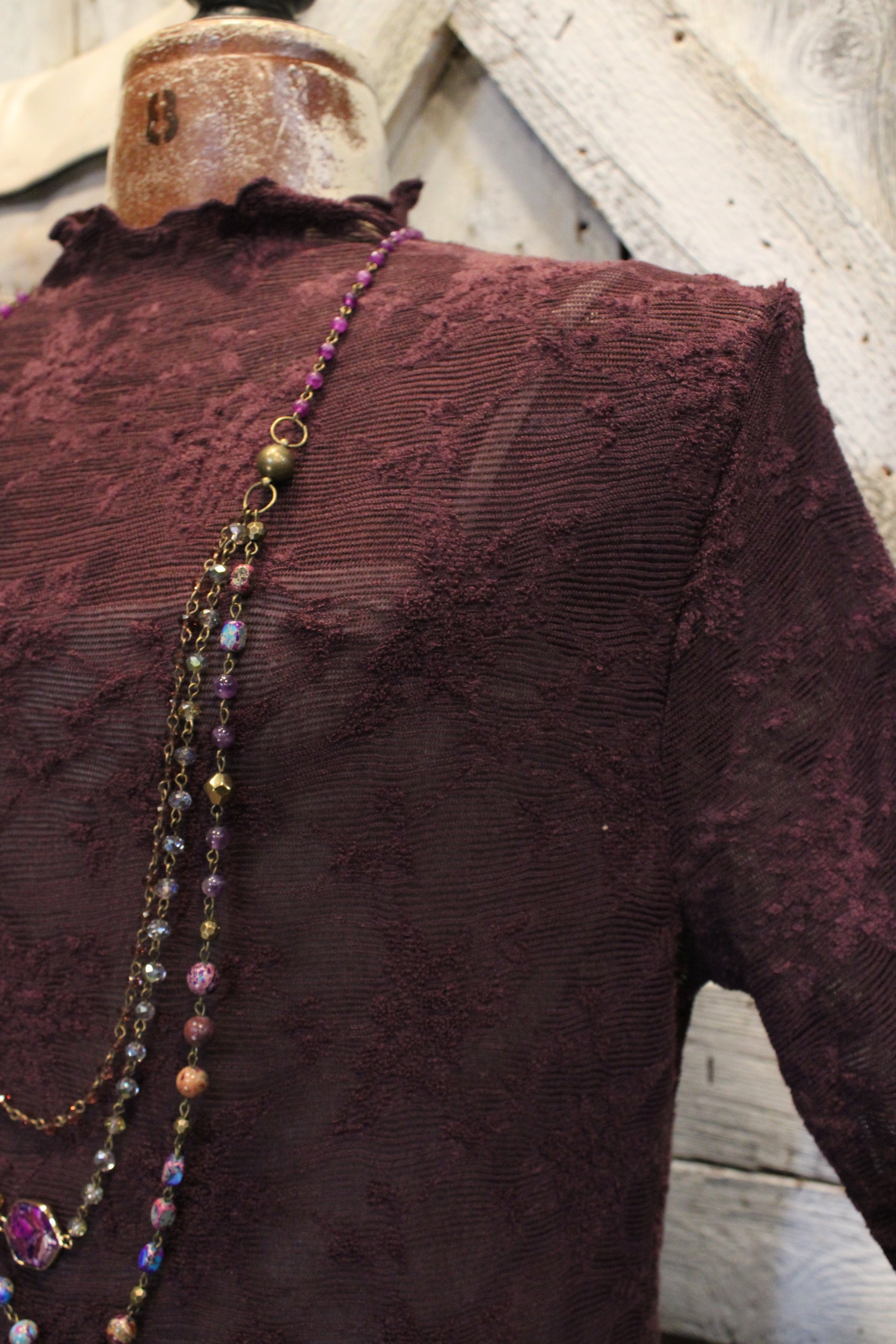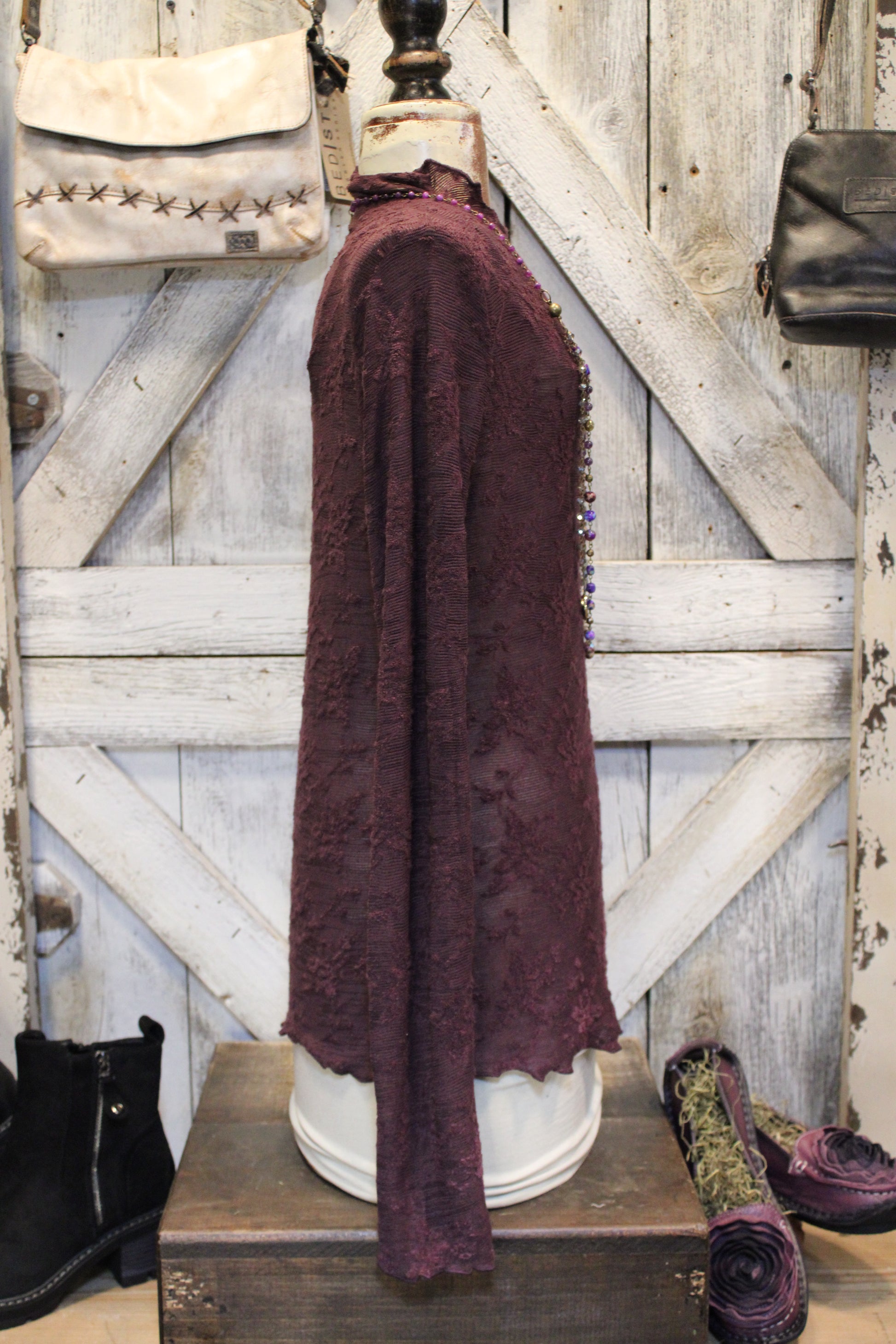 Introducing the Plum Kiss Mesh Top- Make a stylish statement in this fabulous mesh top! Featuring intricate detailing throughout, this semi-sheer mesh design adds a touch of romance and texture to your wardrobe. The stretchy, lightweight fabric hugs comfortably, while the long sleeves and subtle scalloped hem give it a soft, feminine edge. Wear it over a bralette or layered under your favorite jacket—this top is perfect for both day and night looks. Pair it with jeans for a casual vibe or dress it up for evenings out.