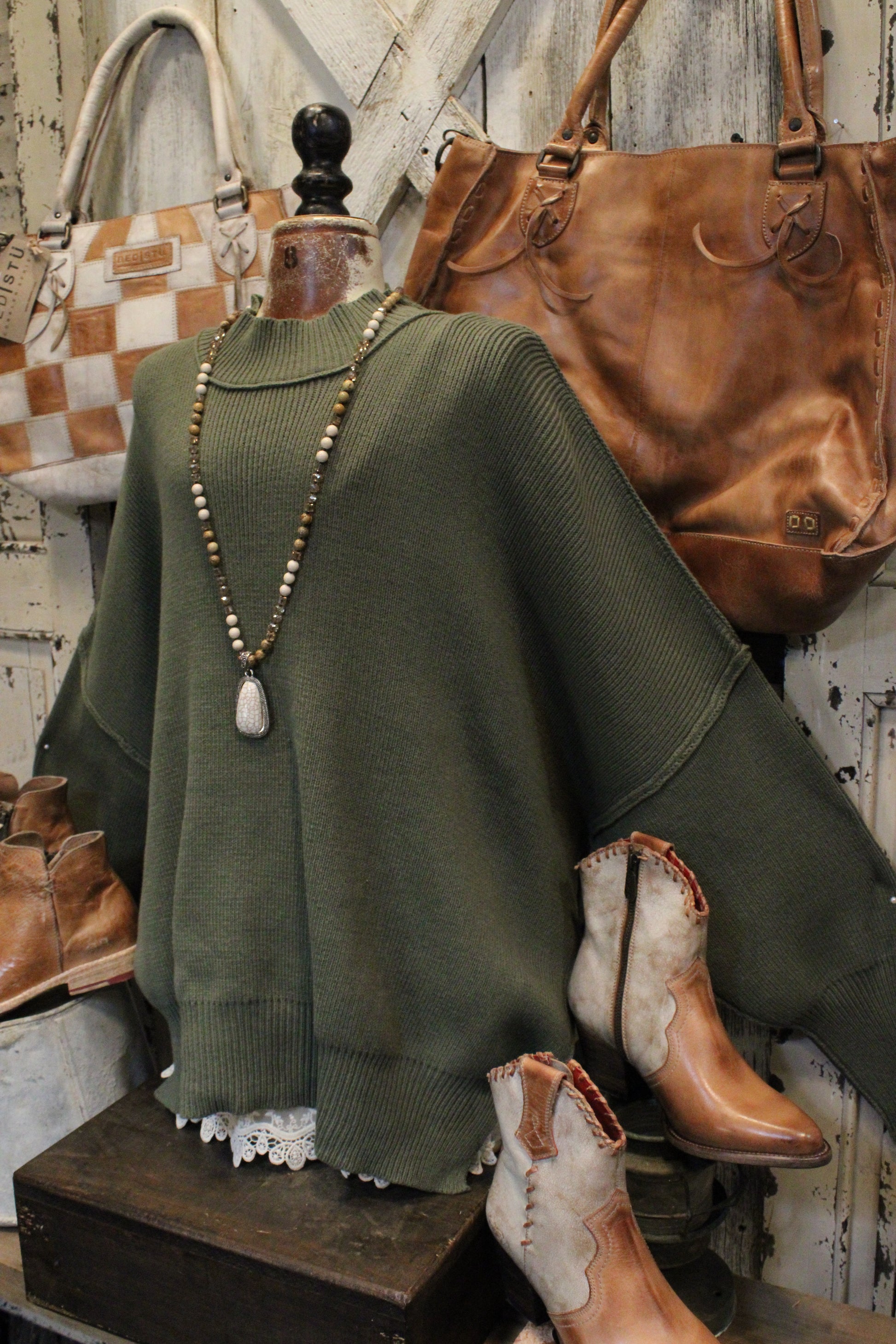 With its soft knit fabric, relaxed fit, and flowy shape, this sweater drapes beautifully — flattering every figure while keeping things comfy. The sage green color adds that earthy, farm-girly charm we love, and it pairs perfectly with your favorite denim or leggings.