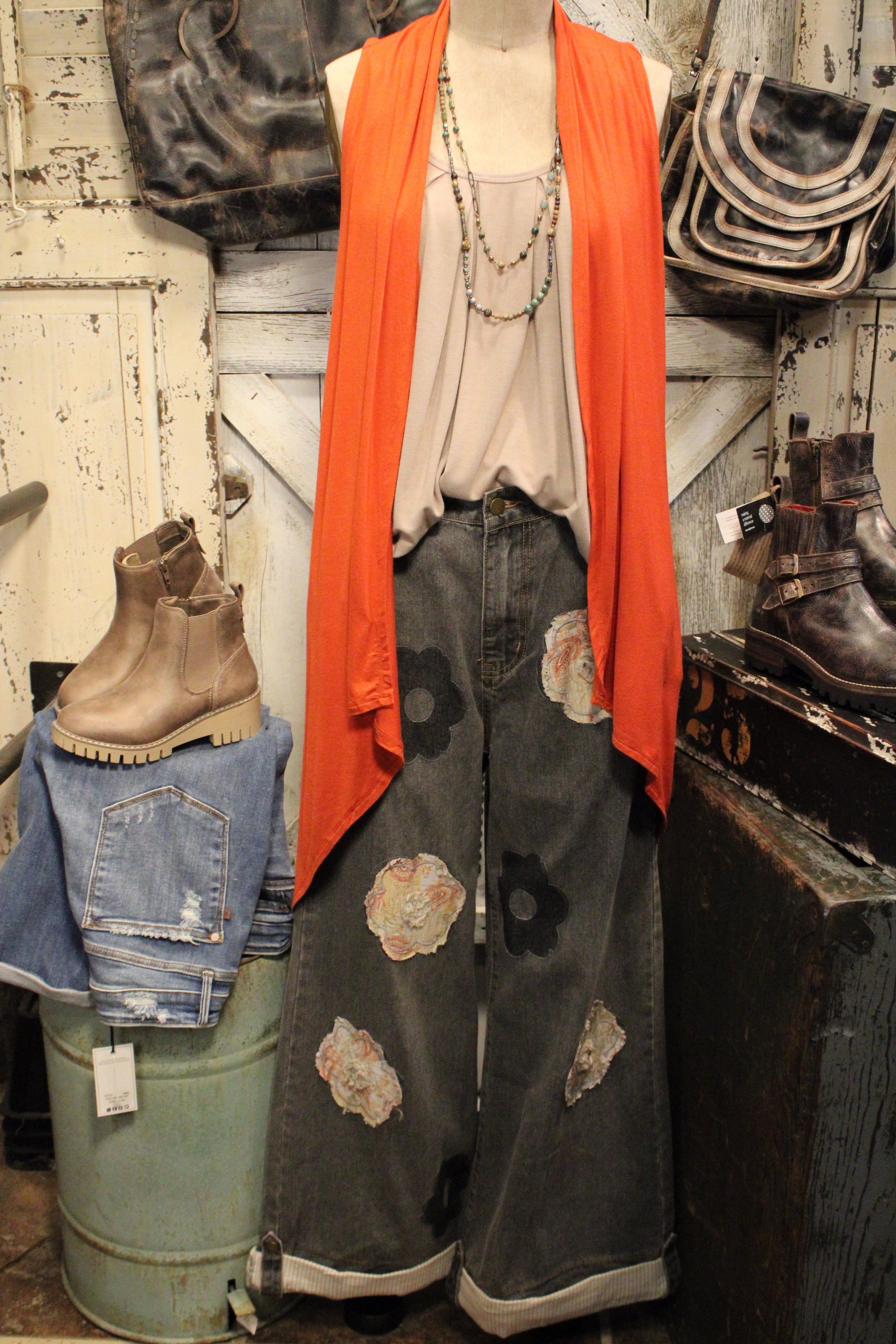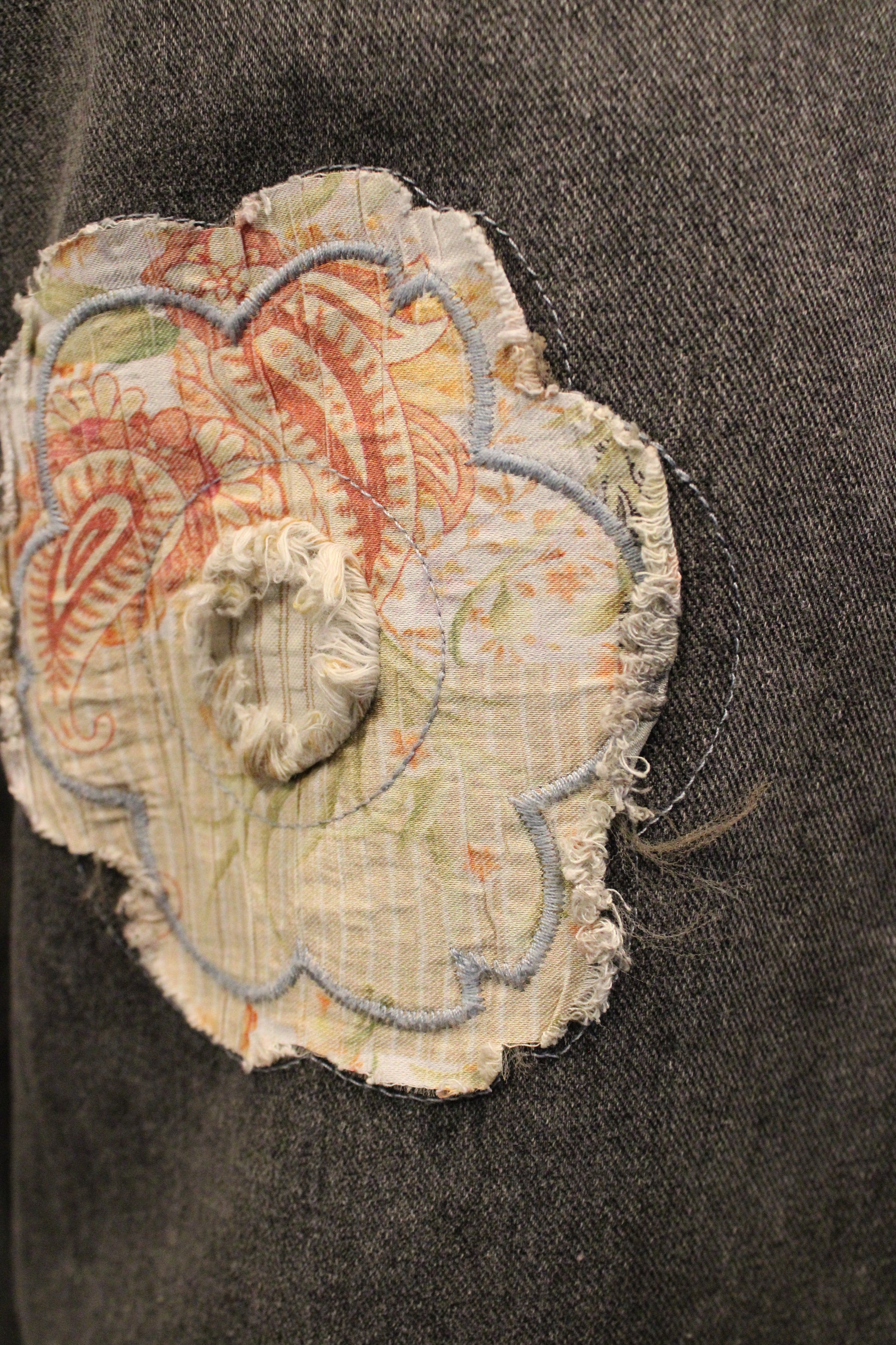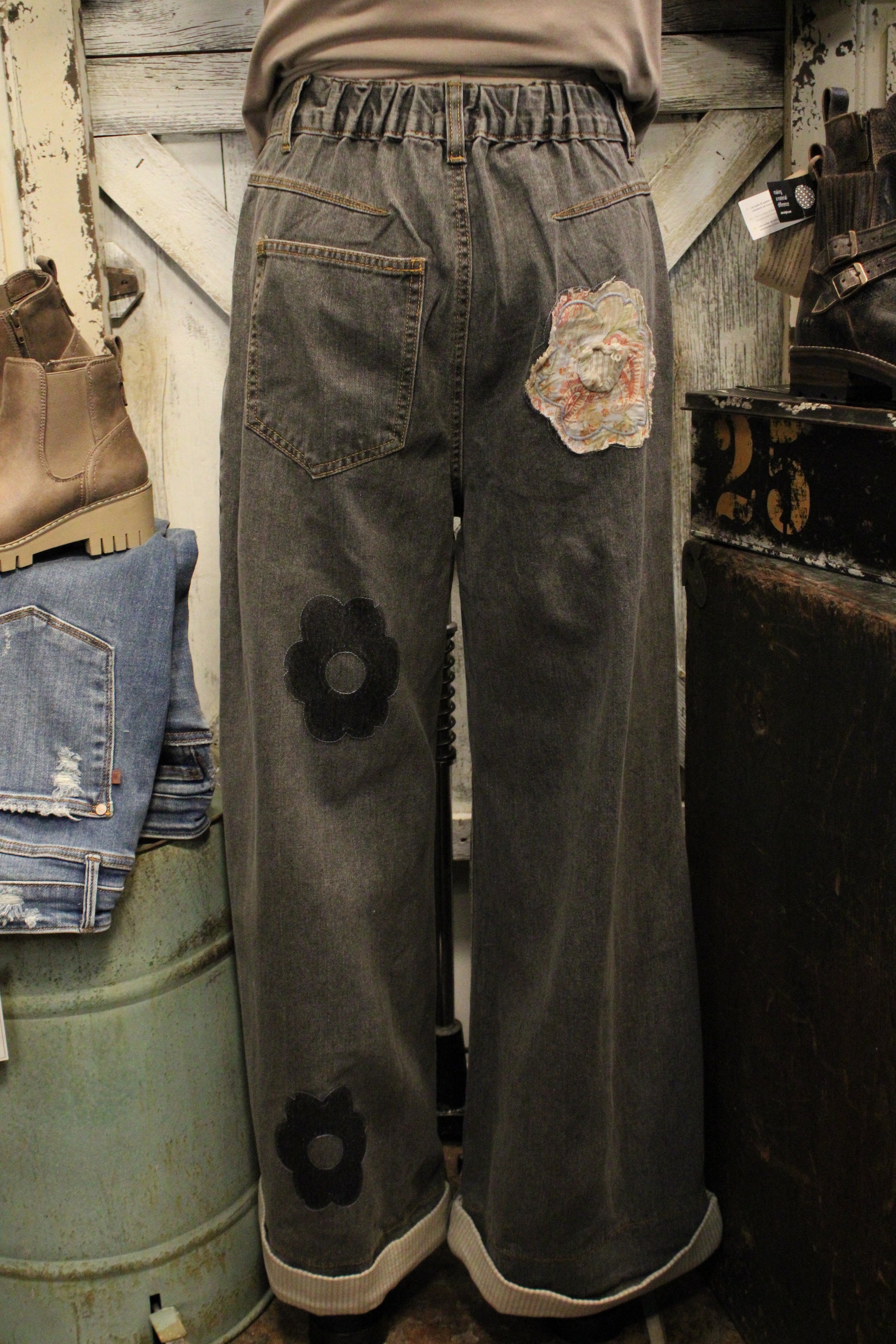 Elevate your wardrobe with the Prairie Bloom Black Pants- These wide-leg beauties bring all the charm of vintage denim with a twist. Featuring a mix of textured floral appliqués and bold fabric patches, every pair feels one-of-a-kind — just like you. The washed charcoal tone gives that perfectly distressed look, while the playful patterns and frayed edges add a dose of farm-girly flair.