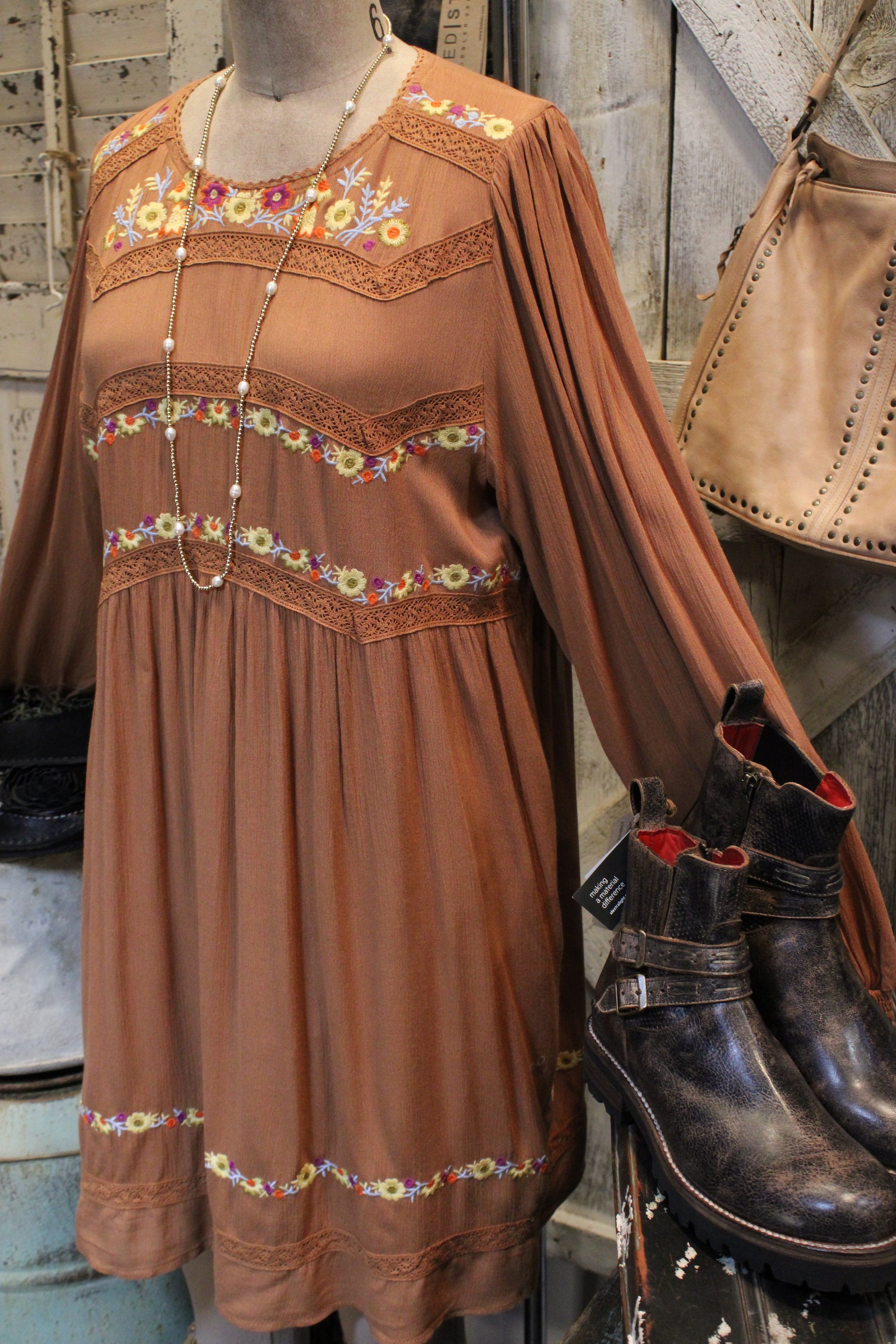 Introducing the charming Prairie Flowers Dress- Say hello to your new fall favorite! This beautiful camel-colored dress captures that golden-hour glow with delicate floral embroidery and soft lace detailing that dances across the bodice and hem. The flowy silhouette and billowy sleeves make it as flattering as it is comfortable — perfect for pumpkin patch strolls, brunch dates, or your next weekend getaway.