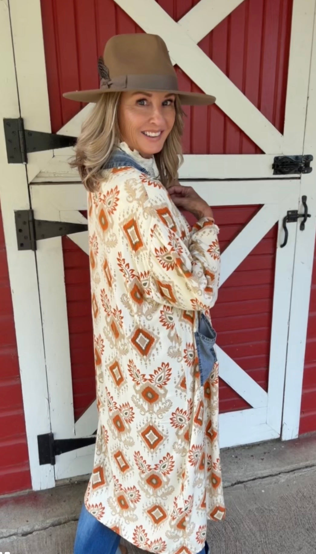 Lightweight and versatile, this duster is your go-to piece for adding instant personality and flair—whether you’re headed to brunch, a fall festival, or just lounging in style.
