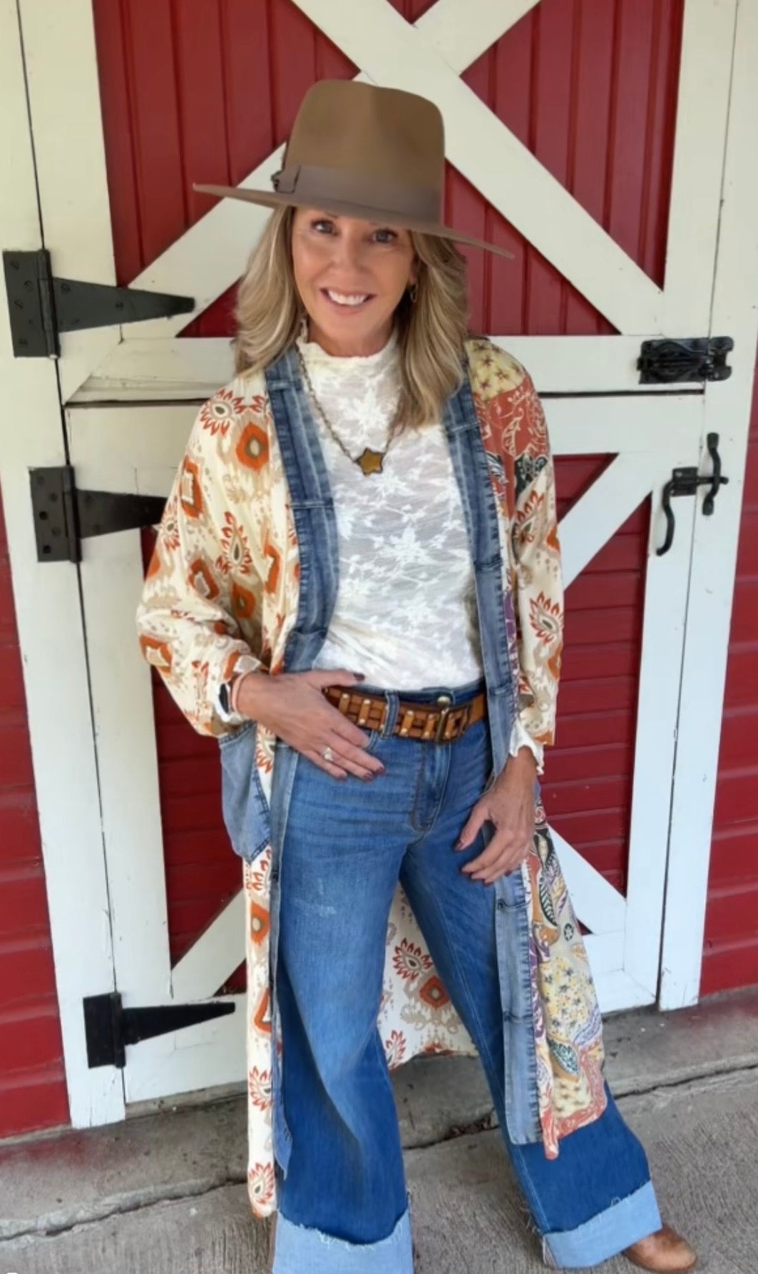 Introducing the Prairie Wind Duster- Make a statement with effortless style in this patchwork boho duster. Featuring a mix of vibrant patterns in earthy tones, this piece brings a free-spirited vibe to any outfit. The denim trim and oversized pockets add a casual, modern touch, while the flowy silhouette makes it perfect for layering over everything from jeans and tees to dresses.