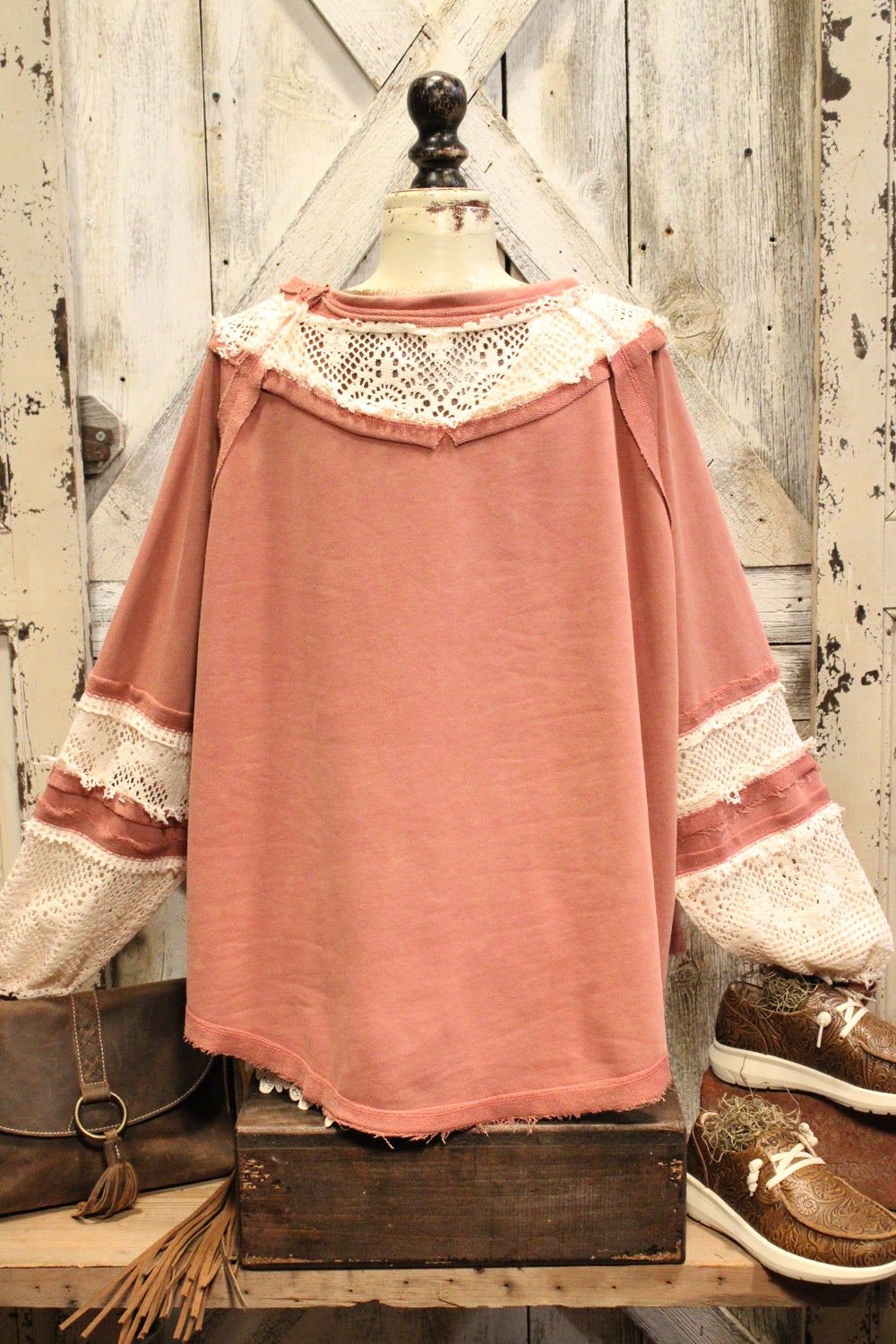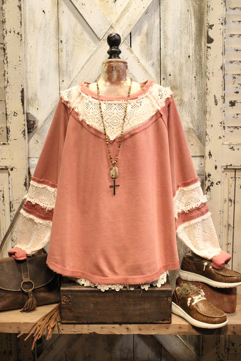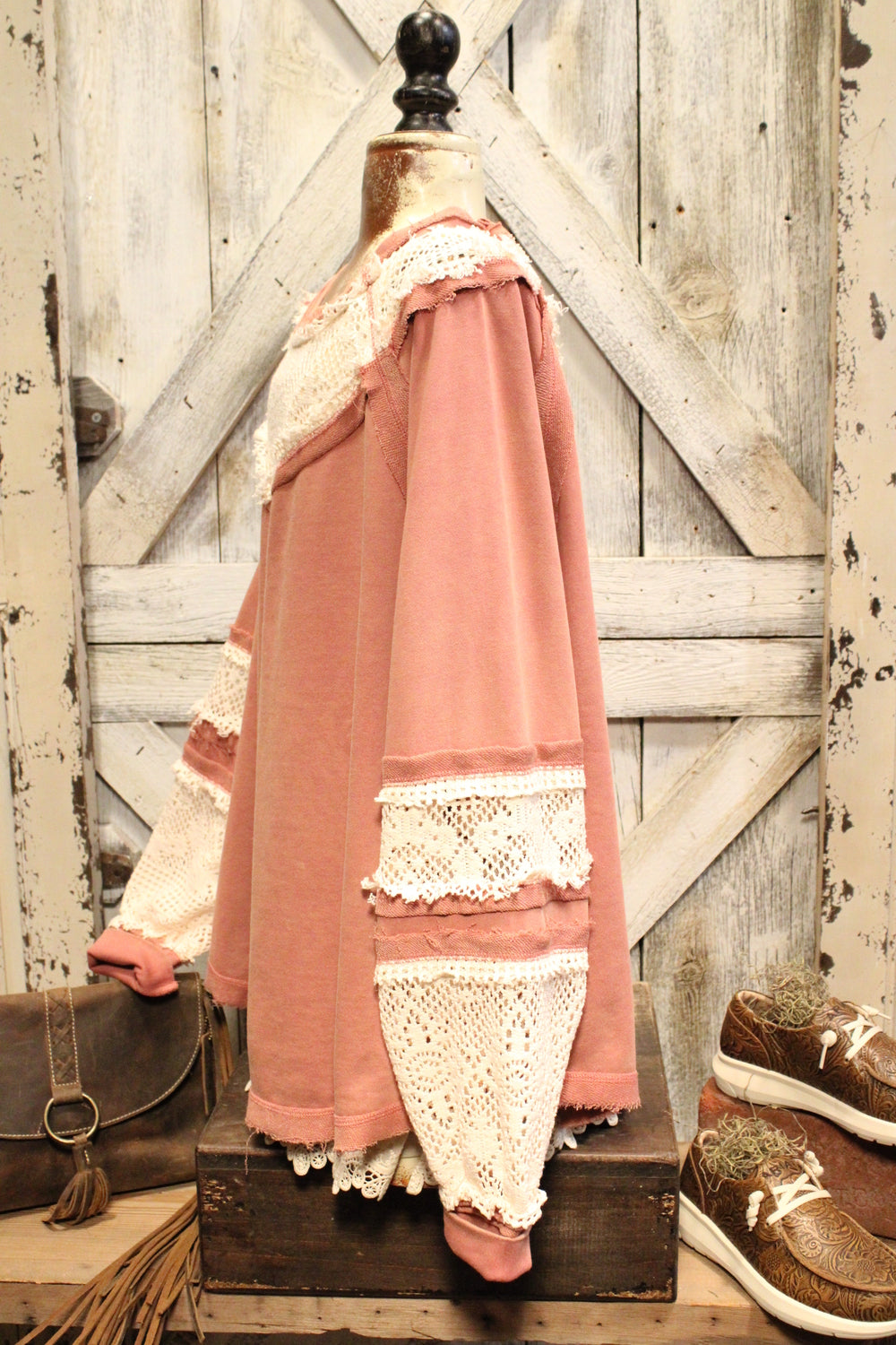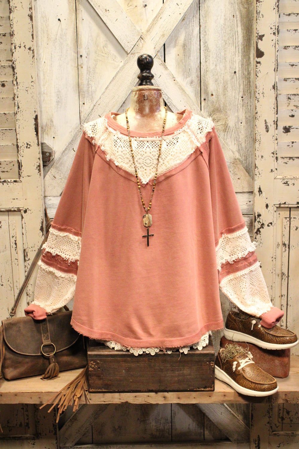 Refined Redneck Sweatshirt- Cozy meets feminine! This charming pullover features a soft hued fabric paired with delicate crochet lace at the neckline and sleeves for a sweet, romantic touch. The relaxed cut makes it an easy favorite for layering, while the vintage-inspired details add a unique flair that sets it apart from your everyday sweatshirt.