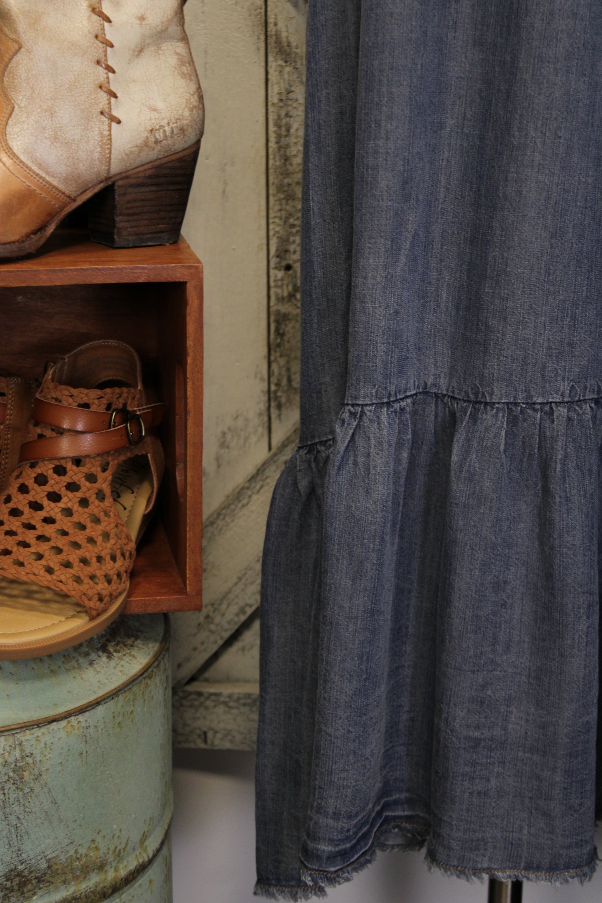 Introducing the Relaxed Days Denim Dress- This washed denim maxi dress is an easy, throw-on favorite with relaxed boho charm. Designed with a soft drape and lightweight feel, it features a flattering scoop neckline, flutter sleeves, and subtle seam detailing across the bodice for added texture. The flowy silhouette finishes with a tiered hem that moves beautifully with every step. Comfortable, effortless, and endlessly versatile, this denim maxi pairs perfectly with boots or sandals for everyday styling.