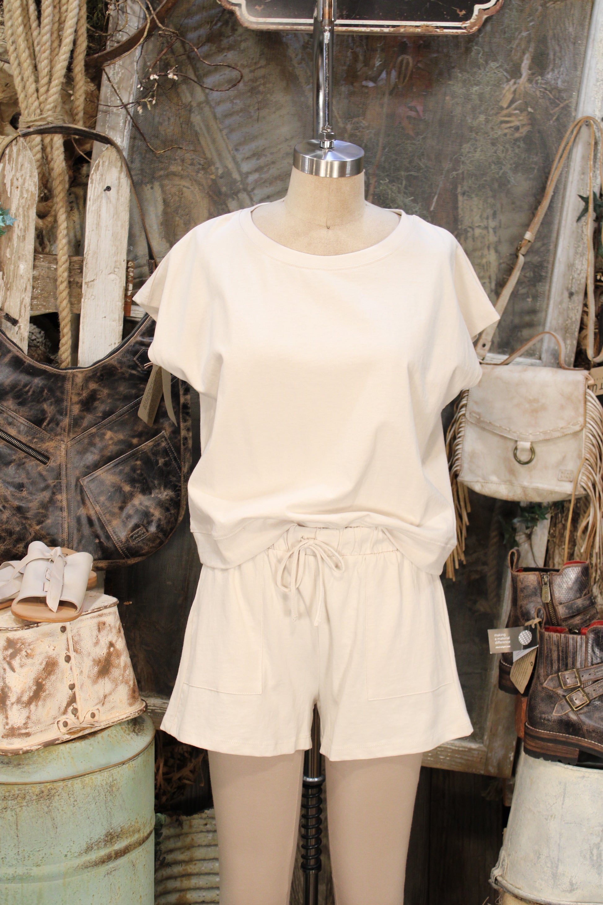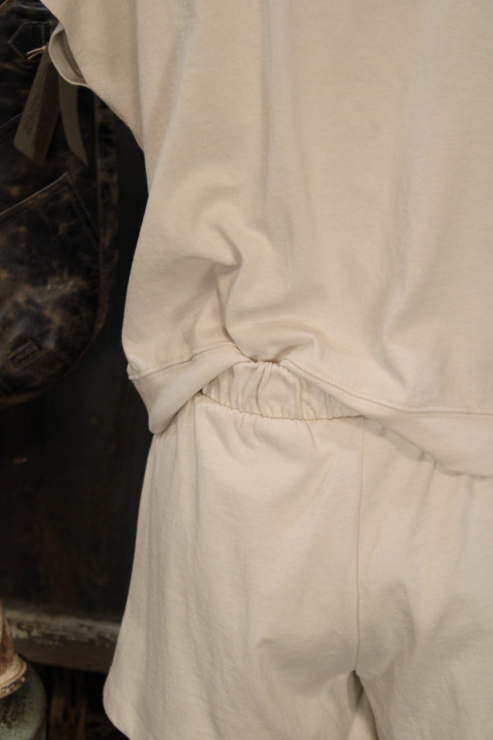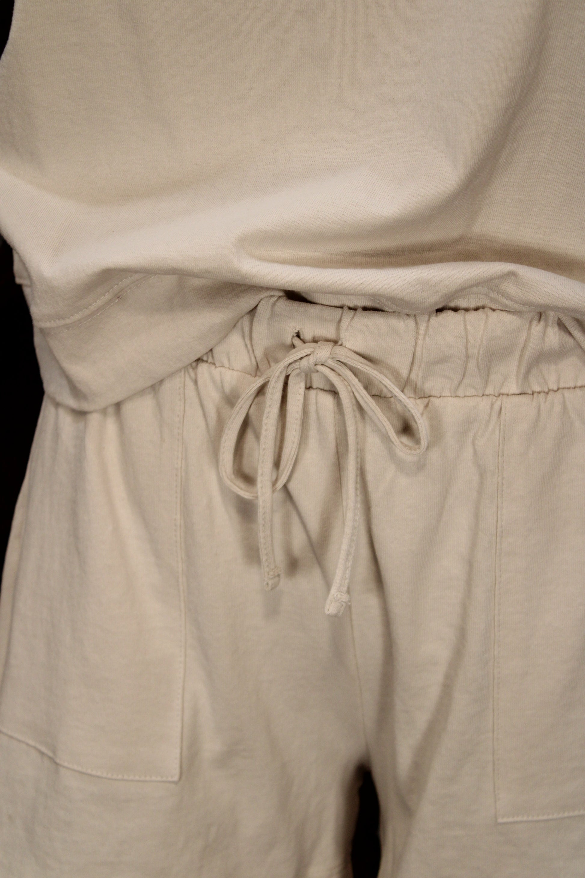 Introducing our Relaxed Rhythm Cotton Sand Beige Lounge Set, Soft, simple, and made for everyday comfort, this neutral lounge set is the definition of effortless style. The relaxed short sleeve top pairs perfectly with the matching drawstring shorts, featuring an easy elastic waistband and front pockets for a laid-back fit you’ll reach for again and again. The lightweight fabric feels smooth and breathable, making it ideal for lounging at home, running errands, or styling with sandals for a casual day out. A versatile matching set that blends comfort and clean, minimal style in one easy outfit.
