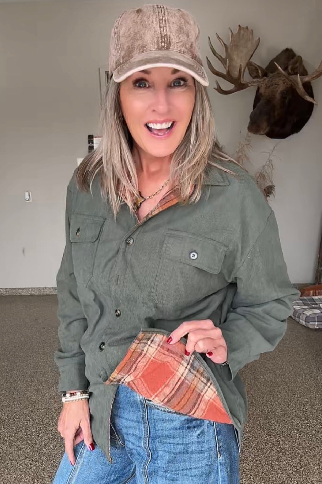Introducing the Reversible Rebel Corduroy Shacket - This Reversible Button Down is made for those who live in layers. One side features a soft, textured corduroy in earthy olive green for a clean, rugged feel. Flip it inside out to reveal a warm, autumn-hued plaid — the kind of cozy that belongs around campfires and golden-hour walks.